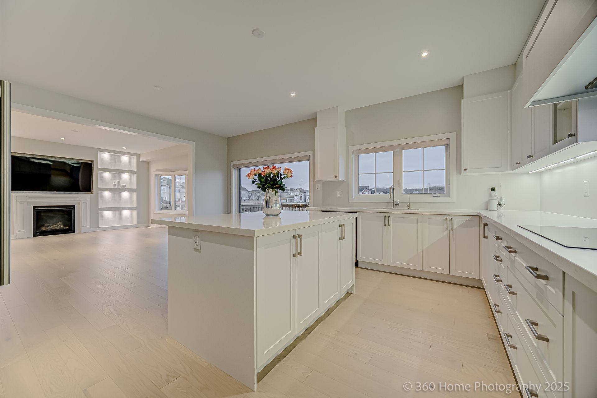 • Modern kitchen features white cabinets and quartz countertops.