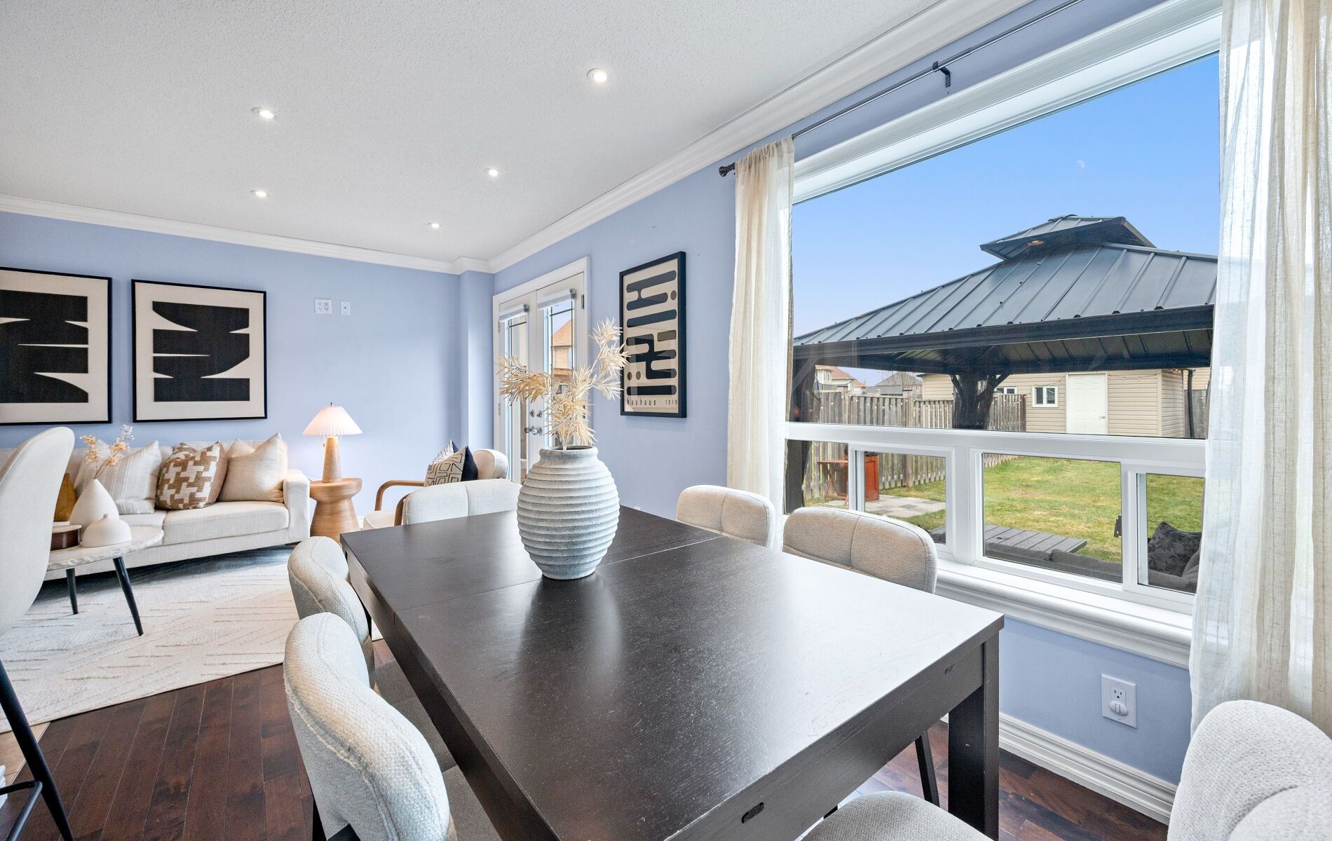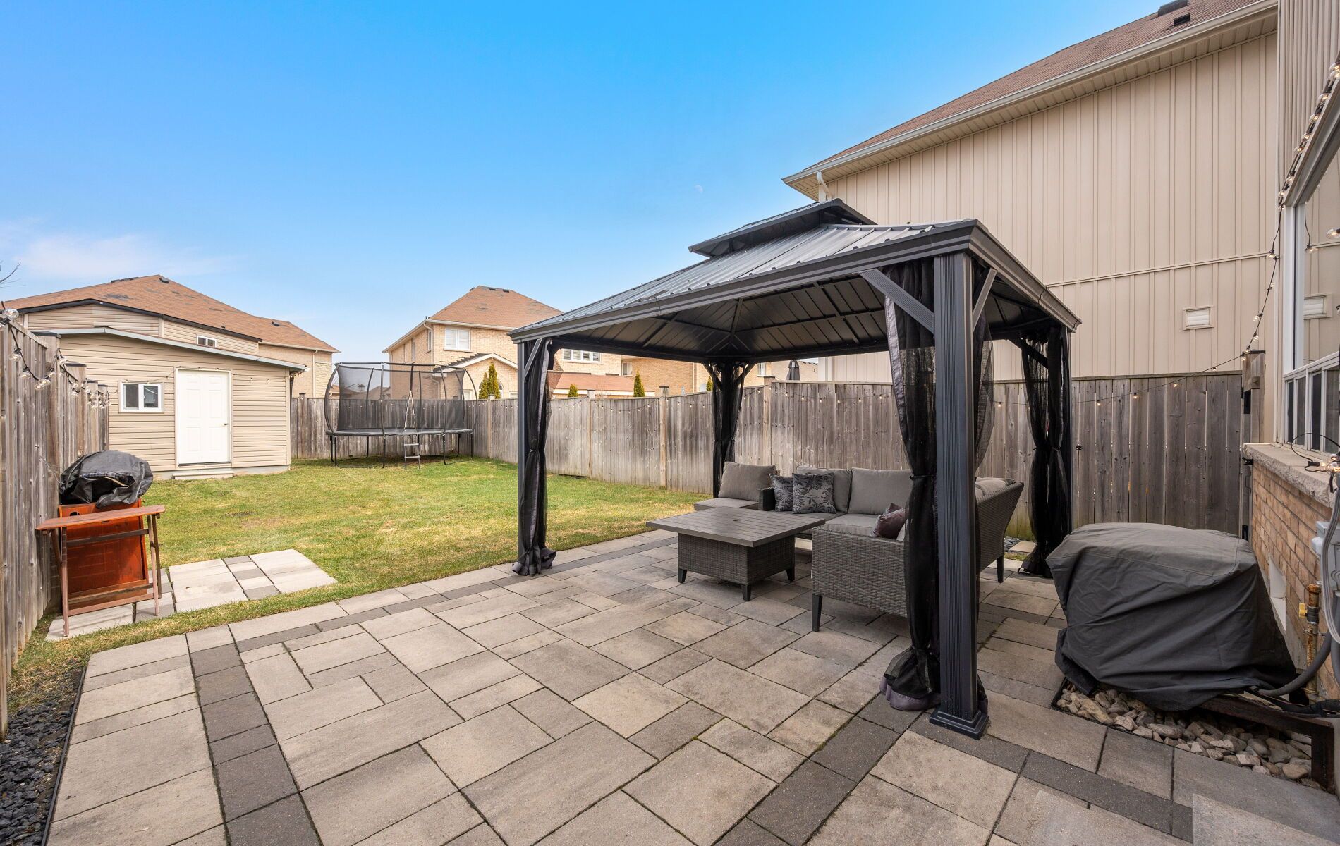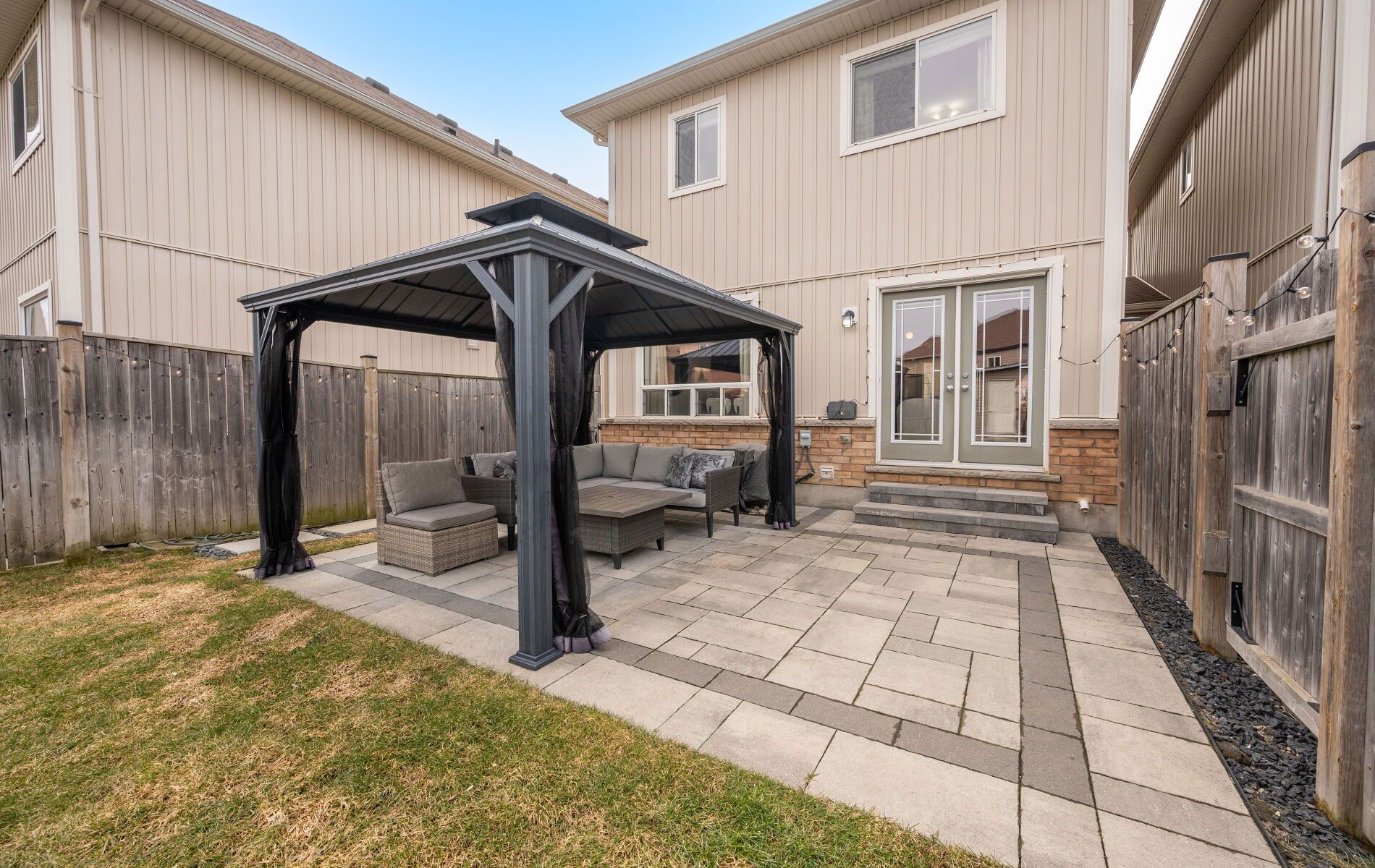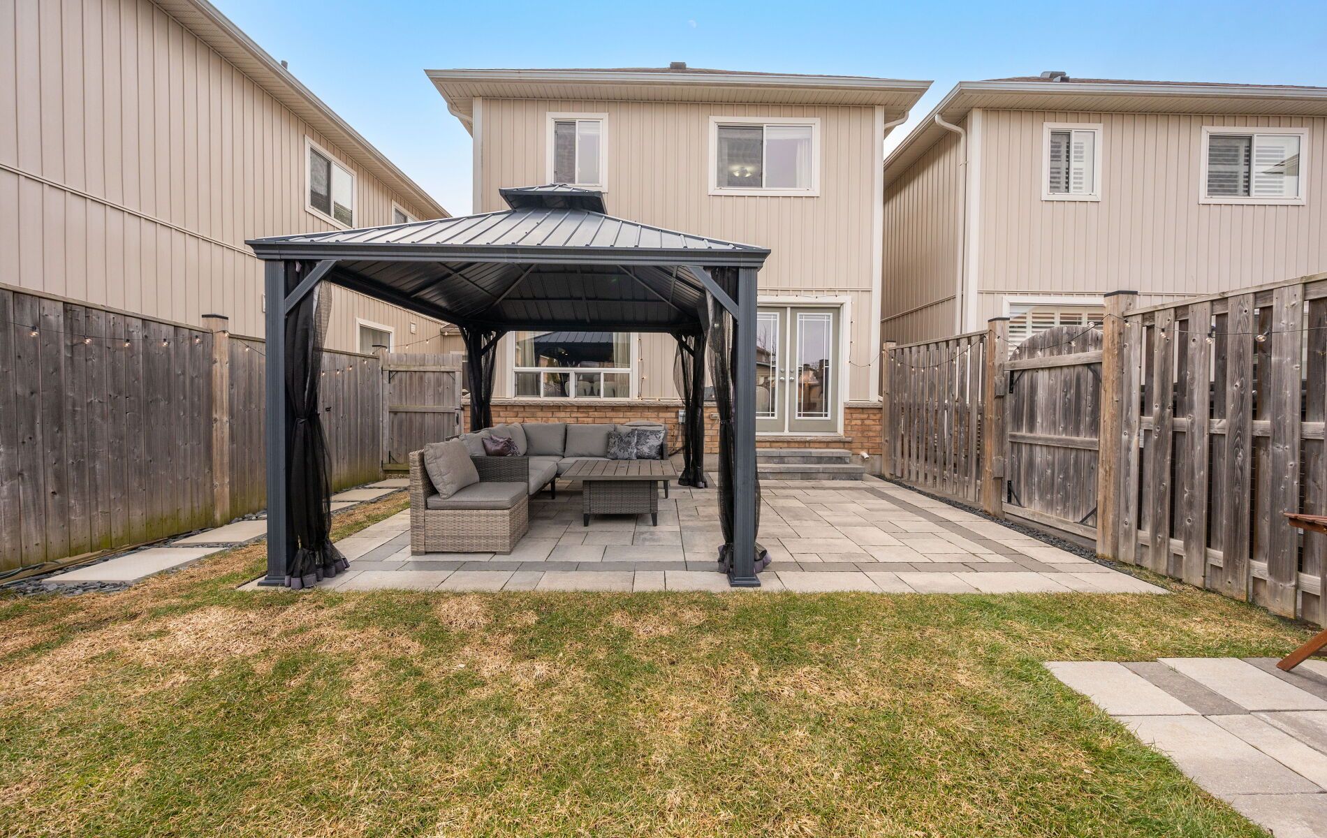 • Private backyard with new stone patio and metal gazebo.