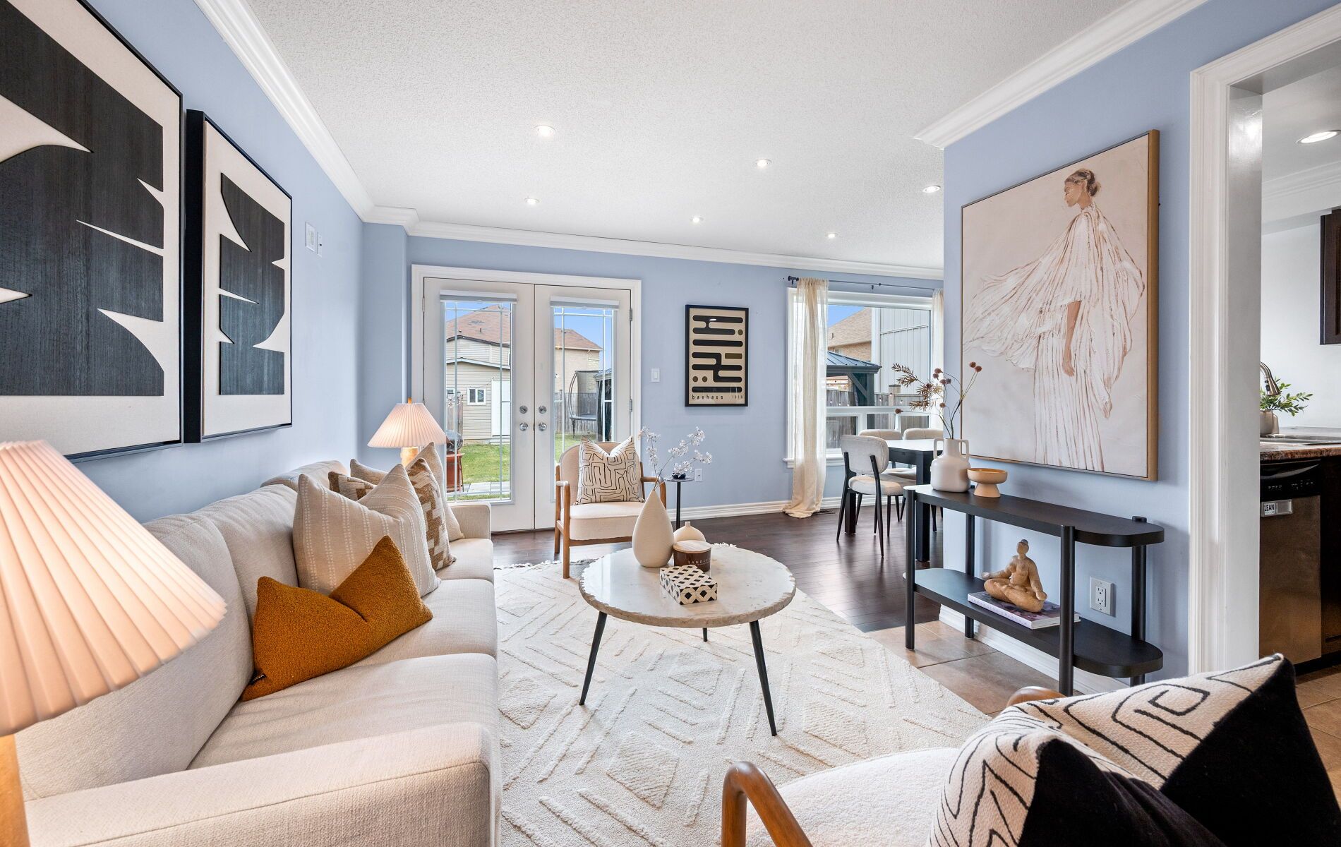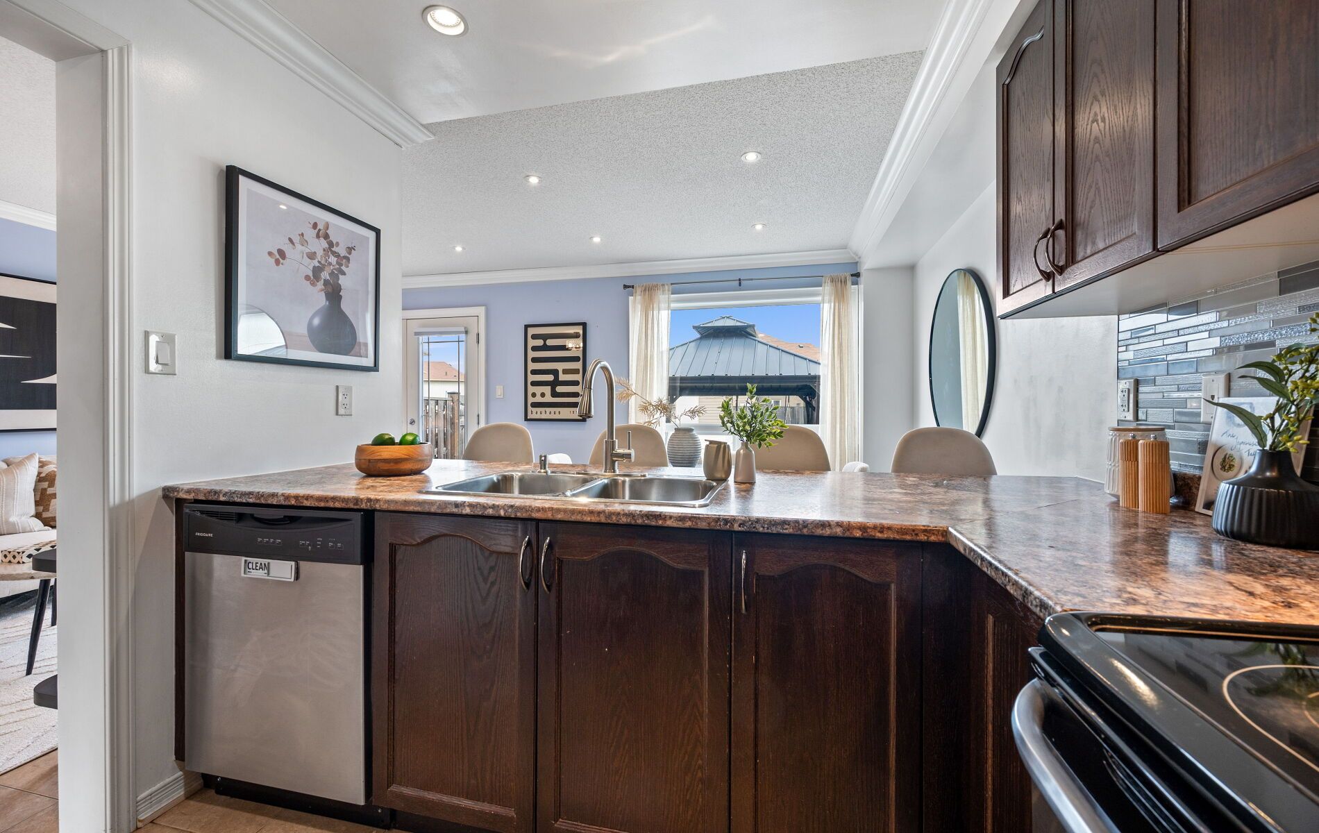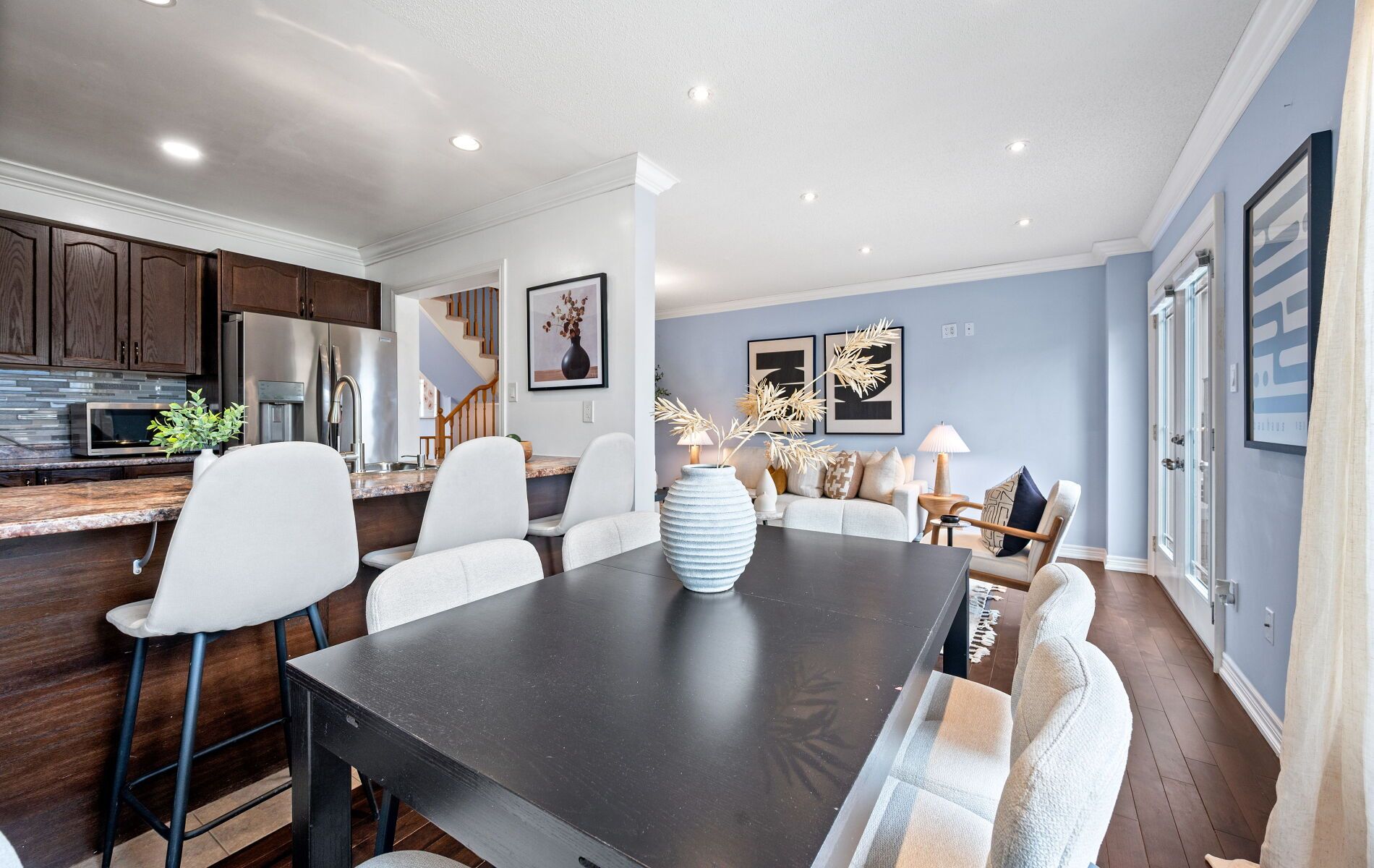 Beautiful bright 3 bedroom 4 bath family home turnkey and move-in ready. Welcome to this spacious and immaculately maintained home perfectly situated in a family friendly neighbourhood ideal for families seeking comfort convenience and style. Step into the oversized foyer with a large closet and entry to a spotless garage. The bright open concept main floor features a large kitchen with stainless steel appliances, backsplash, double sink, wood cabinets and a 4 seater breakfast bar overlooking the dining area with a sunny picture window. Pot-lights and crown moulding flow throughout leading to a comfortable living room with double doors opening to the fully fenced backyard. A powder room adds extra convenience for guests on this floor. Upstairs the oversized primary bedroom boasts a walk-in closet and ensuite accompanied by two additional bright and spacious bedrooms. The home features 3 full bathrooms in total ensuring comfort for the whole family. The professionally finished basement ('21) with laminate flooring and pot-lights offers flexibility for work-from-home space in-law suite or recreational area complete with a full bathroom & separate room. Entertain with ease in the backyard complete with a new stone patio ('22) installed metal gazebo large green space and shed with concrete floor ('22) perfect for summer bbqs and family gatherings. This well-cared-for turnkey home also features maintained hvac systems giving peace of mind and move-in readiness. Enjoy quick access to the grand river nearby parks major highways laurier and conestoga restaurants and shops. A perfect blend of functionality style and family-friendly living this home is ready for you.