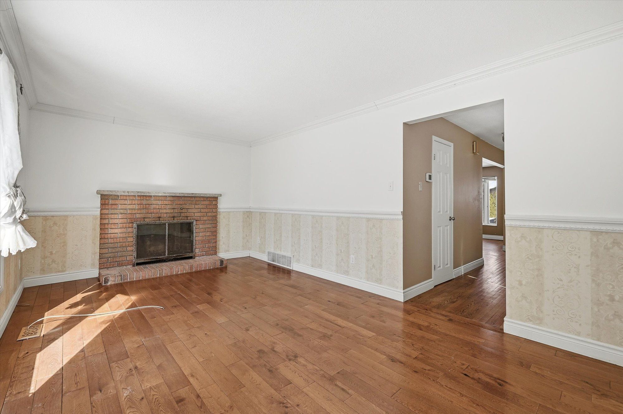 • Sun-filled living room features a cozy wood-burning fireplace.