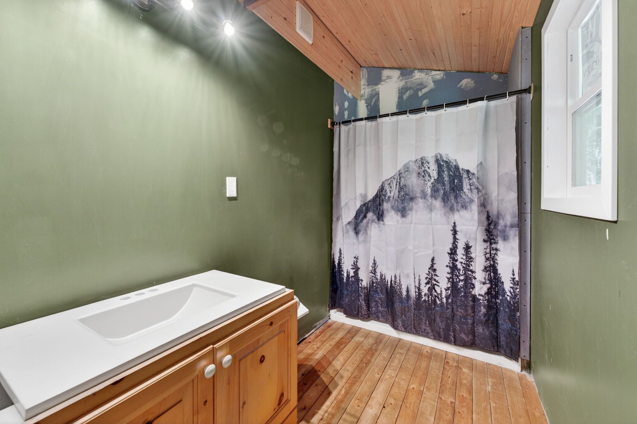 • Large picture window in the living room offers serene lake views.
