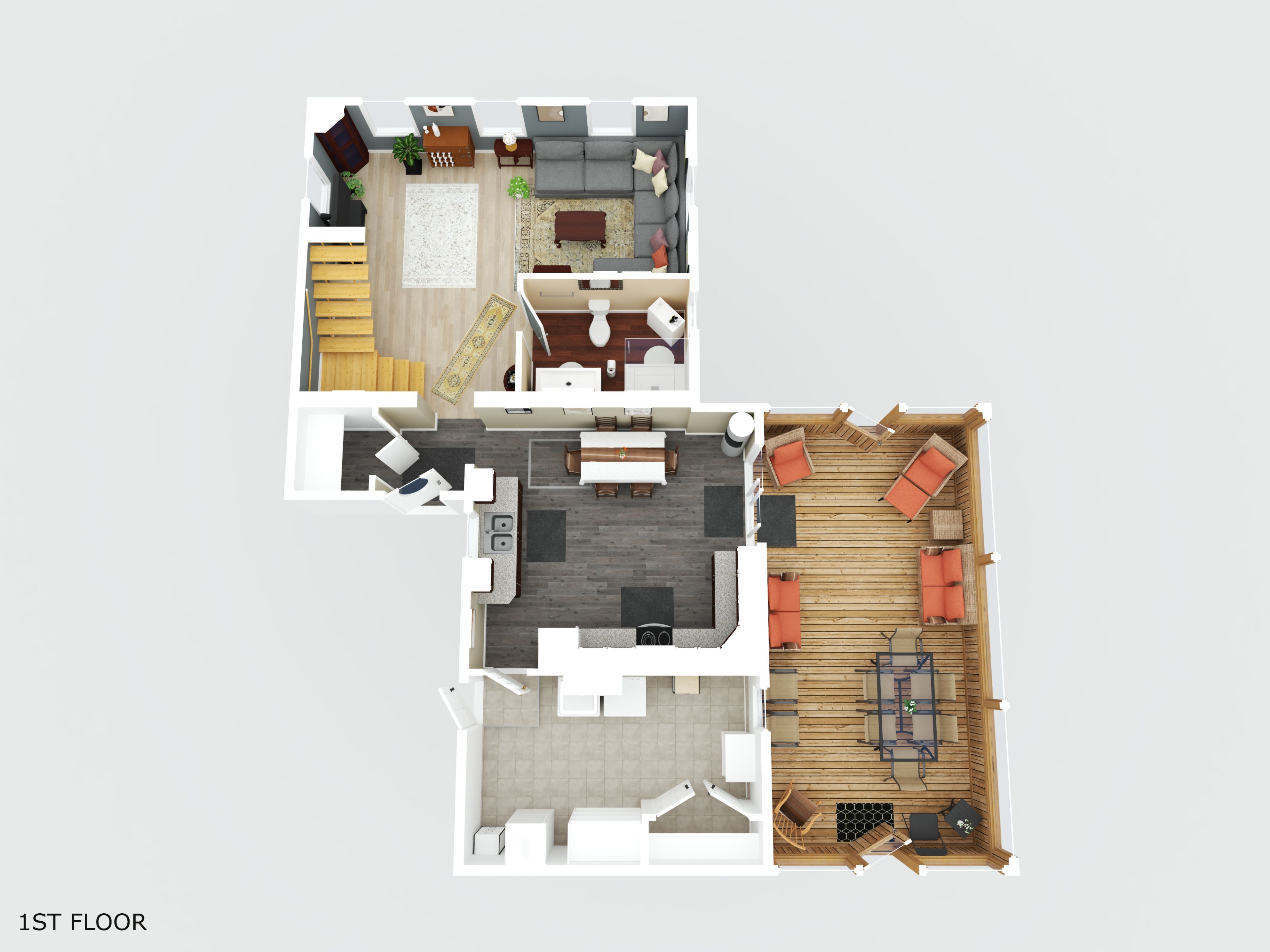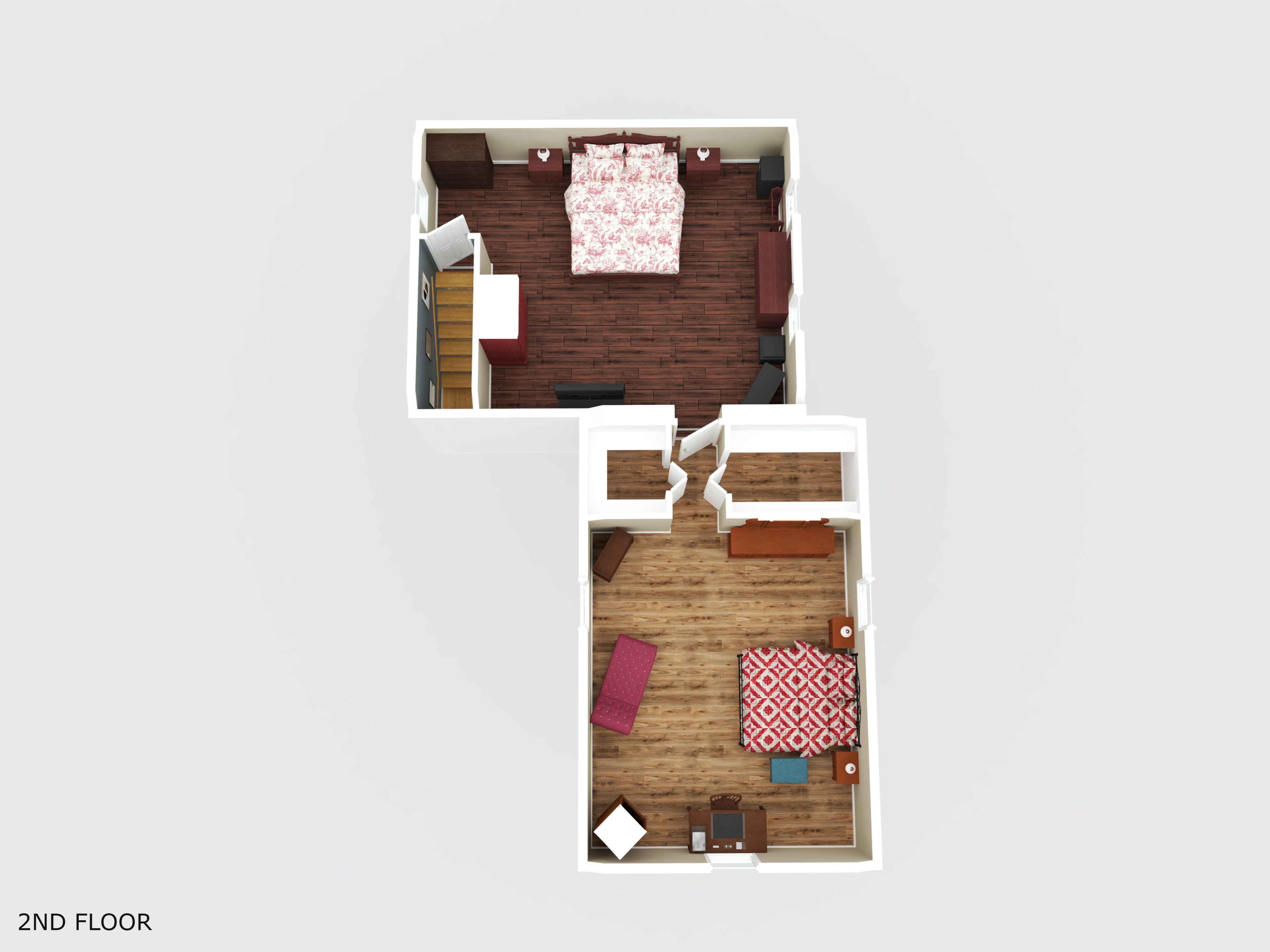 • Versatile second floor easily converts to two enclosed bedrooms.