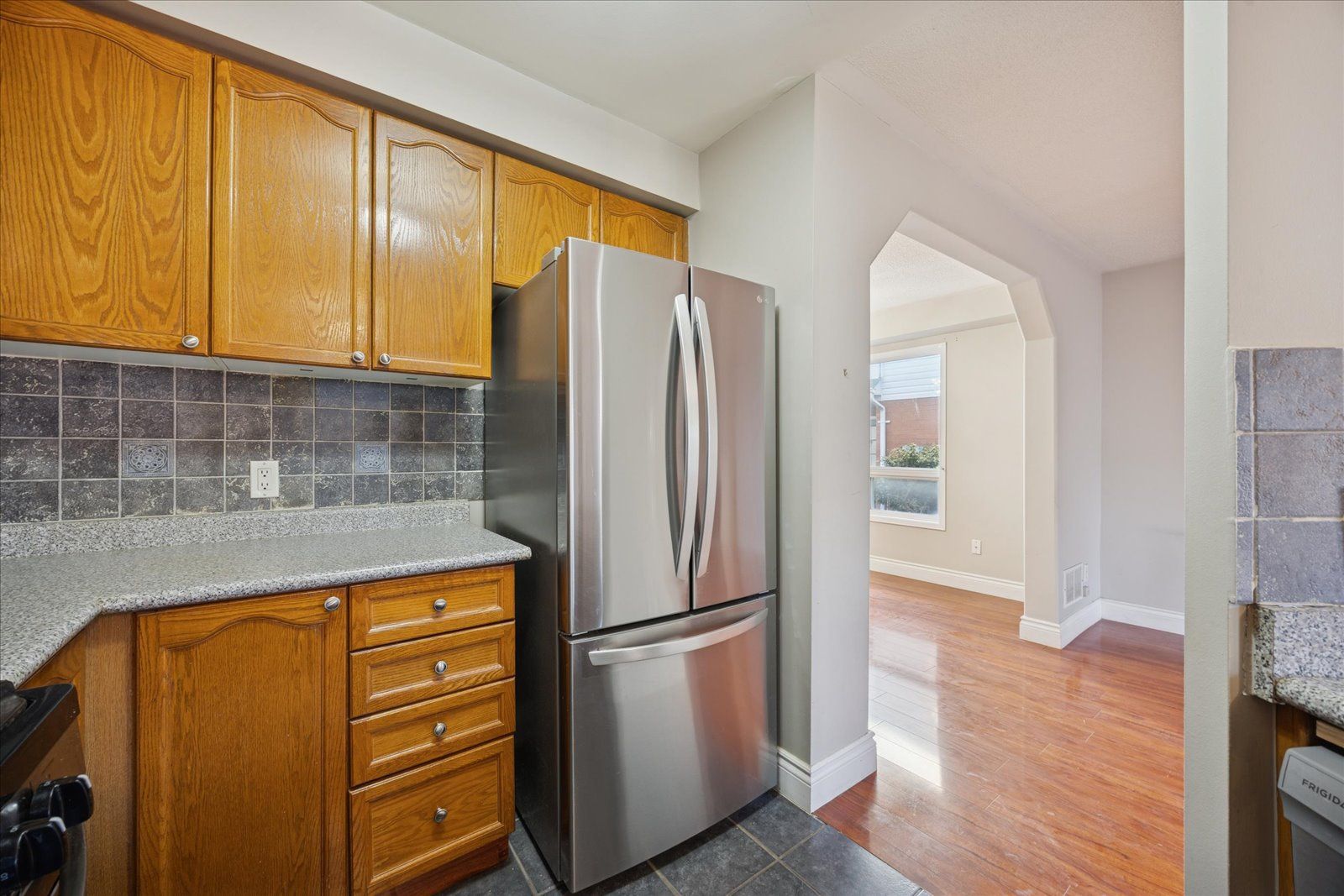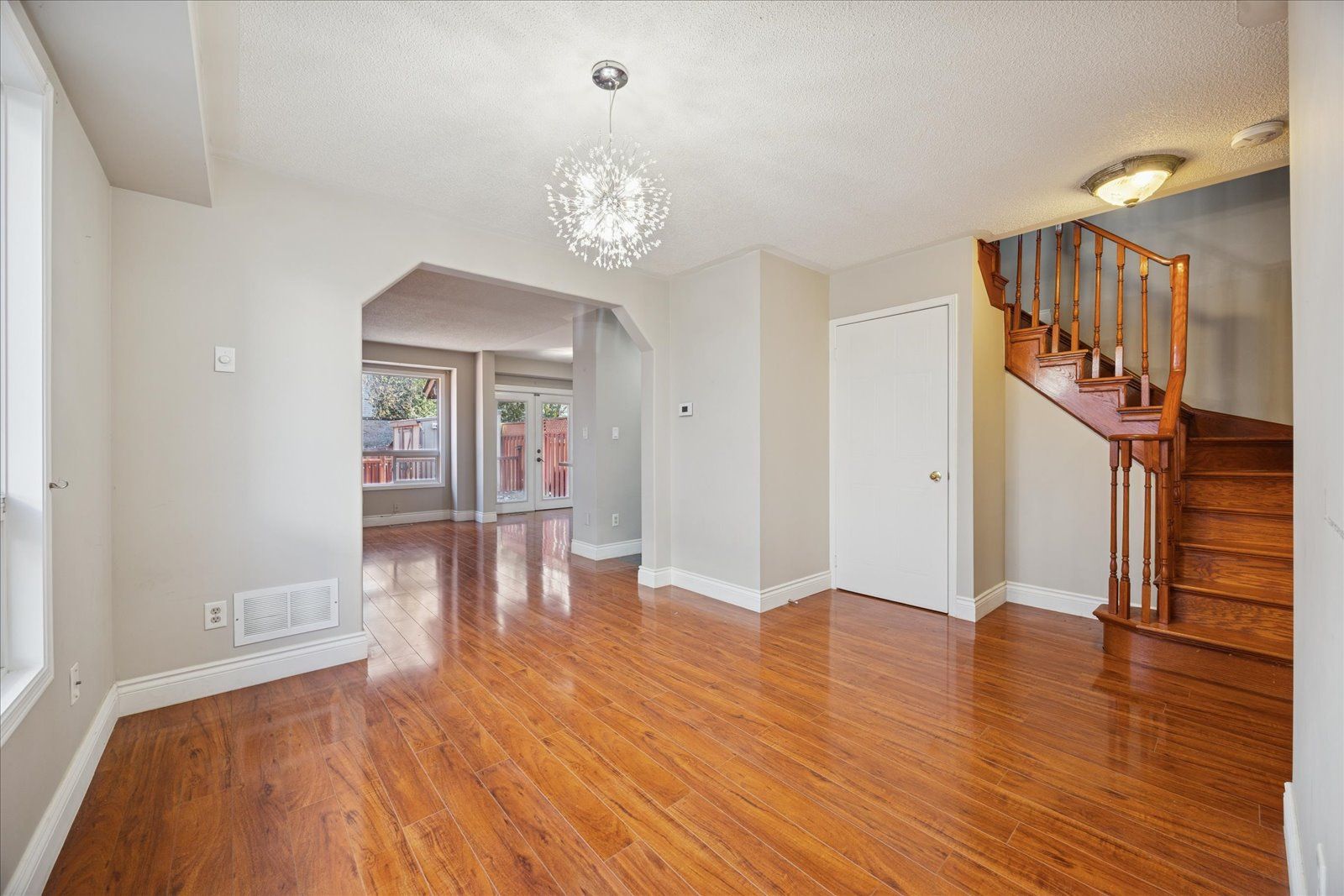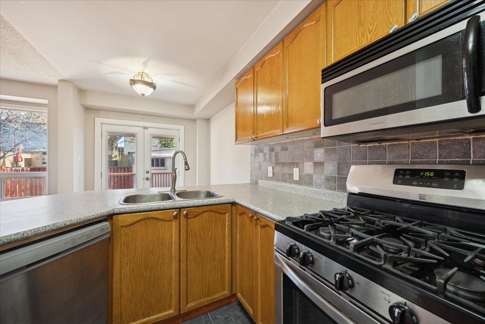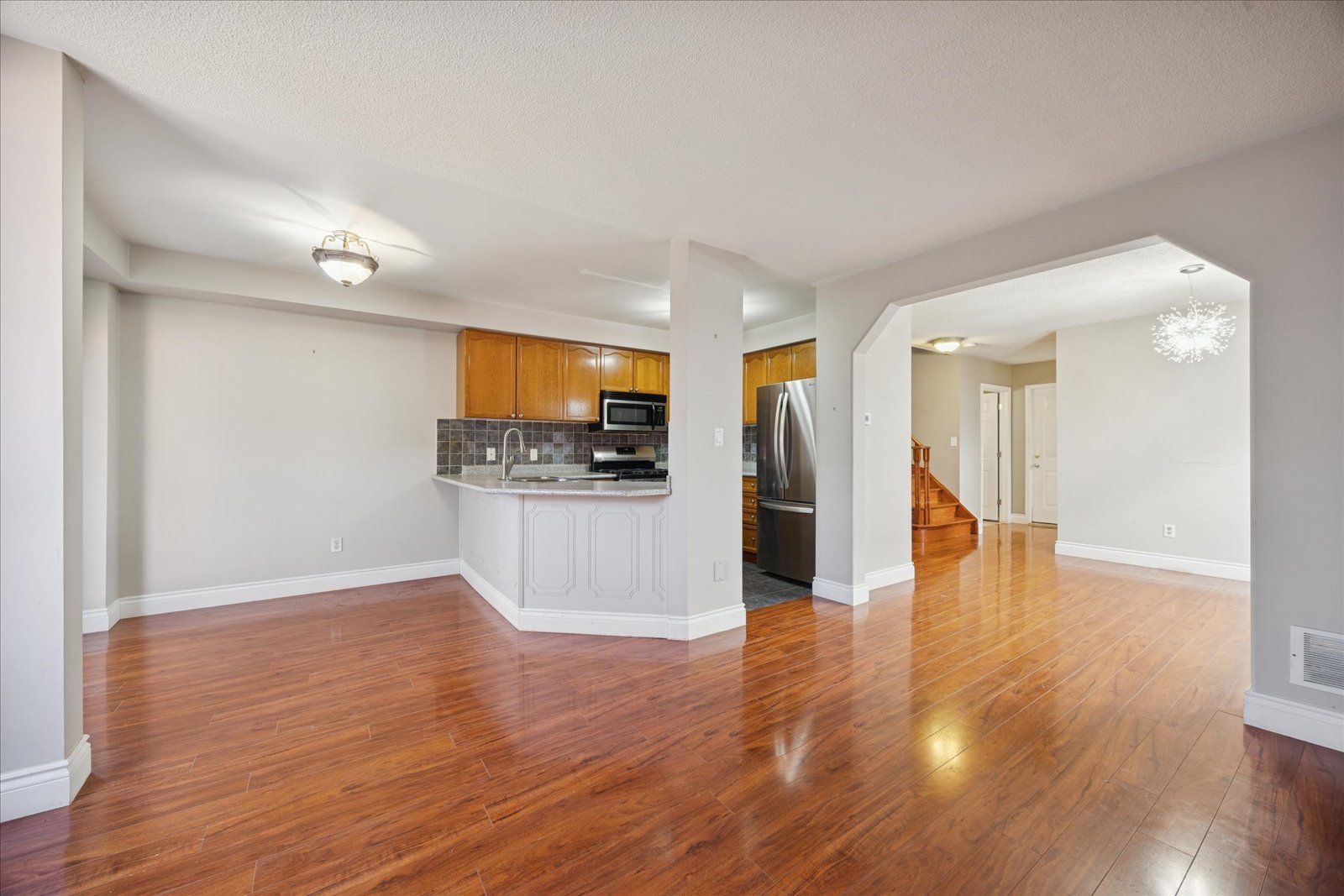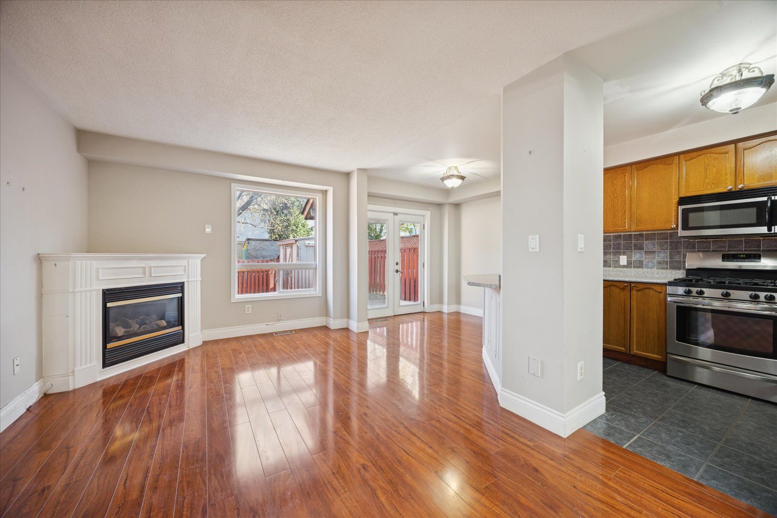 Totally upgraded, immaculate open concept end unit townhome, located on a quiet street in a sought after area. Strip hardwood floors & ceramics on main & second floors. Hardwood staircase. Large living room with floor to ceiling windows & spacious dining room. Large eat-in kitchen with breakfast area open to the main floor family room french doors walk-out to deck overlooking the private fully fenced garden. Master bedroom has a 4 piece en-suite and walk-in closet. The finished basement has a rec room, bedroom, 2 piece bathroom, laundry, storage and broadloom. Entrance to the house from the garage. Close to schools, stores & transportation. ***a beautiful home not to be missed***
