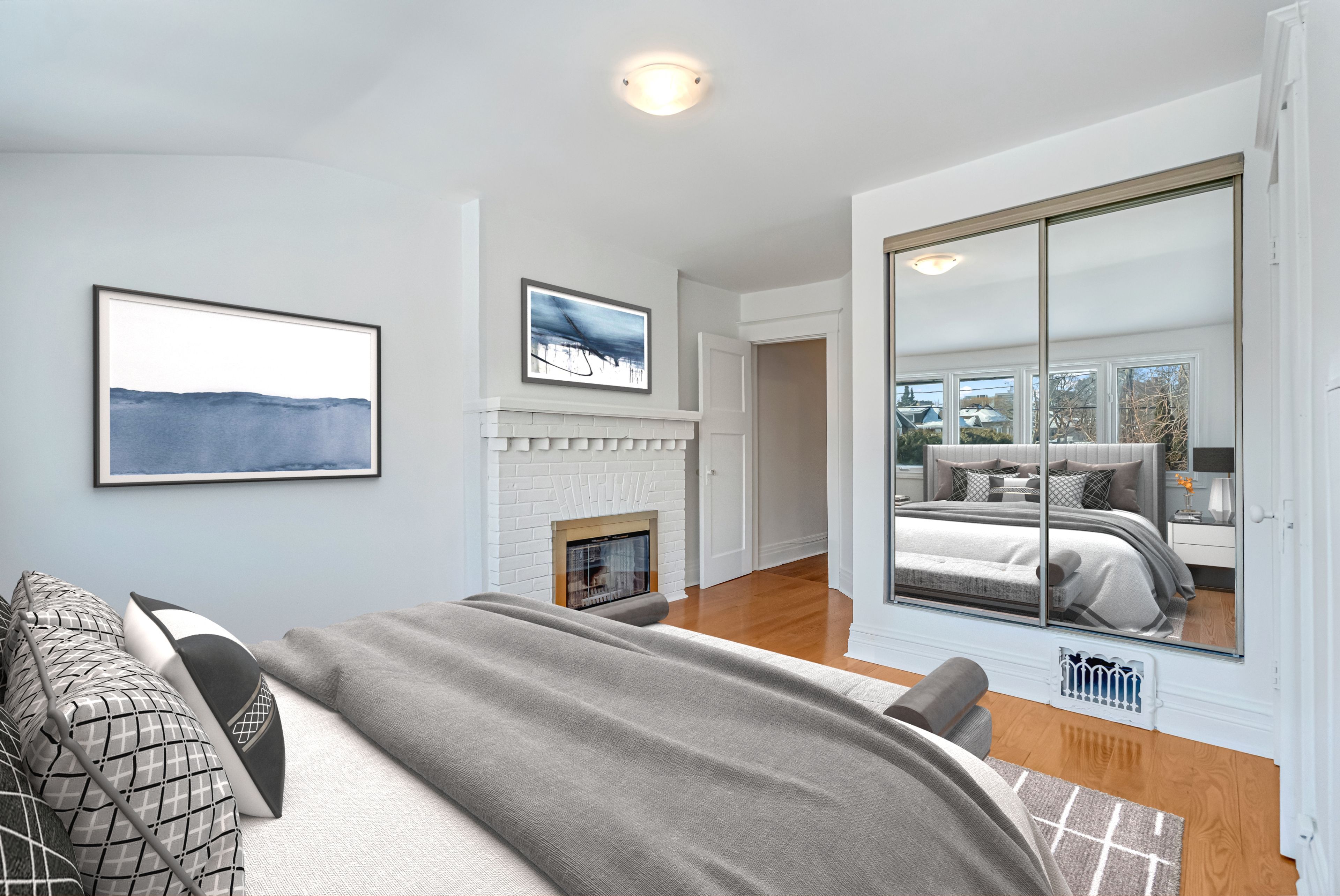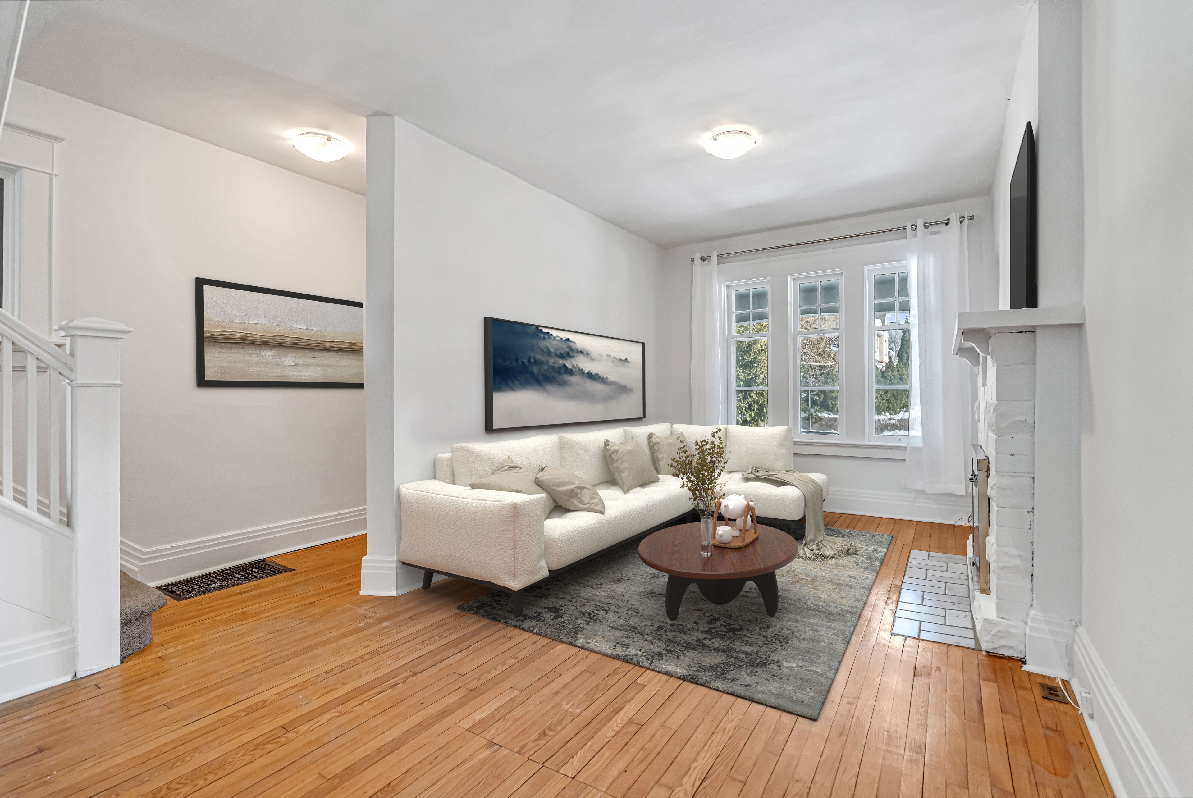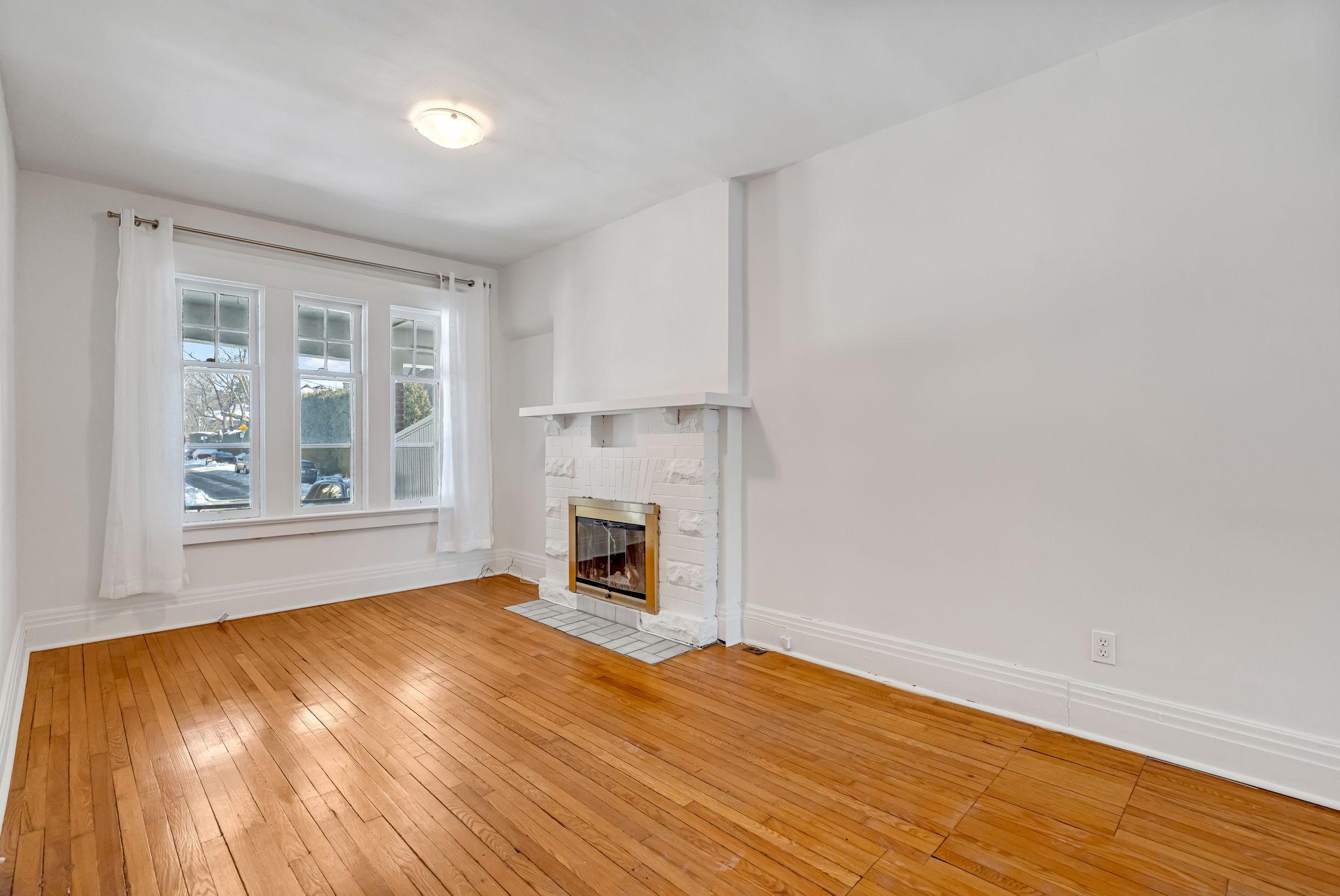 • Spacious living room with beautiful morning light and a fireplace.