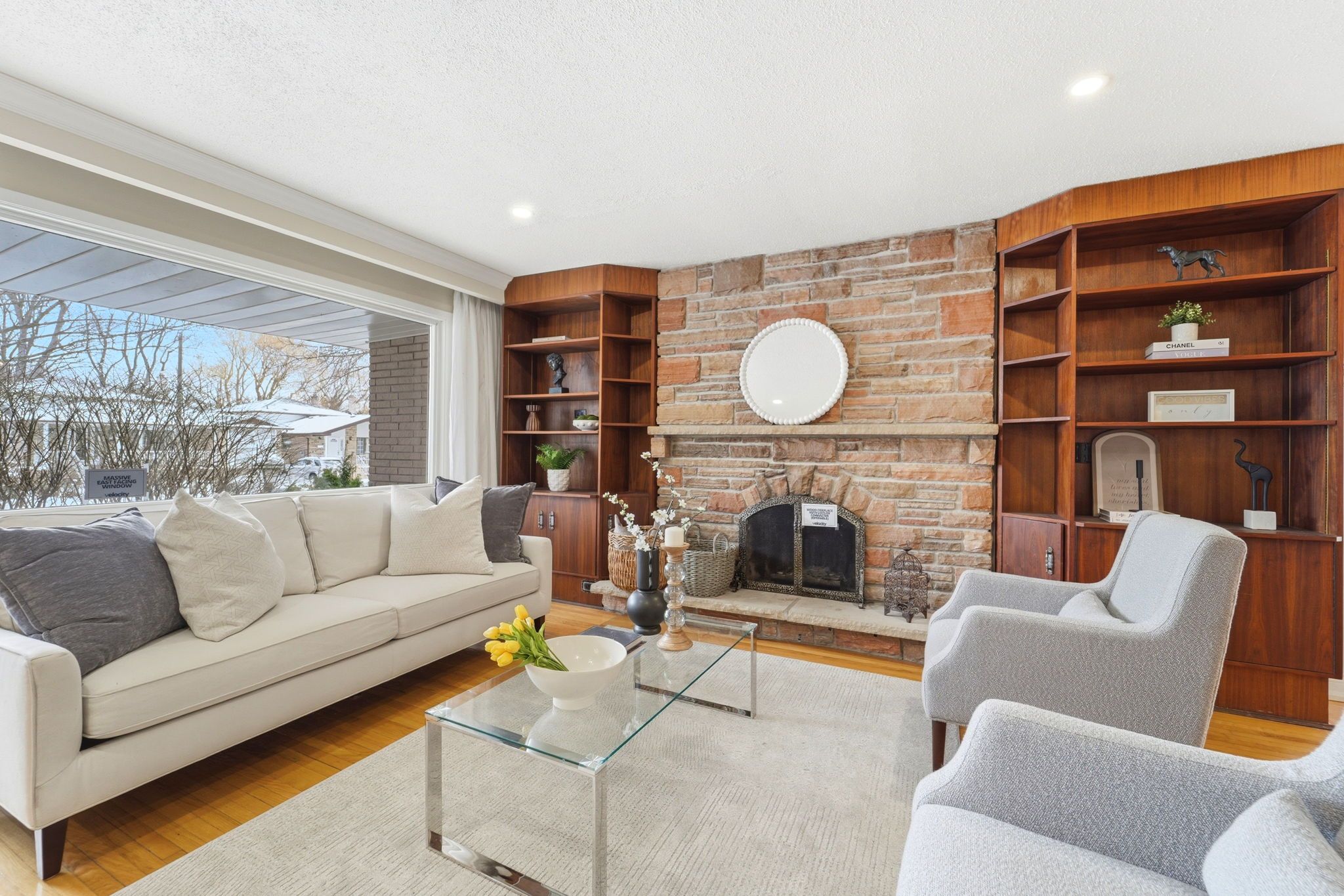 • Enormous family room features a cozy wood-burning stone fireplace.