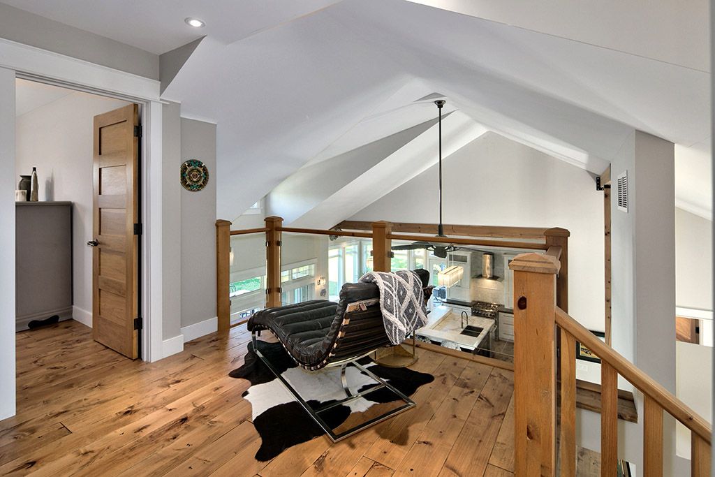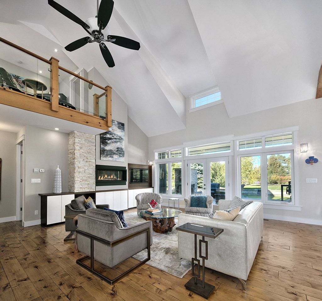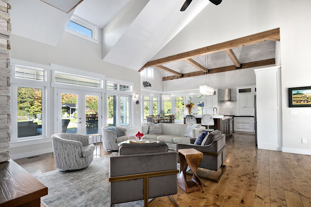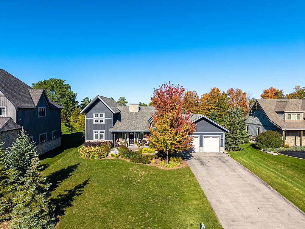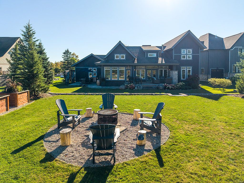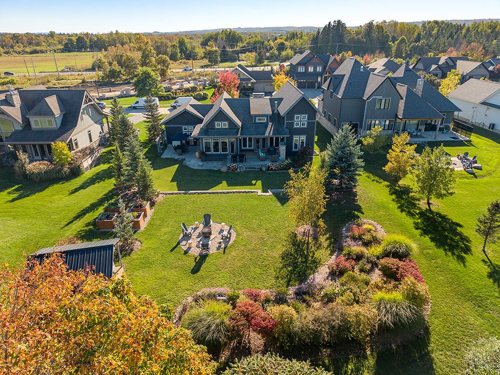 Welcome to 174 high bluff lane in the sought-after trailwoods neighbourhood on the edge of thornbury. This unique custom-built bungalow with loft blends contemporary style with rustic accents and offers over 3,600 sq. Ft. Of finished living space backing onto a protected ravine. From the moment you enter, you'll appreciate the craftsmanship and thoughtful details: 7" alder plank flooring, soaring vaulted ceilings, post and beam accents, shaker trim, and a grey-washed pine ceiling over the dining and kitchen. The open-concept great room impresses with custom cabinetry around a suspended linear gas fireplace, stone feature walls, and expansive windows that frame the professionally landscaped yard with slate patios and walkways, decking, gas outdoor fireplace, fire pit, and a garden shed with running water and hydro. The chefs kitchen boasts a massive waterfall island, upgraded appliances including a gas stove, custom cabinetry, under-cabinet lighting, and a walkout to the patio with a gas line for the bbq. The main floor primary retreat features a walk-in closet and a spa-inspired ensuite with glass shower, and custom built double vanity. An office, powder room, and laundry with built-ins complete the main level. Upstairs you'll find two more bedrooms, a full bath, and a loft overlooking the living space. The fully finished lower level offers two additional bedrooms, a full 3-pce bath, storage room which could easily be used as a home gym, and a spacious family room ideal for gatherings. With the georgian trail across the street, thornbury's shops, restaurants, harbour, and waterfront just a short walk or cycle away, and incredible skiing and golf just a short drive away, this property offers the perfect blend of modern luxury and four-season lifestyle.