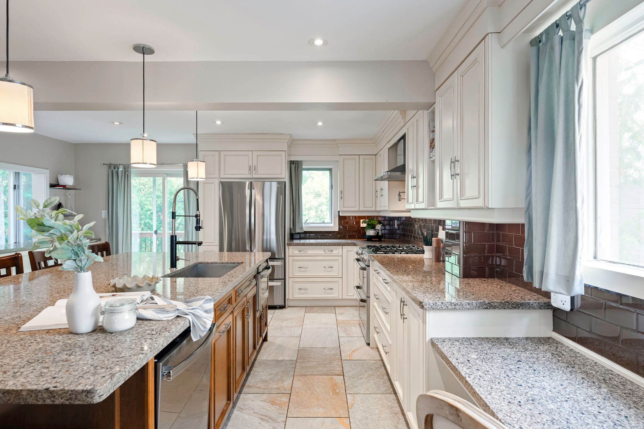 • Eat-in kitchen features a 9-ft island for family gatherings and meals.