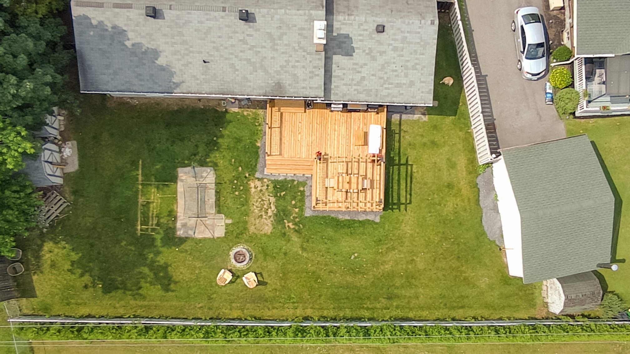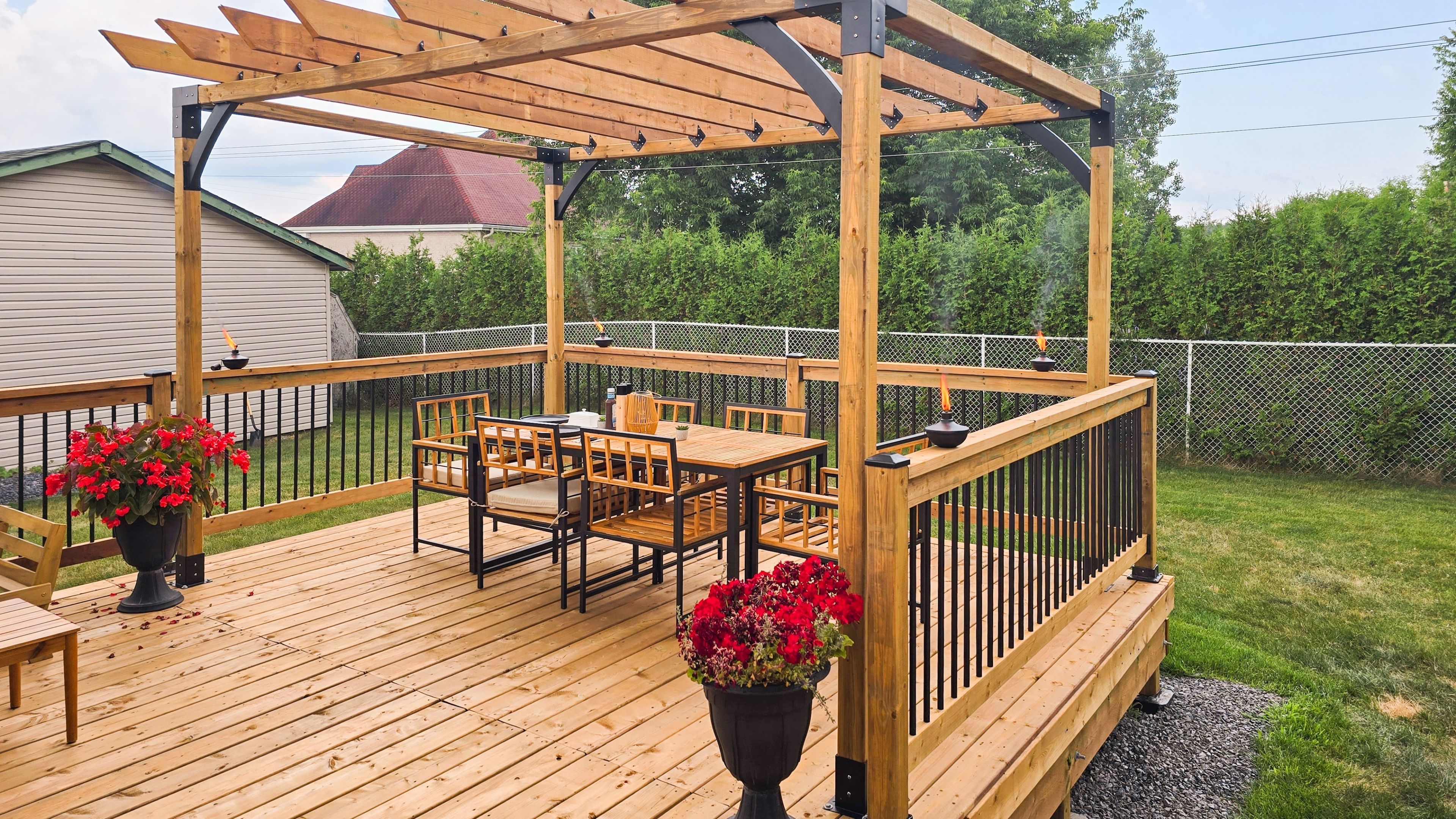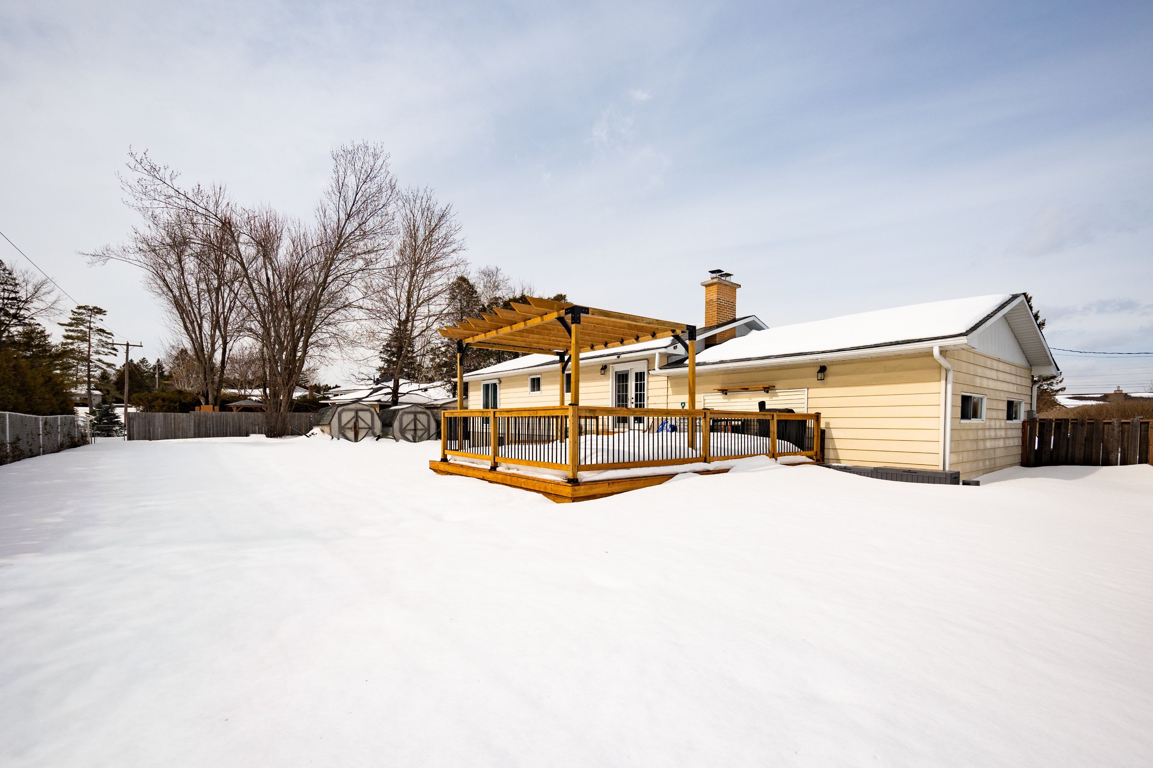 • Private outdoor space with a large deck, pergola, and fire pit.