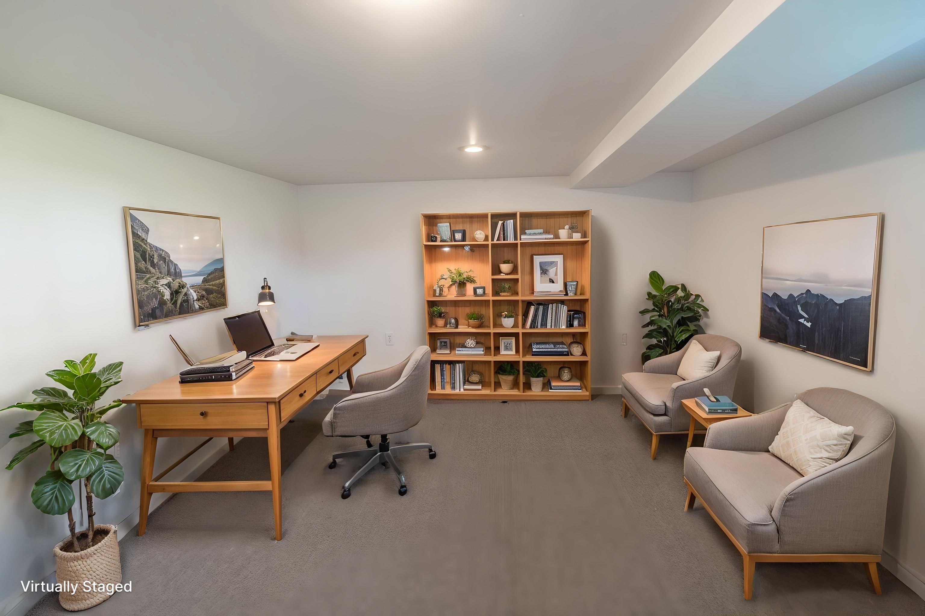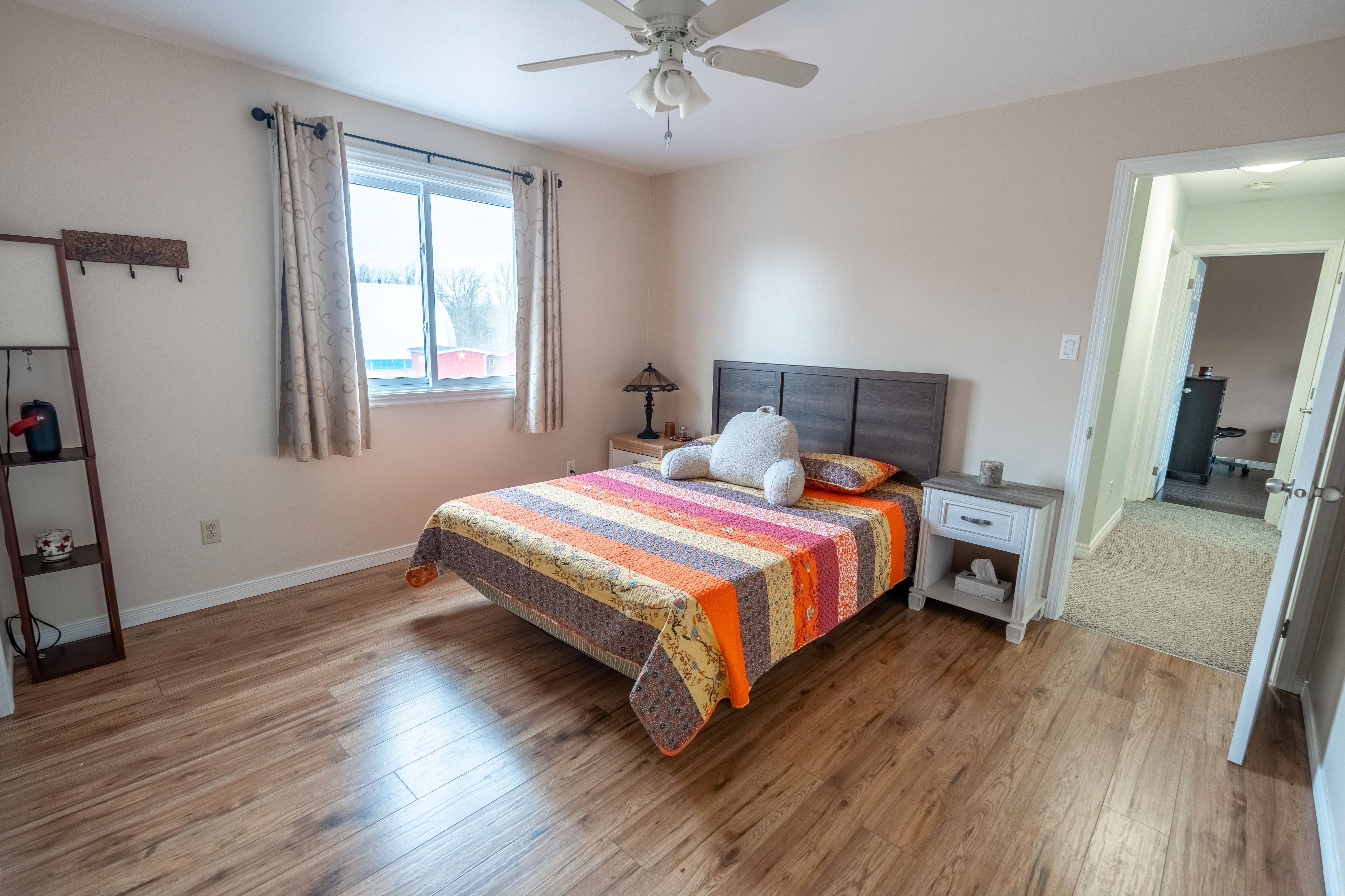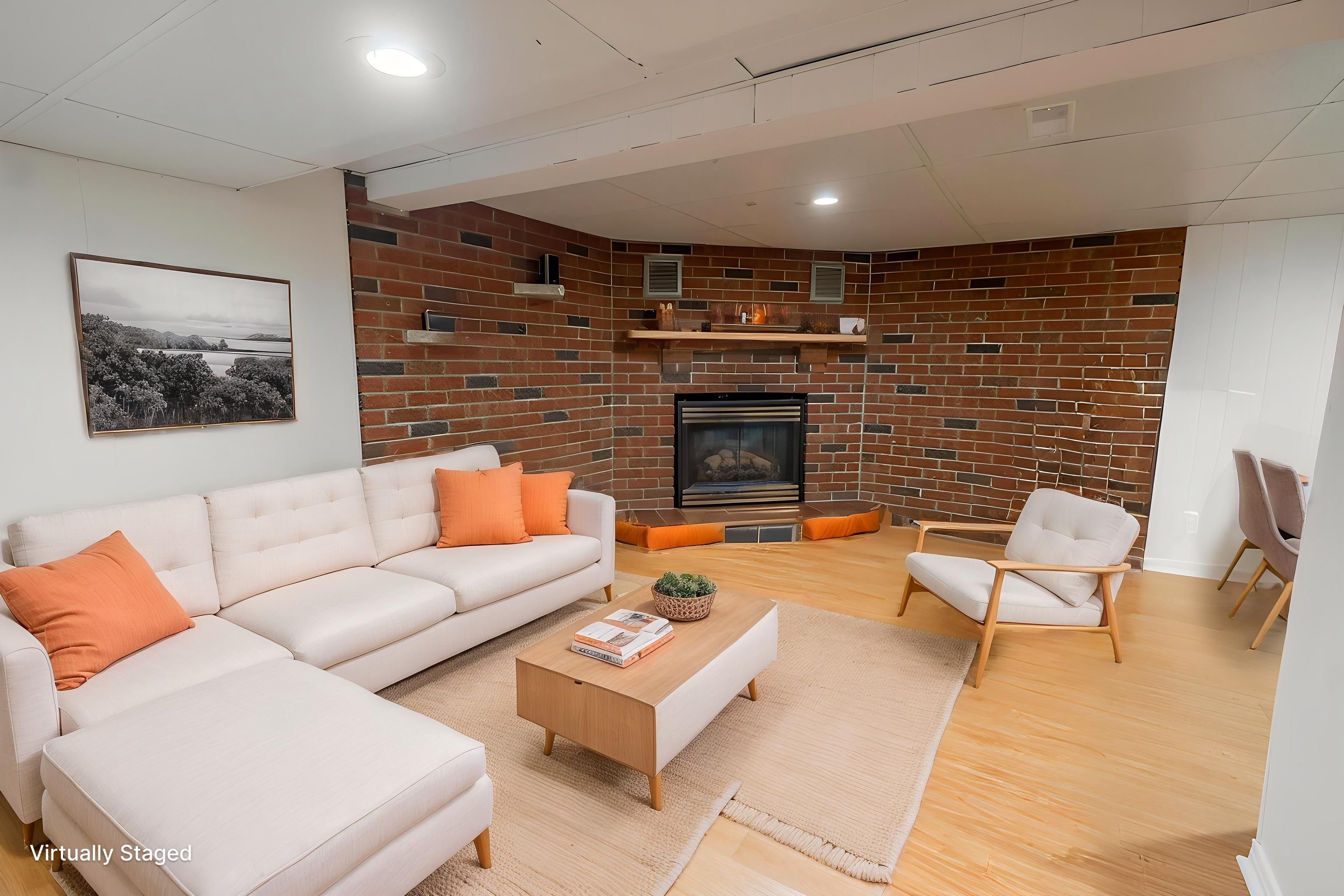 • Bright main living area with natural light and cozy fireplace.