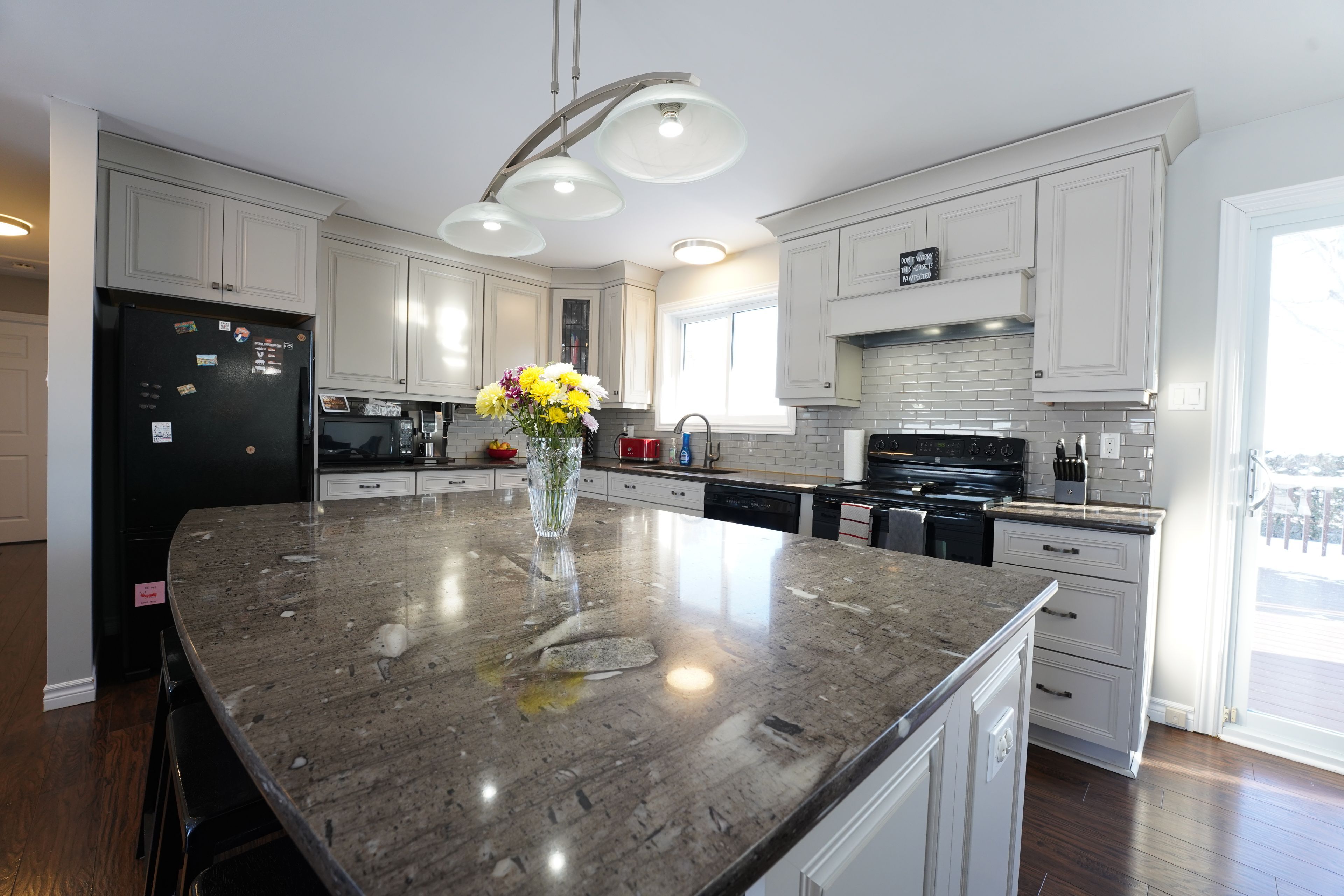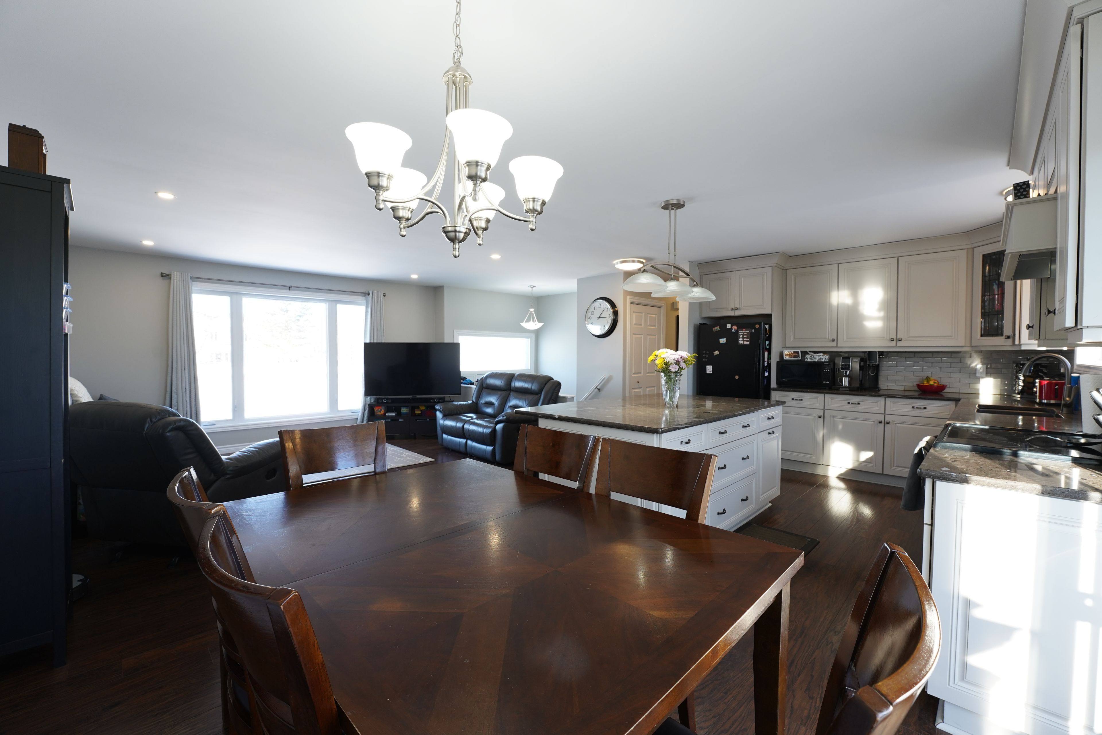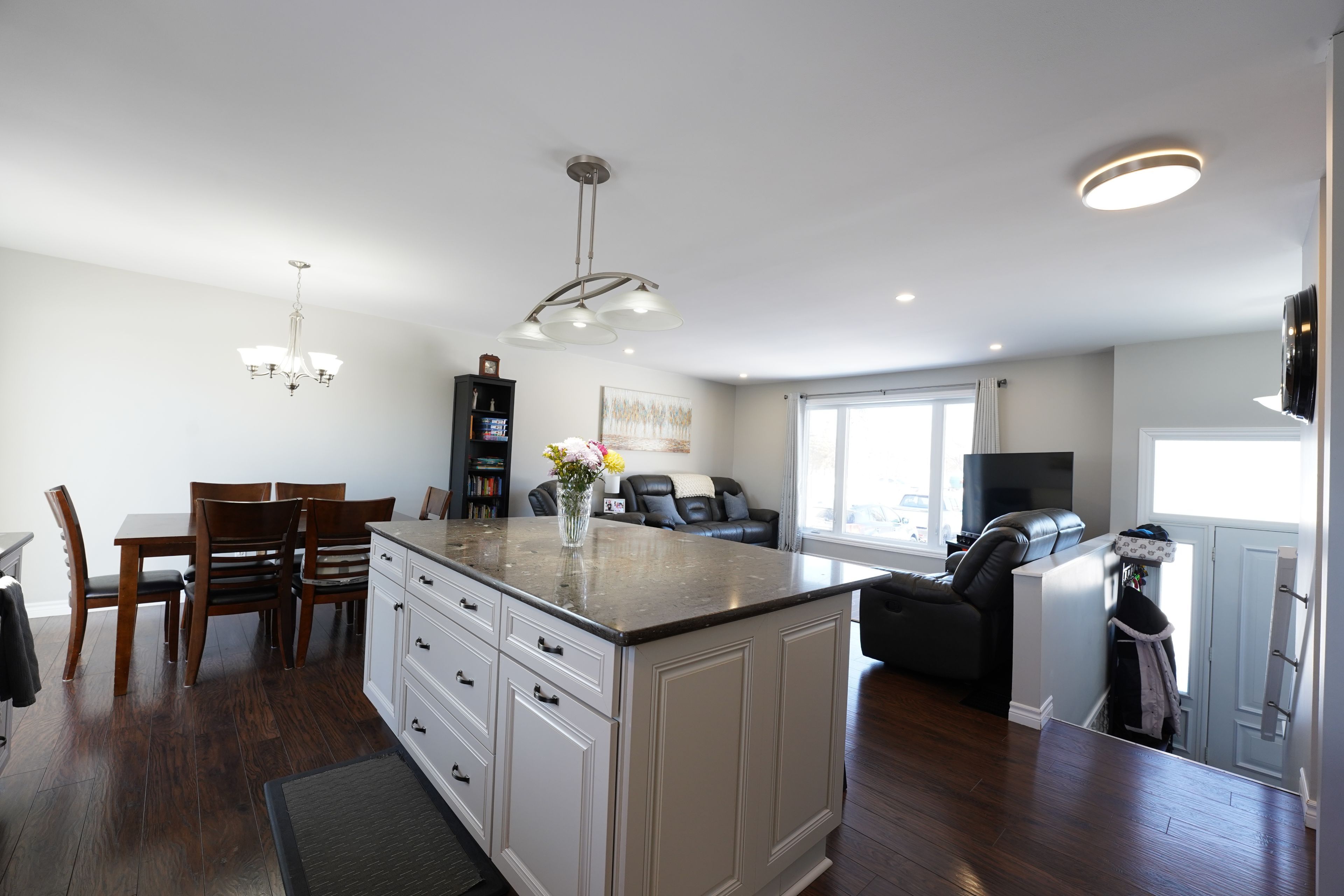 • Open-concept main level with a large kitchen and granite countertops.