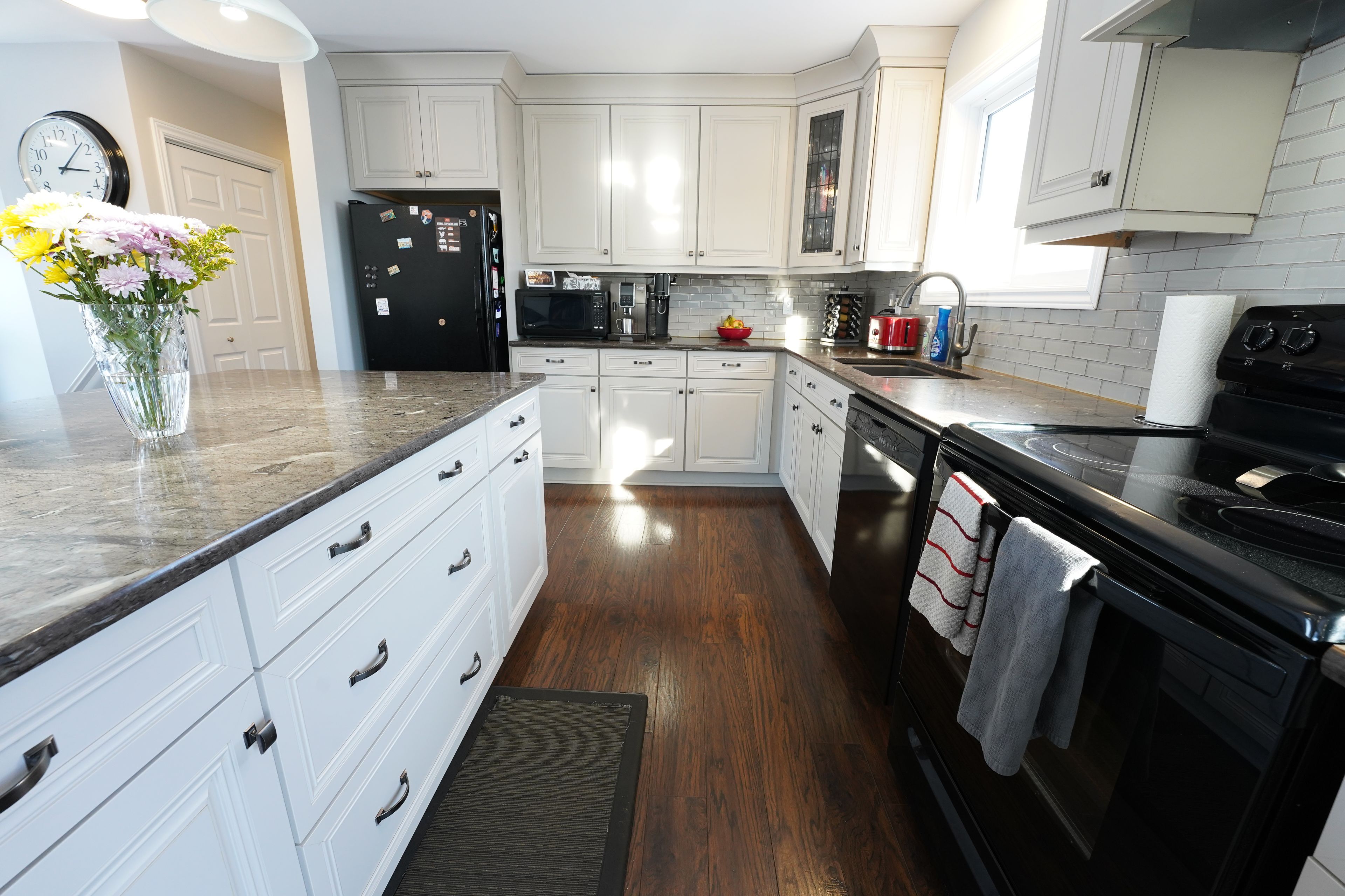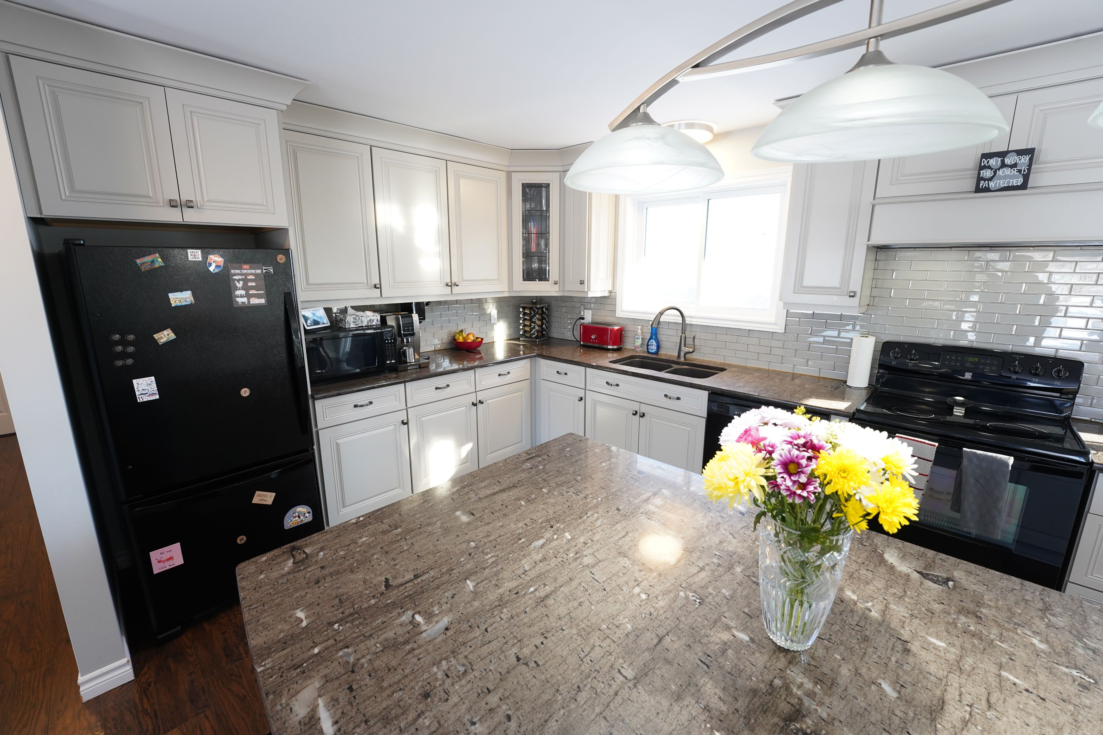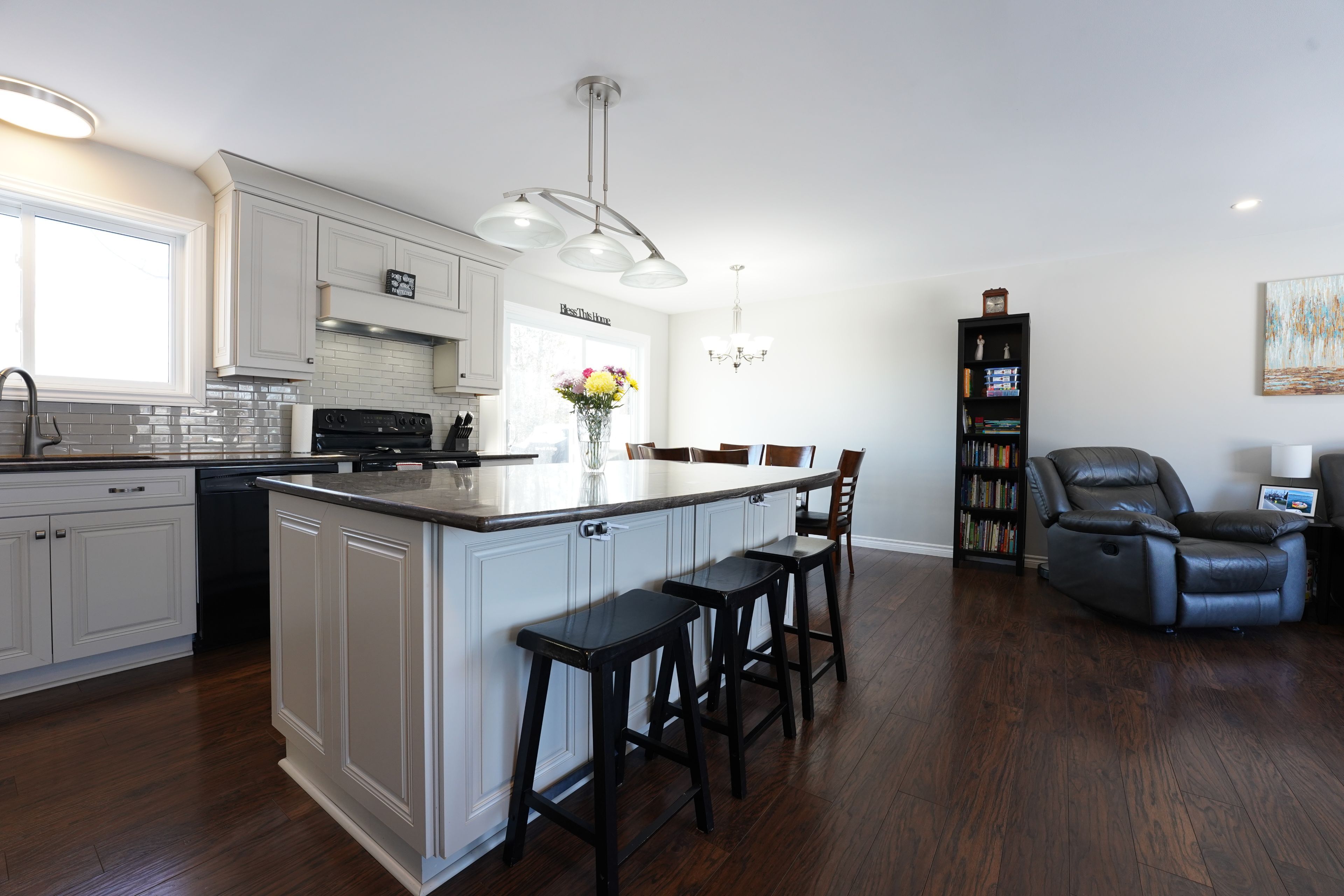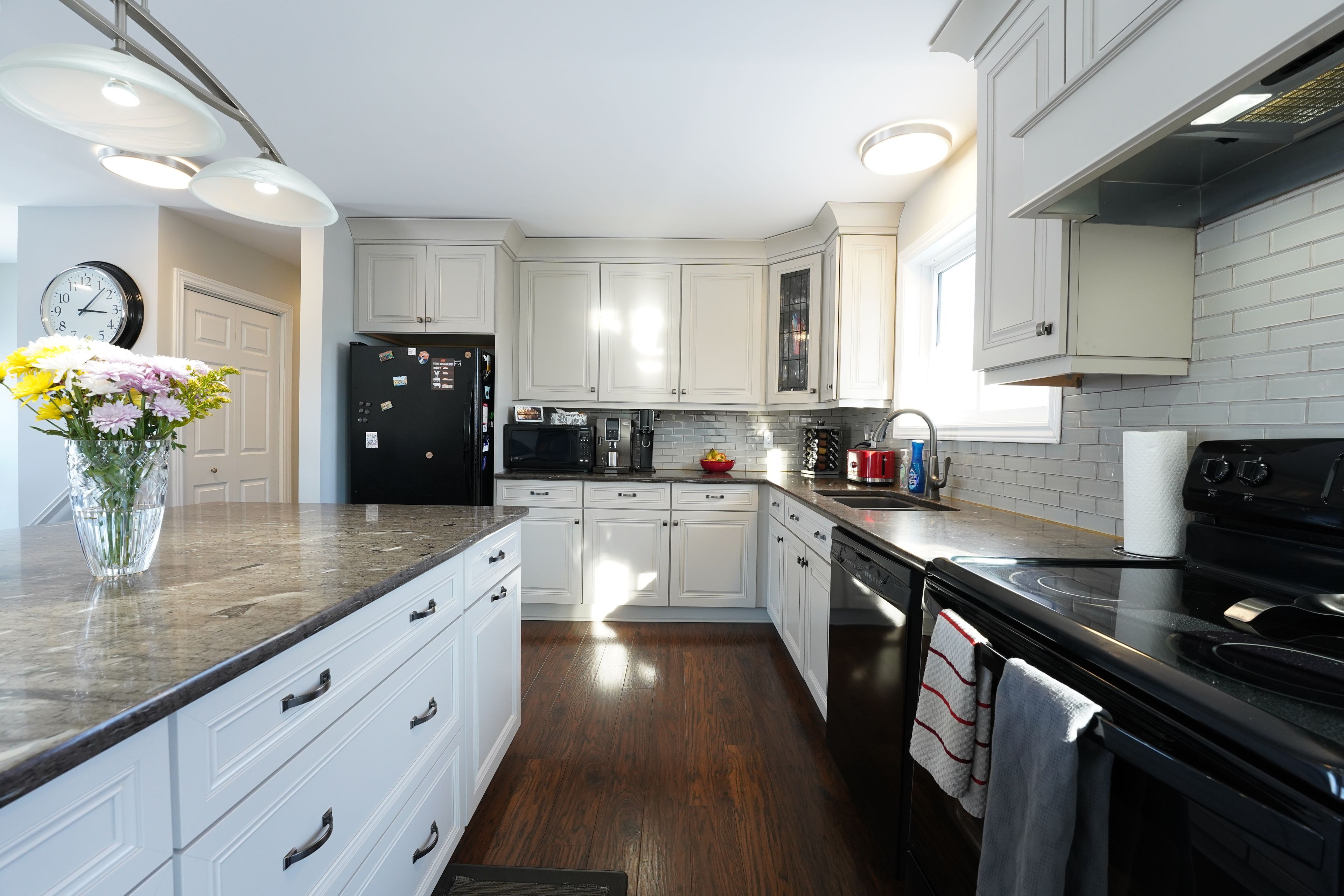 • Open-concept main level with a large kitchen and granite countertops.