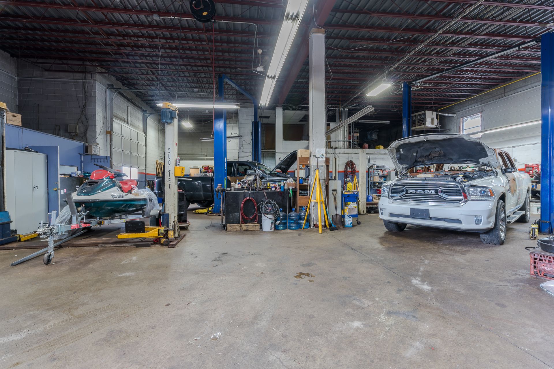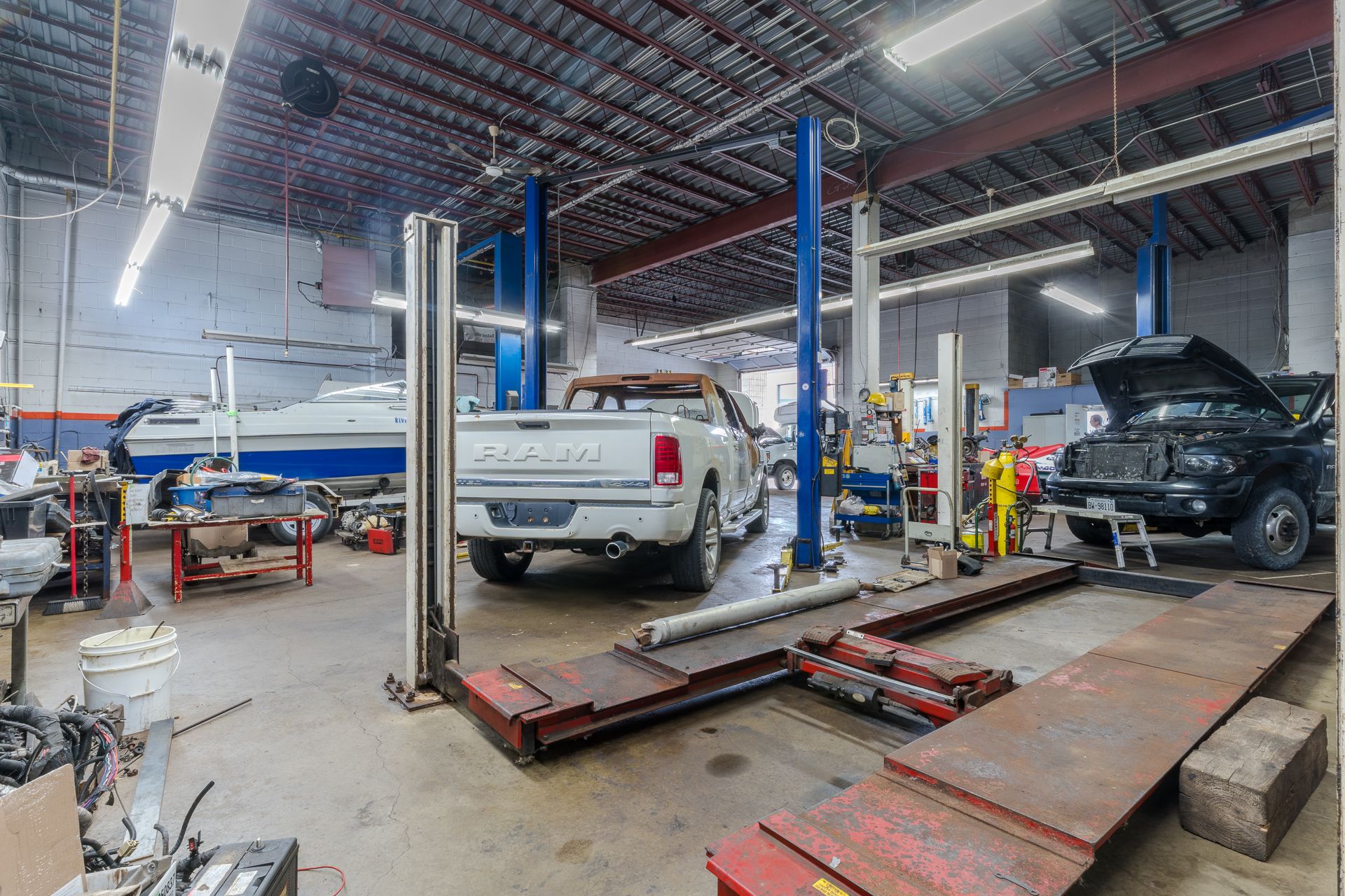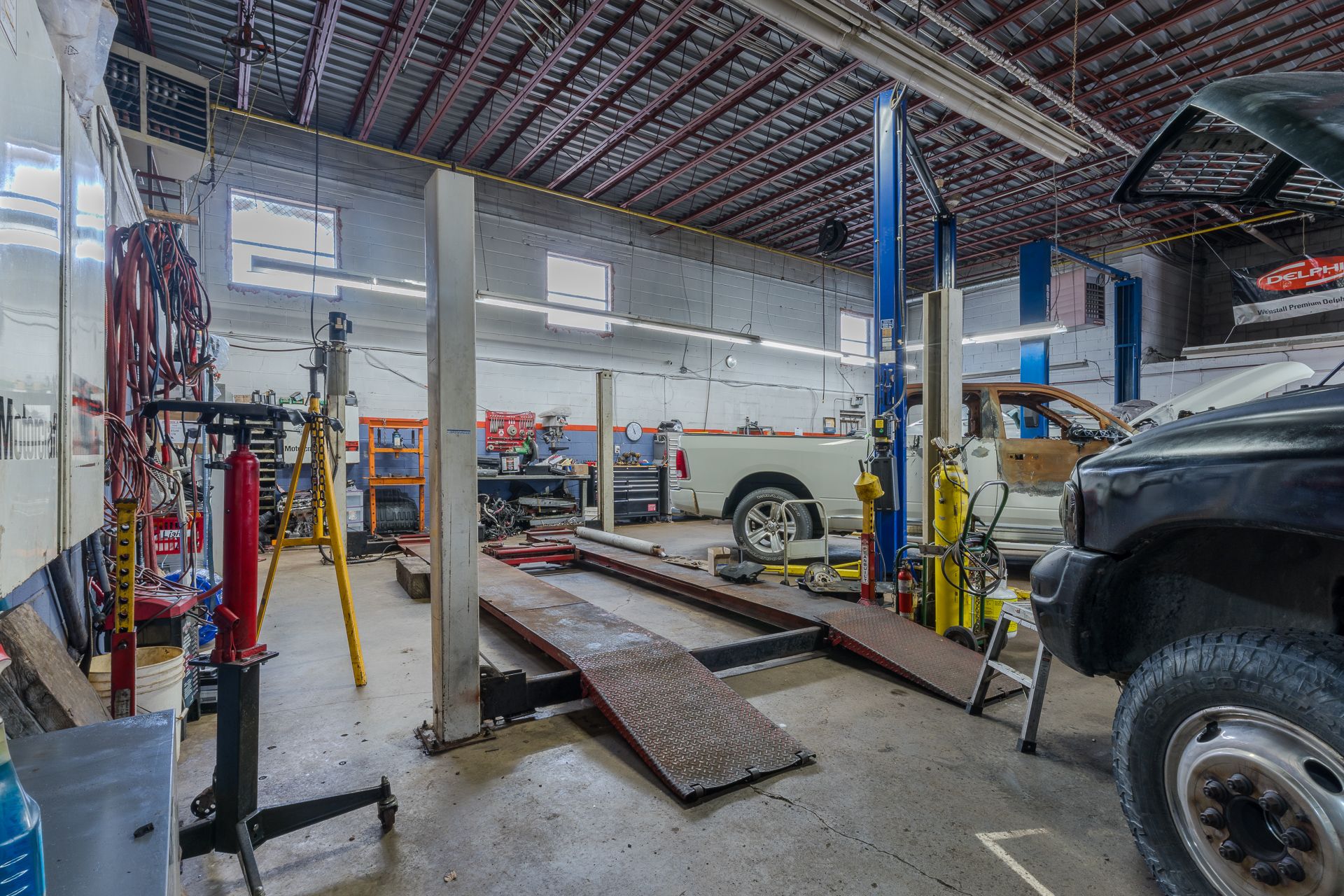 • Fully equipped with hoists, tire machines, and a variety of tools.
