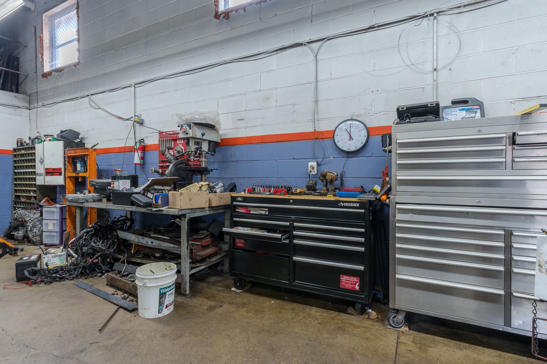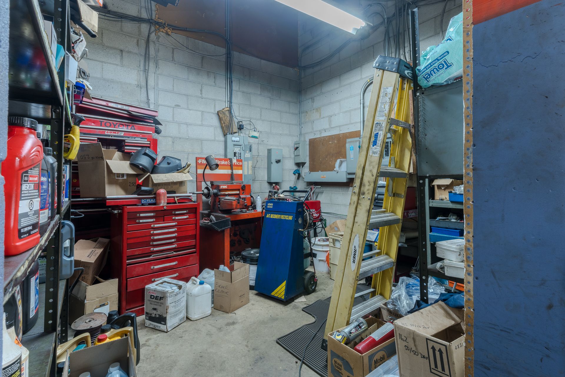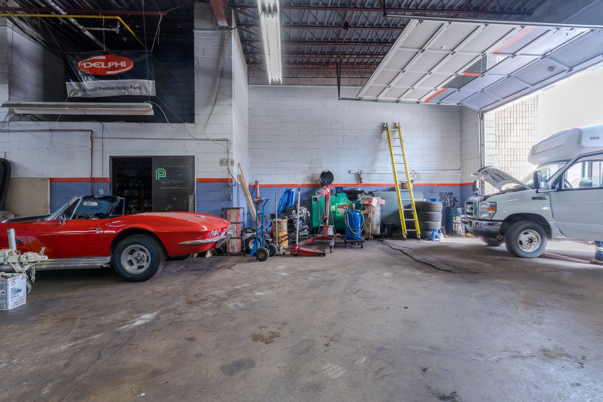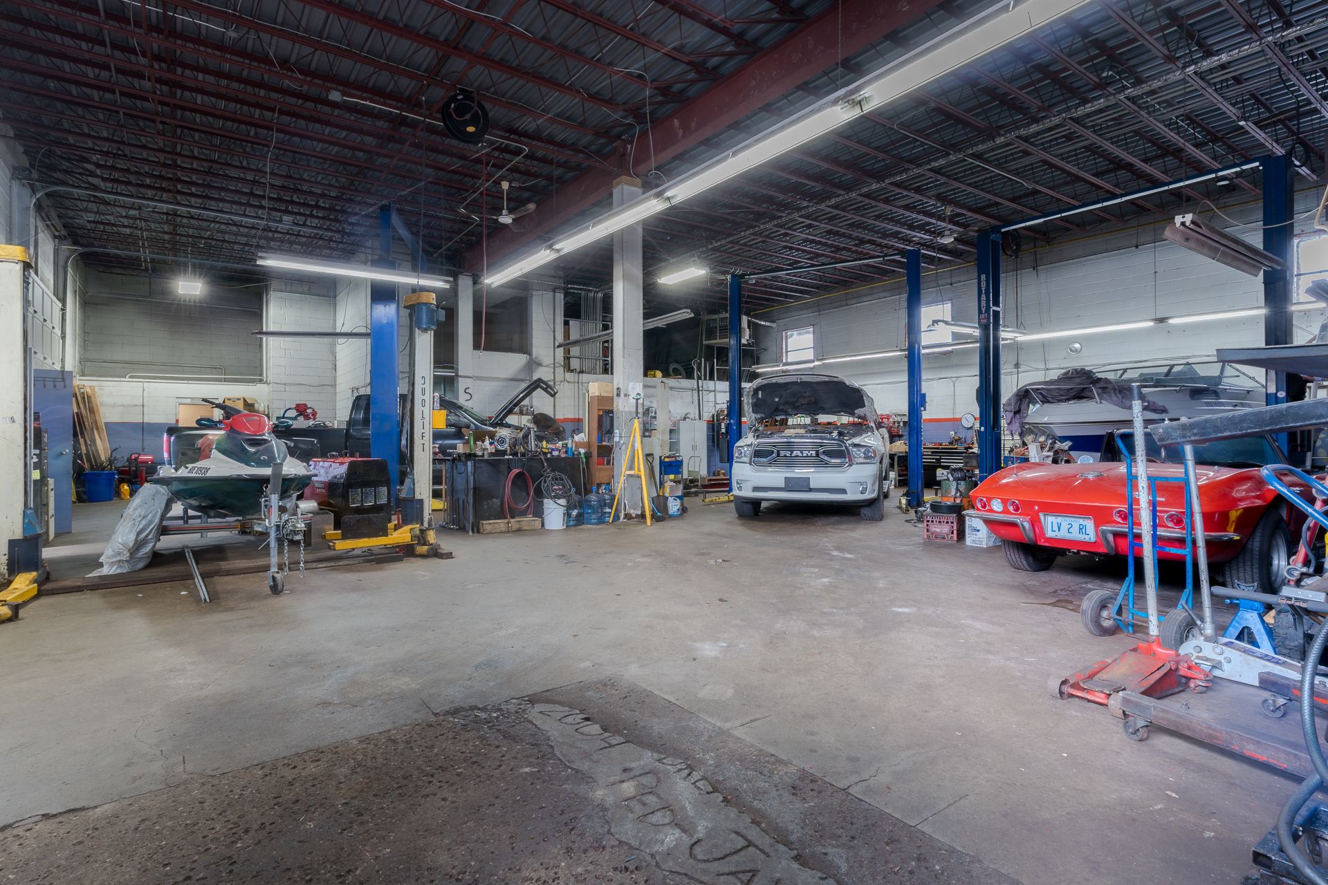 • Fully equipped with hoists, tire machines, and a variety of tools.