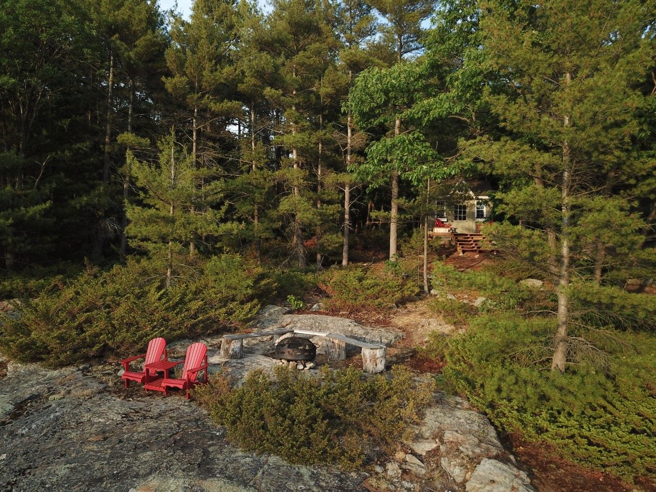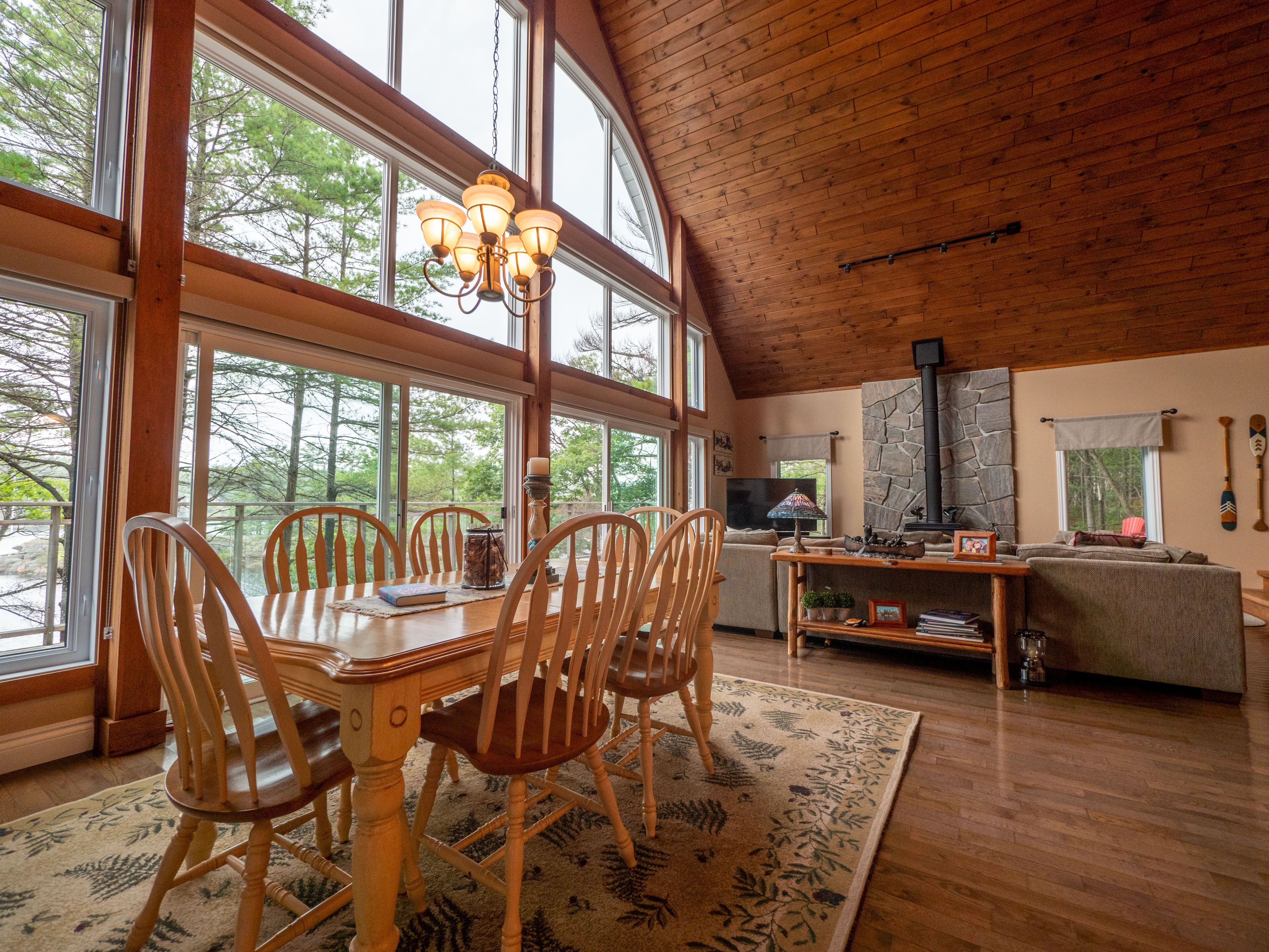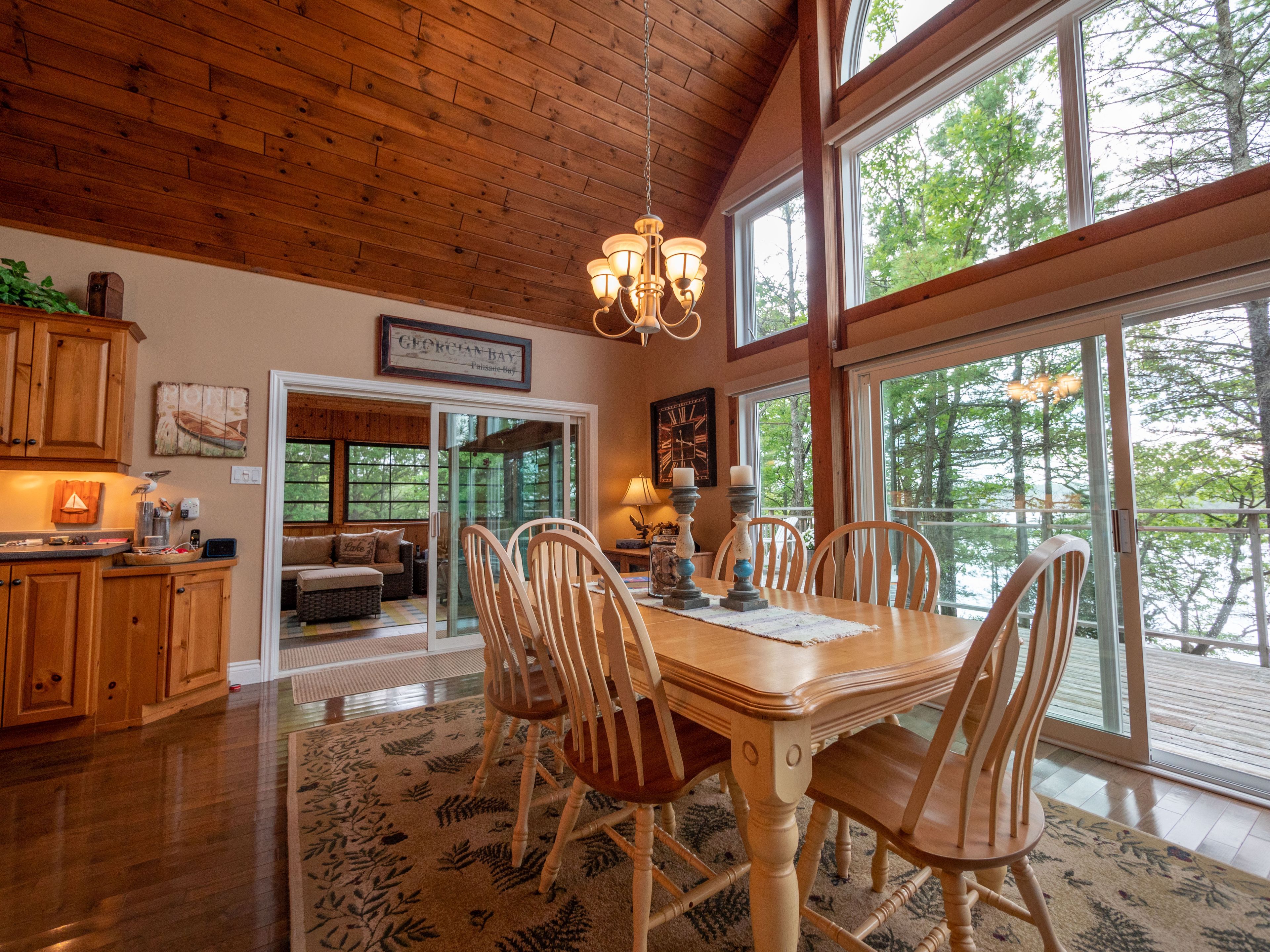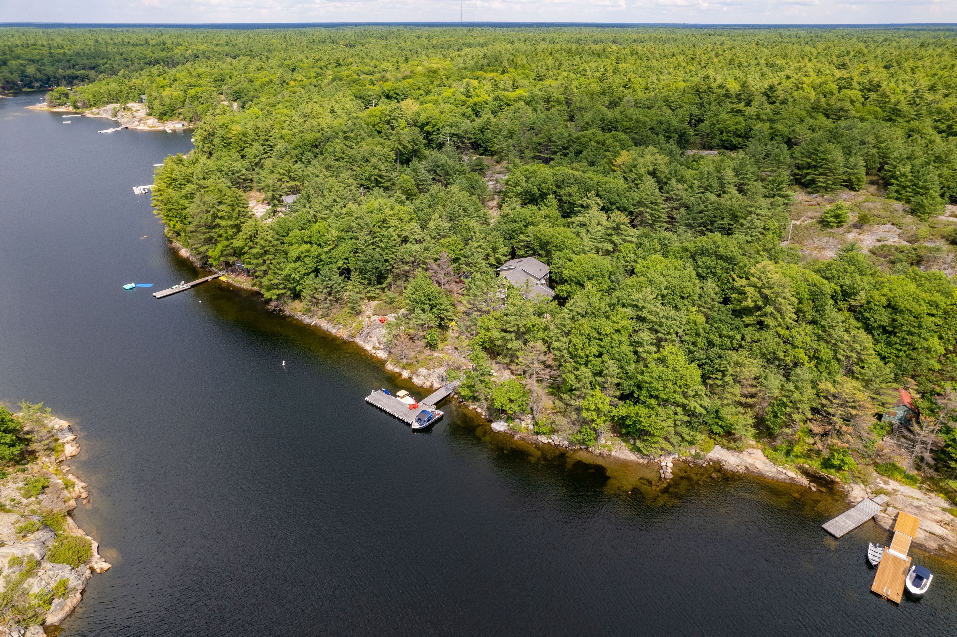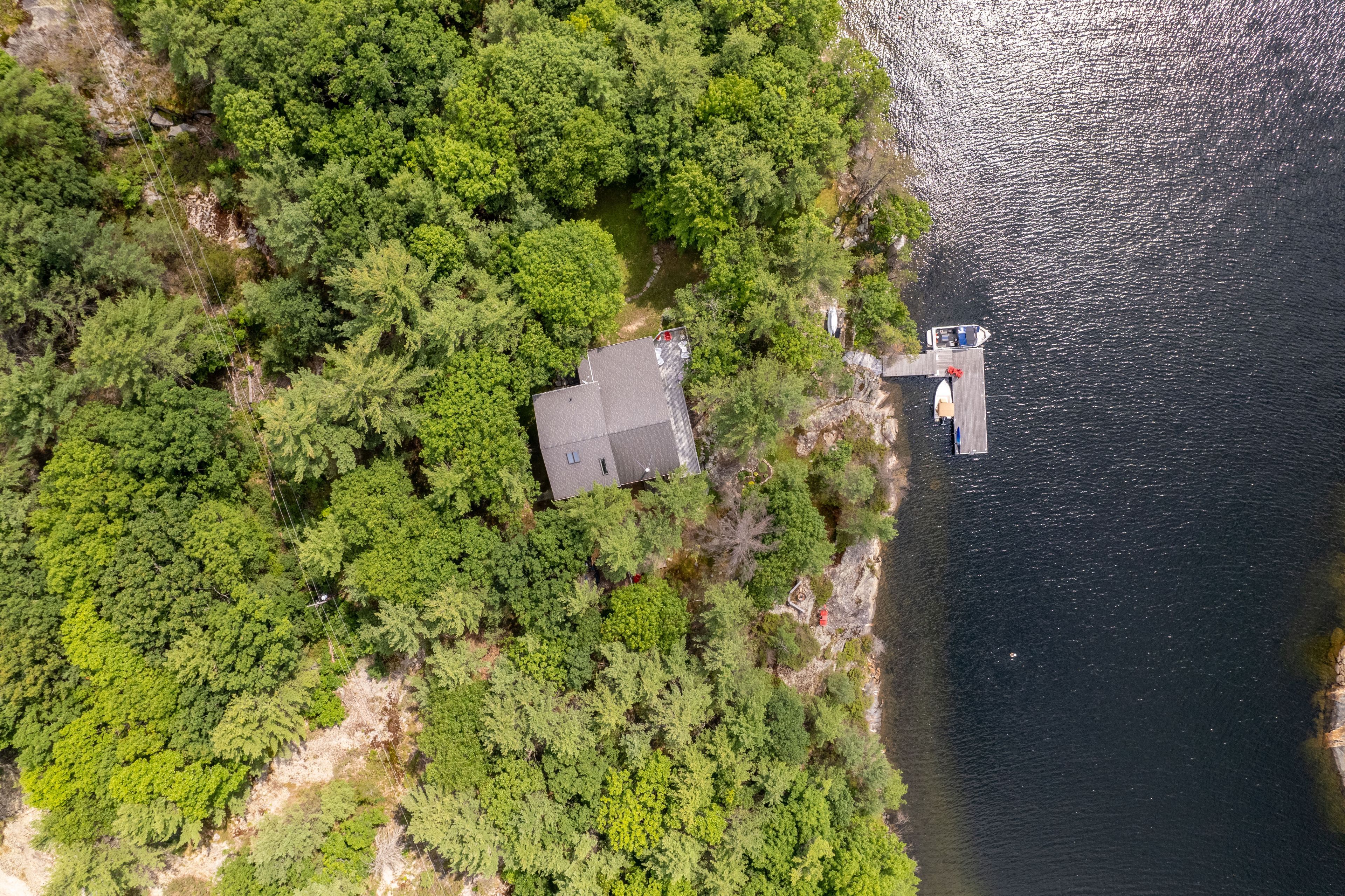 Welcome to 331 feet of pristine, west-facing rocky shoreline and crystal-clear deep water, where sunsets steal the show and every day feels like a retreat. This exceptional boat-access property features a beautifully maintained 3-bedroom cottage plus a professionally built bunkie, offering the perfect setup for hosting family and friends. The expansive dock and waterfront deck create multiple spaces for lounging, entertaining, and soaking in the peaceful views across this quiet, family-oriented bay. Inside, the heart of the cottage is a stunning great room with soaring vaulted ceilings, a cozy wood-burning stove, and dramatic floor-to-ceiling windows that perfectly frame the lake. The spacious kitchen is ideal for gathering and entertaining, with generous prep space and seamless sightlines to the water. A fully updated sunroom (2015) adds even more living space and is the perfect spot for morning coffee or evening unwinding. Upstairs, the elegant loft-style primary suite with private ensuite offers a peaceful, elevated retreat. A ductless mitsubishi heating and air conditioning system allows for comfortable use in both summer and winter, extending your cottage season year-round. Just a short paddle to mccrae lake conservation reserve and only 15 minutes by boat from the nearest marina. Boat access only. Total privacy. Ultimate escape.