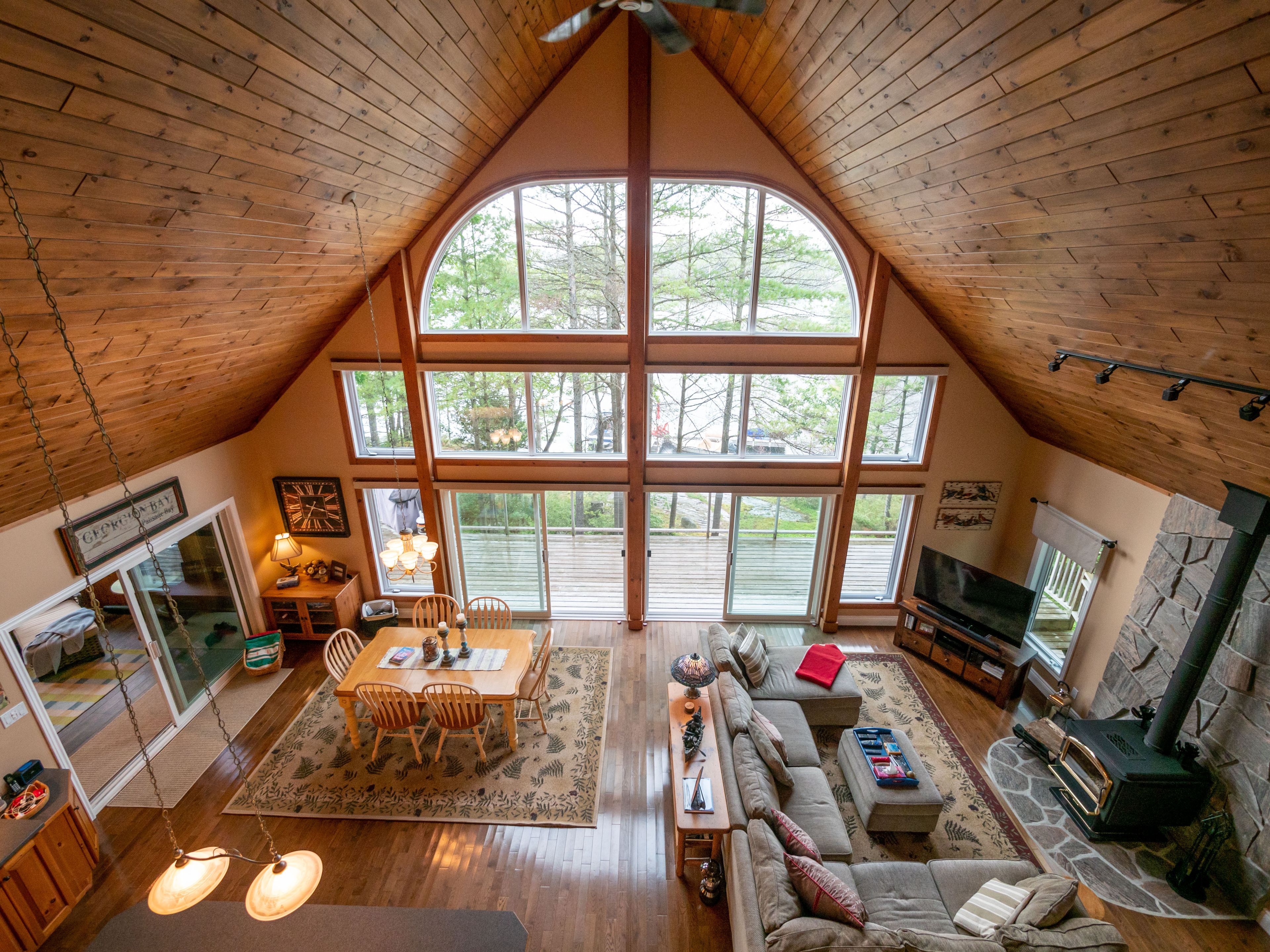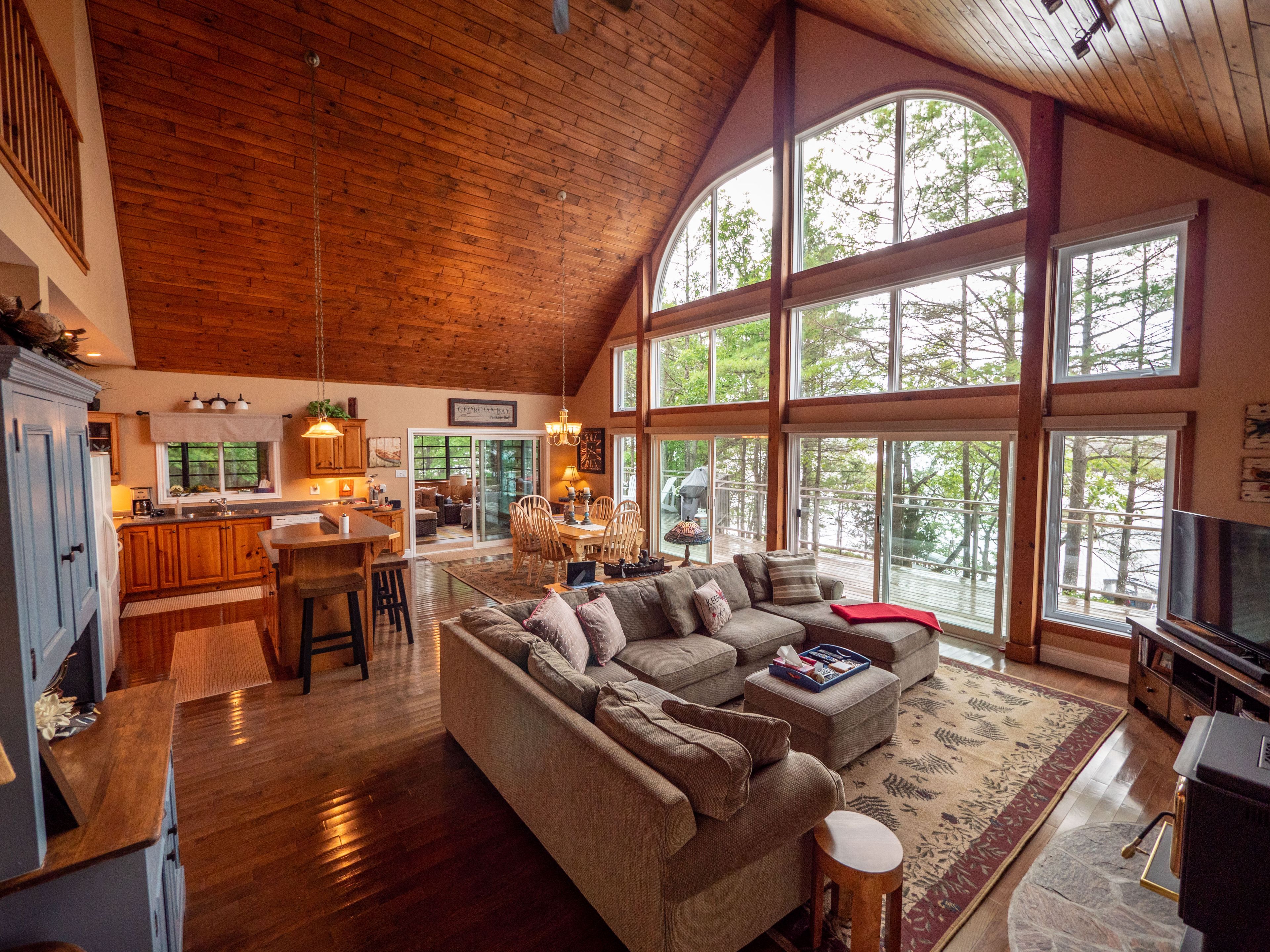 • Bright great room with vaulted ceilings and dramatic lake view windows.