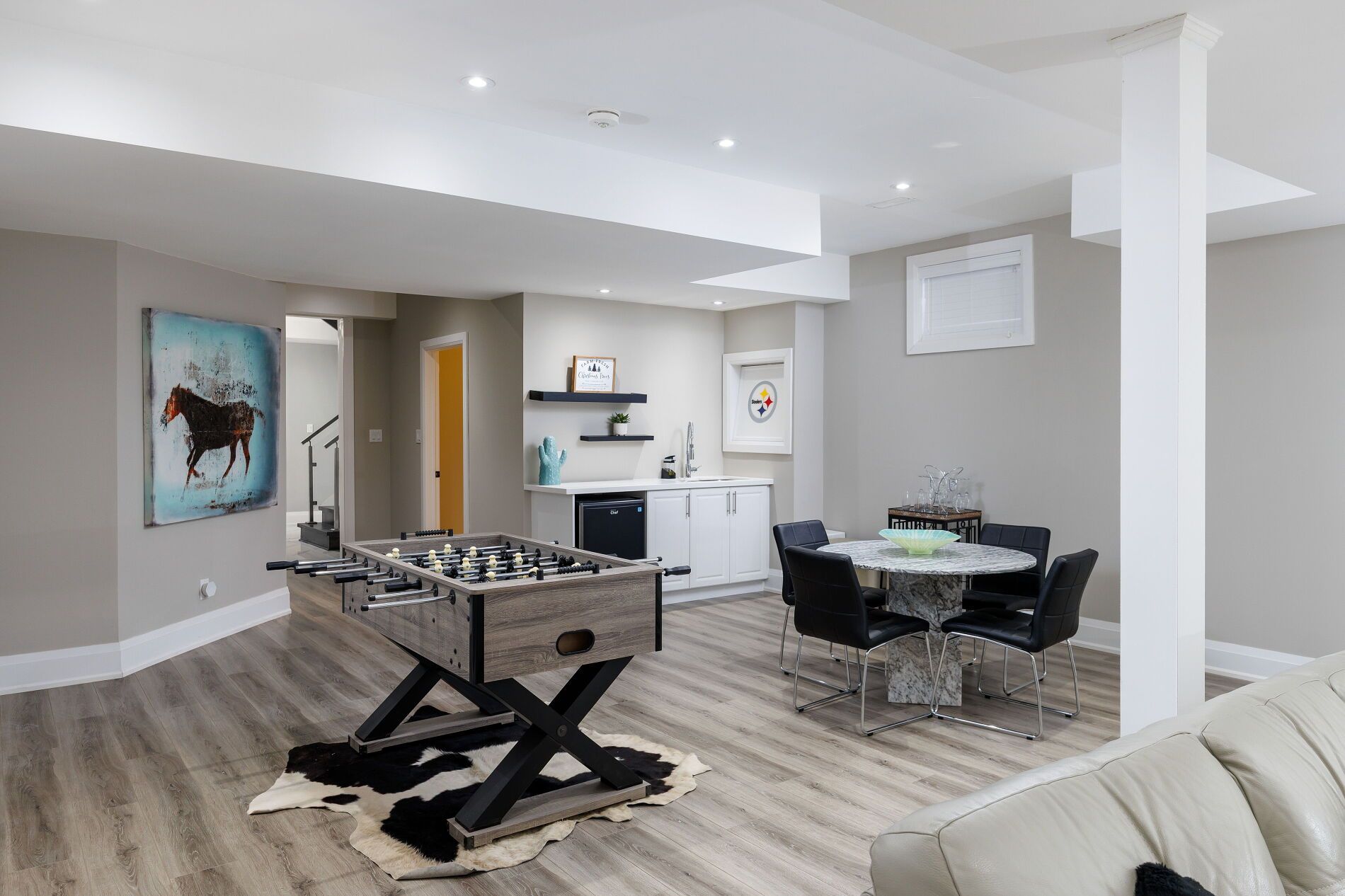 • Finished basement with a rec room, wet bar, and fifth bedroom.