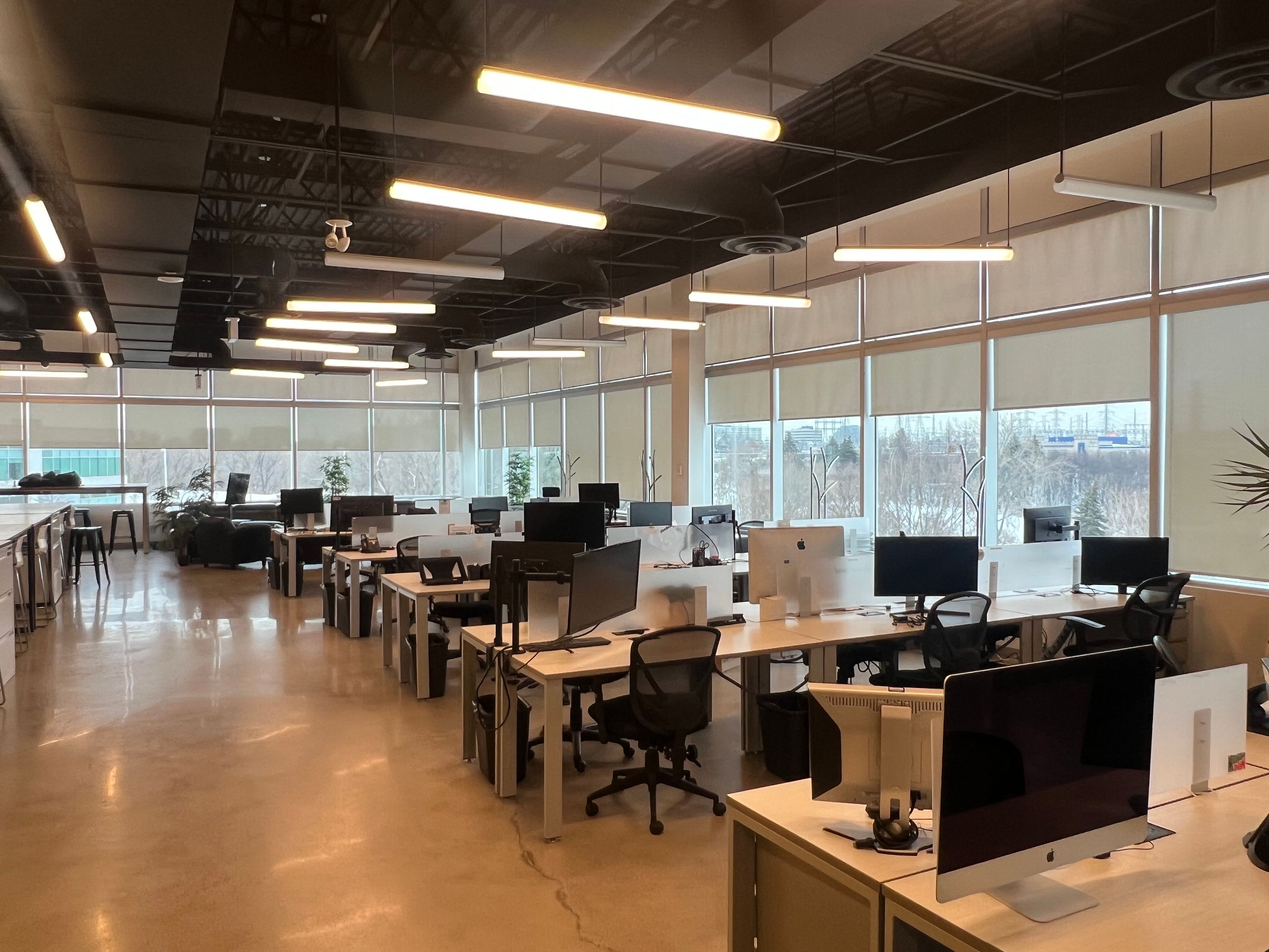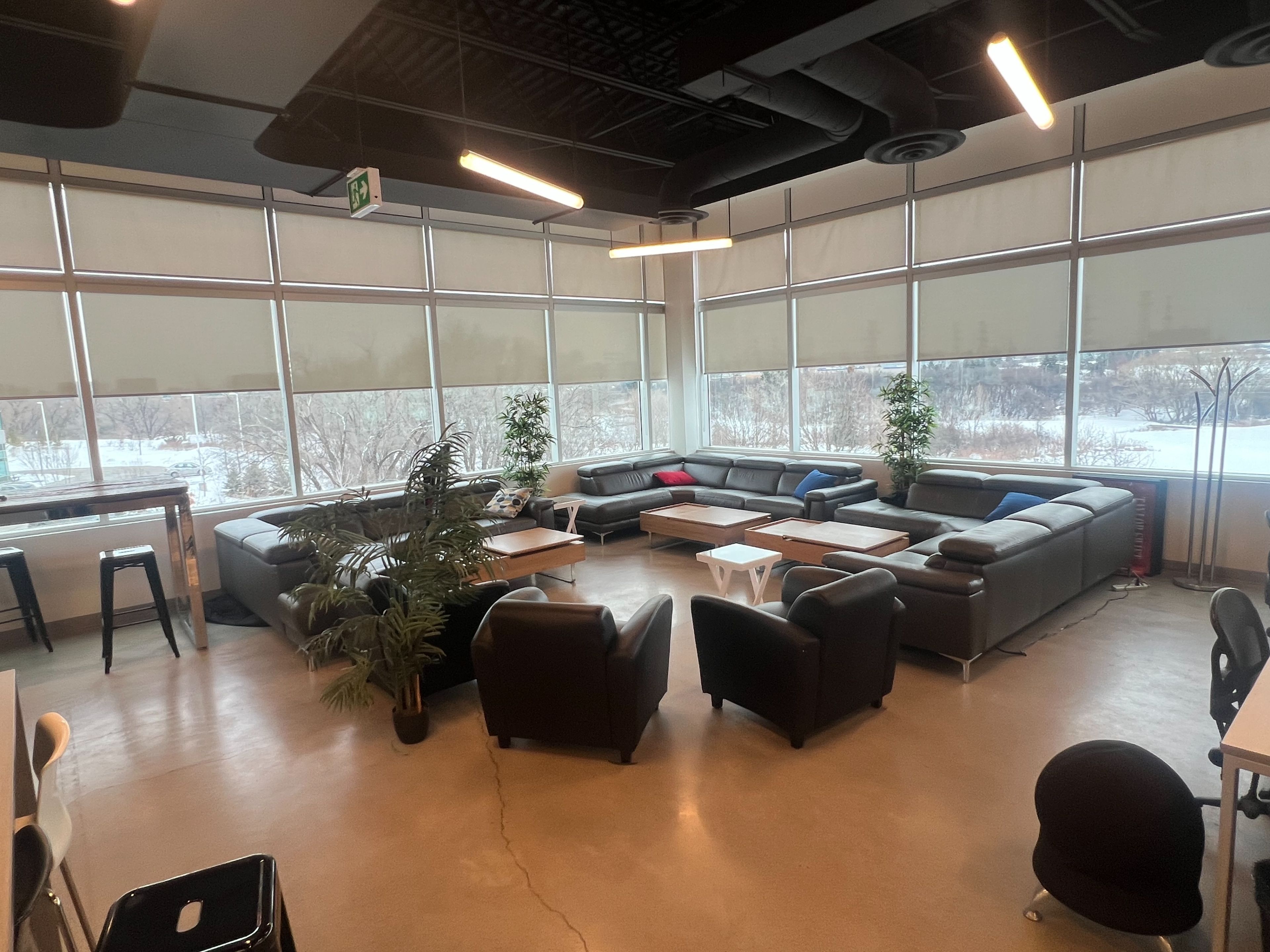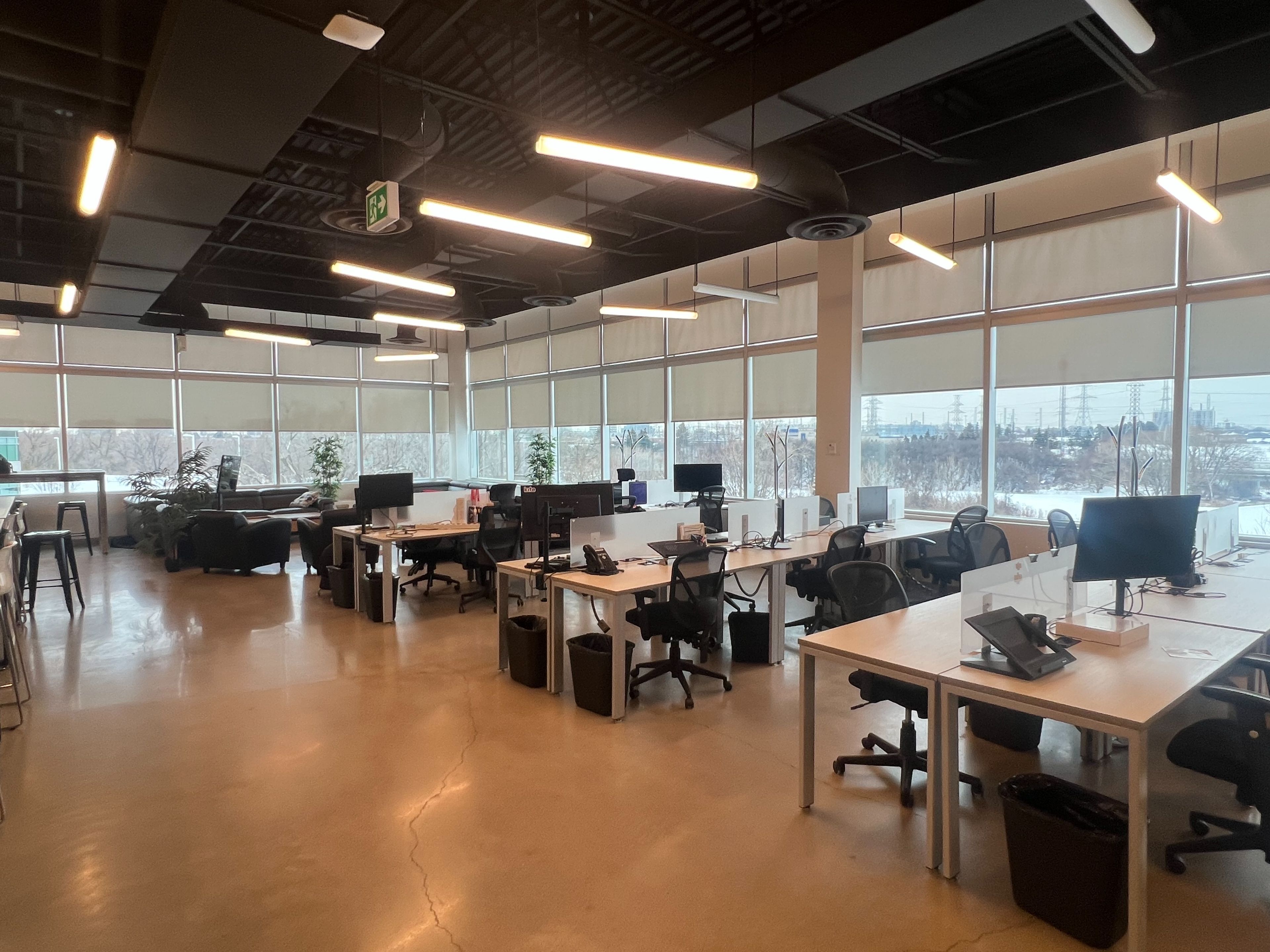 • Large windows provide ample natural light, enhancing the work environment.