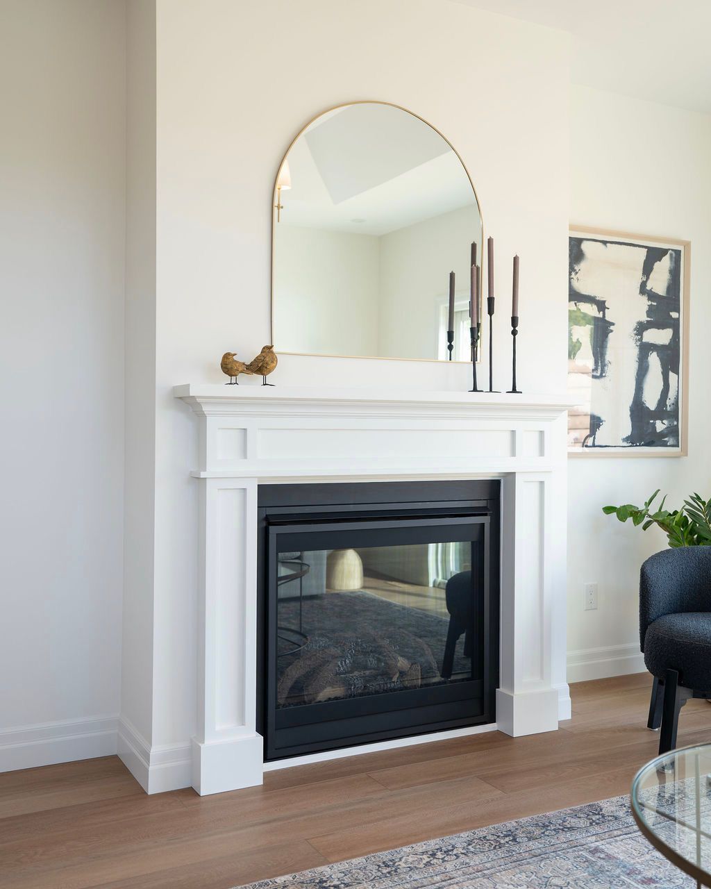 • Open concept living area featuring a gas fireplace and large patio doors.