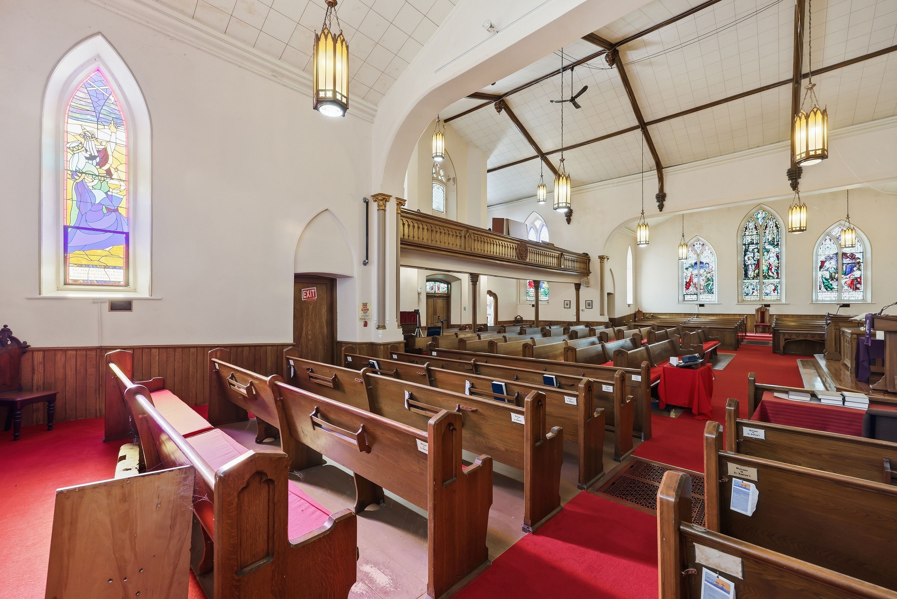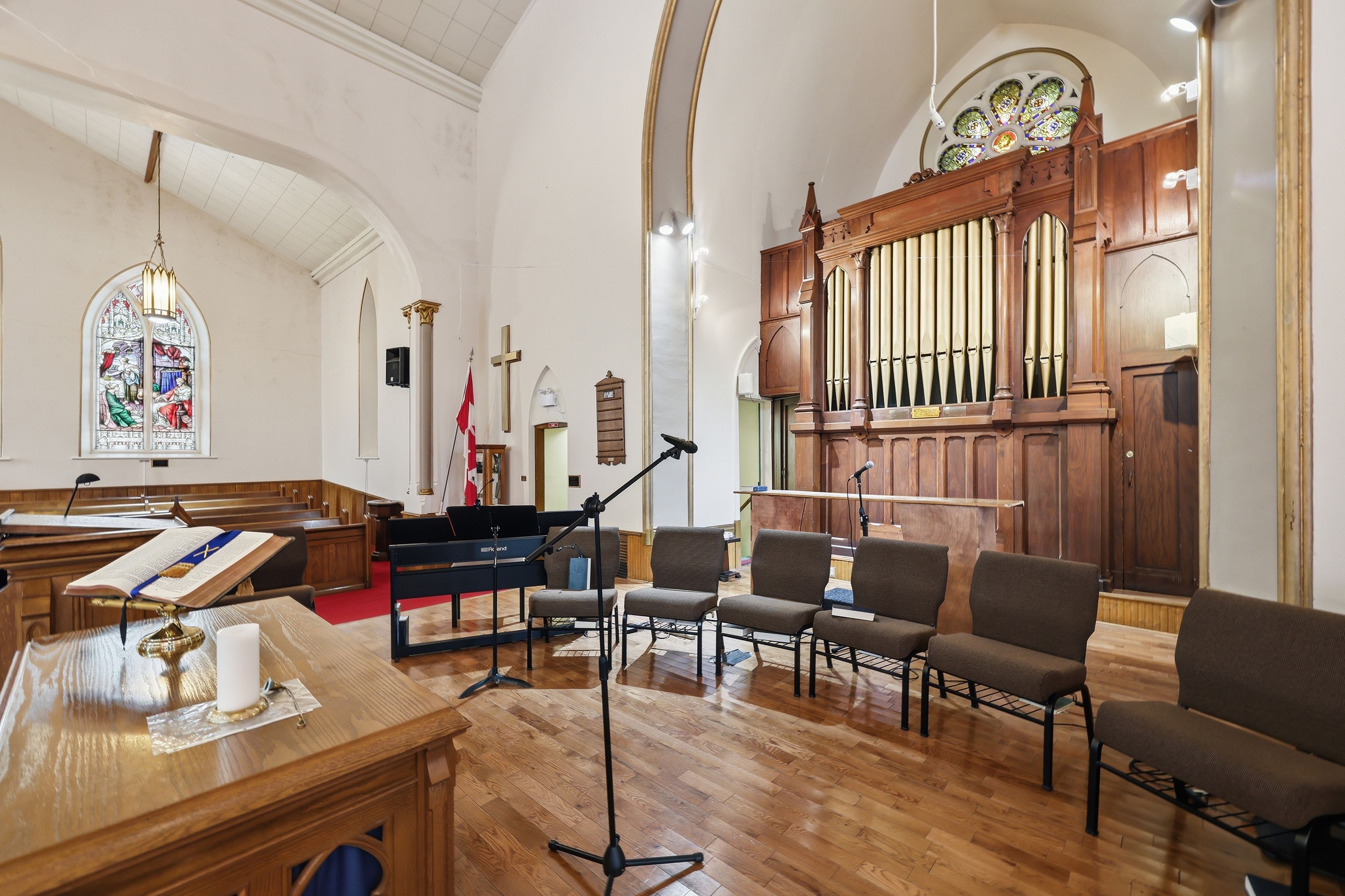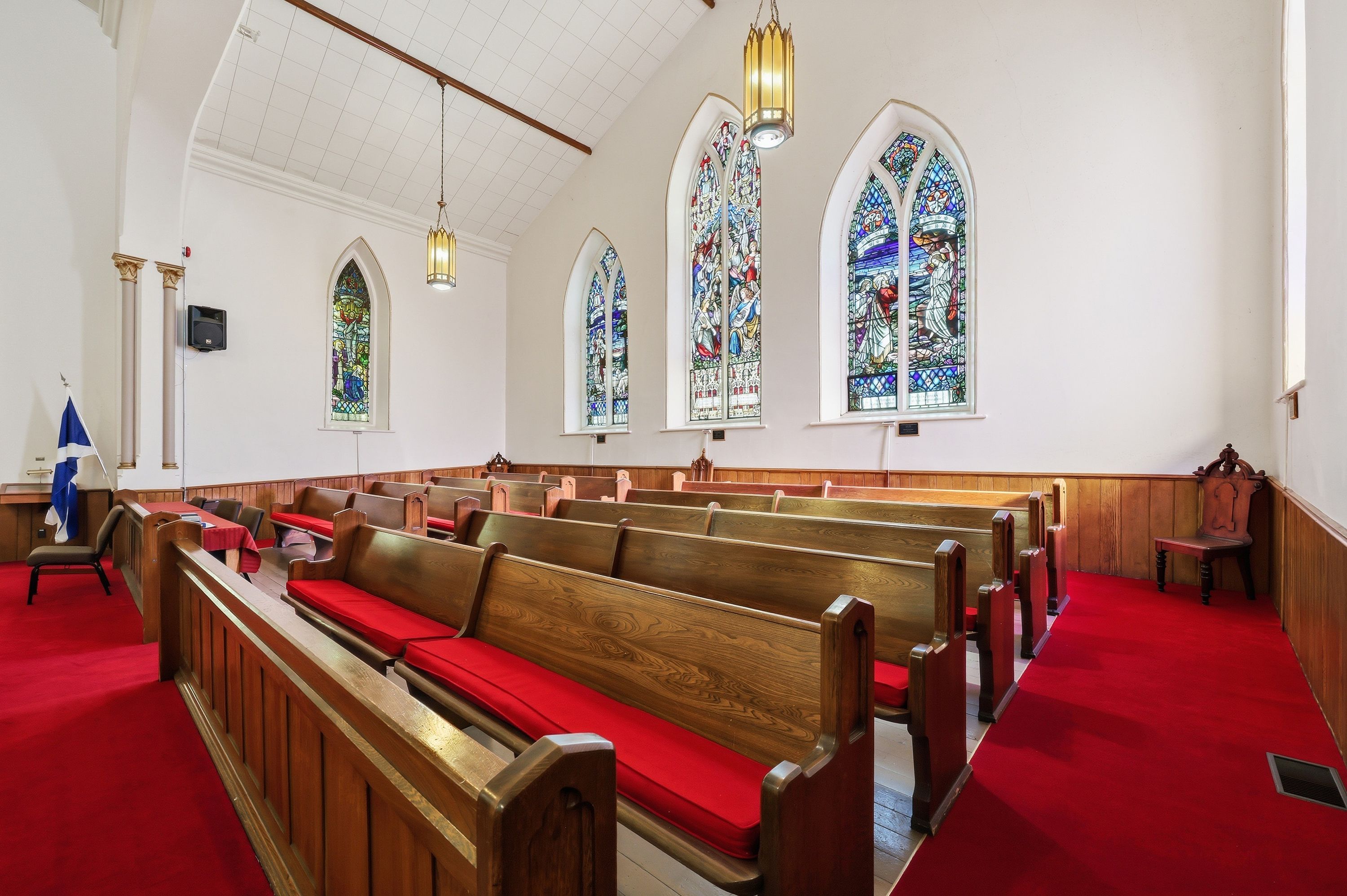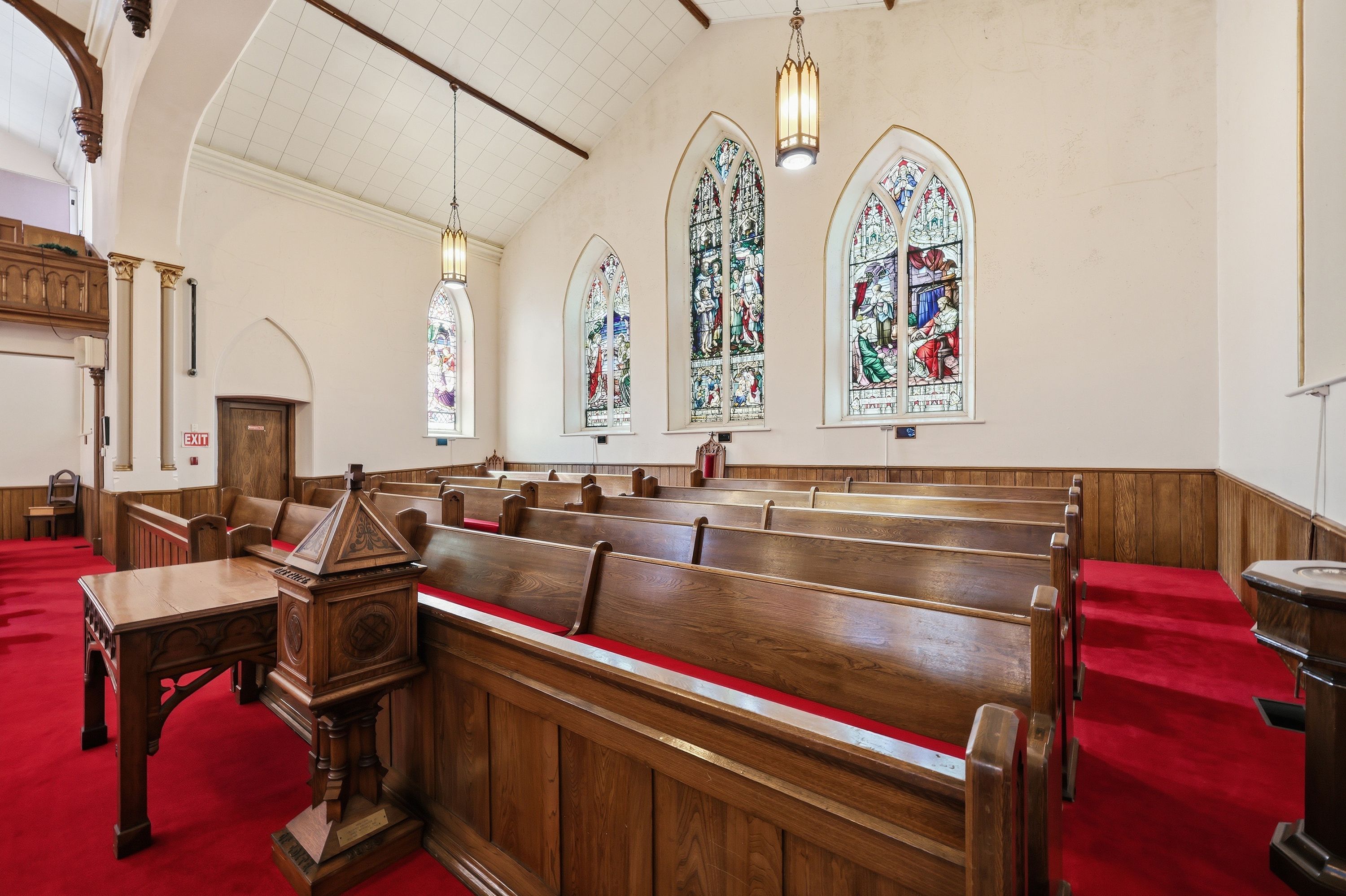• Stained glass windows and soaring ceilings add unique character.