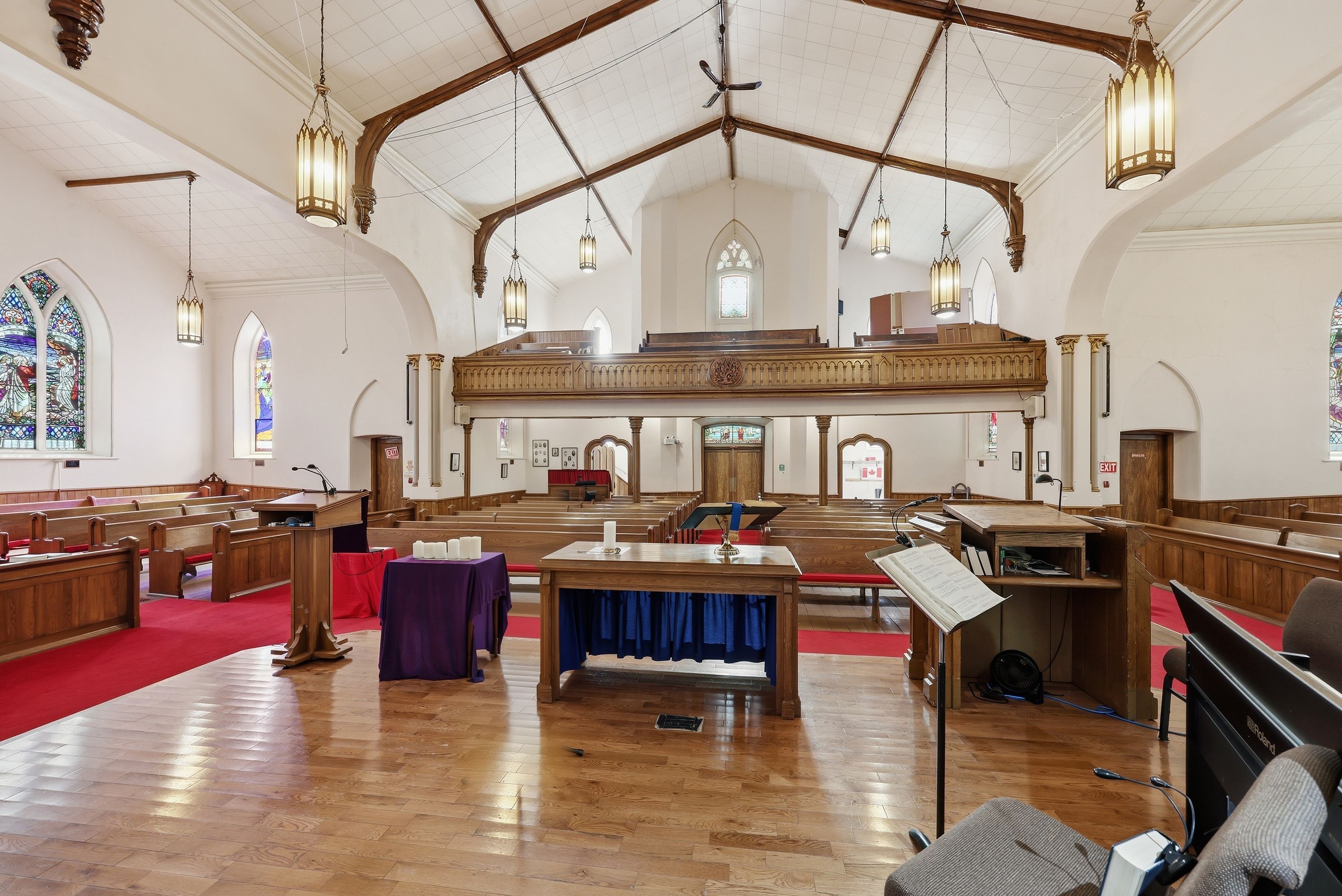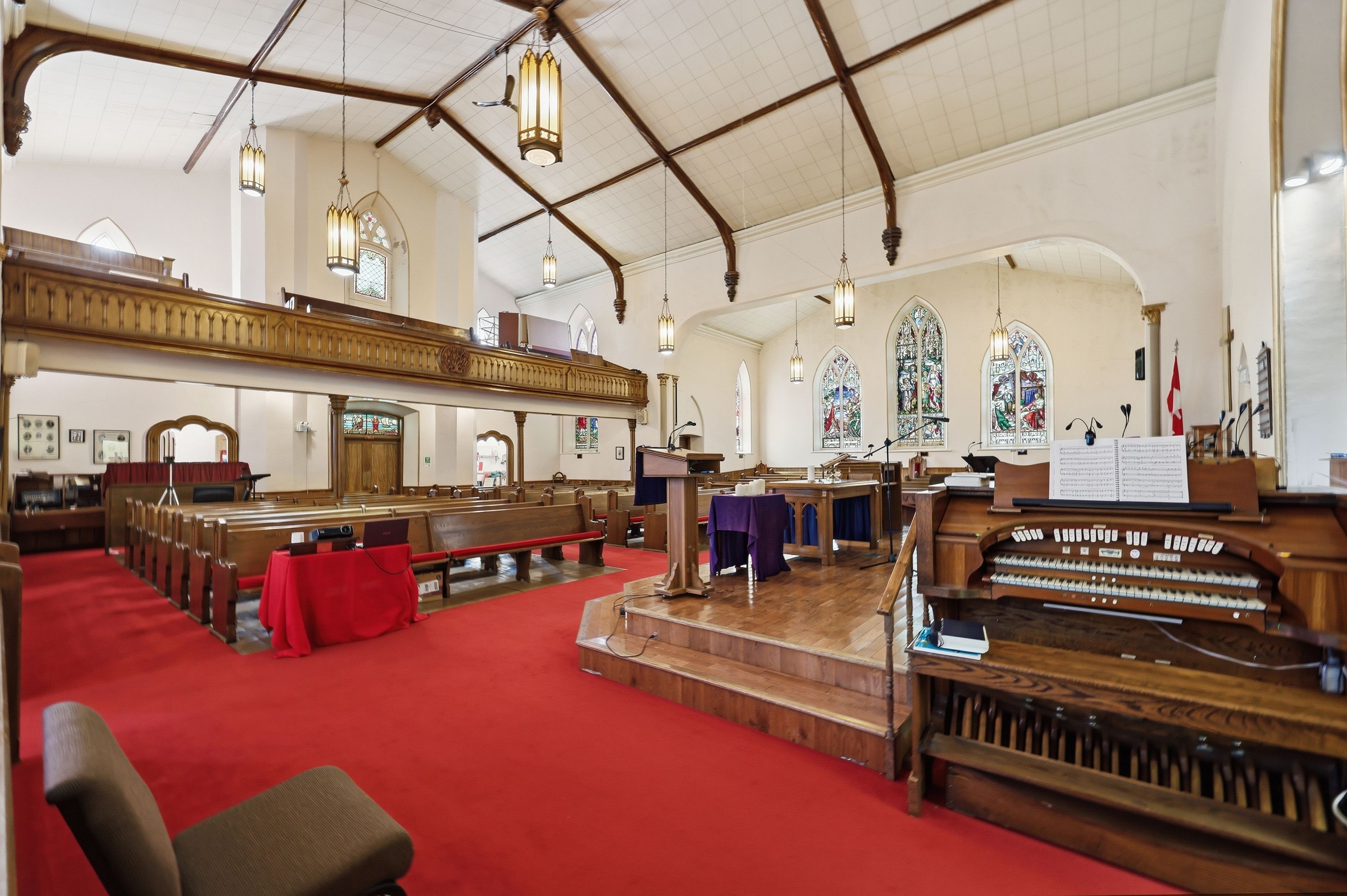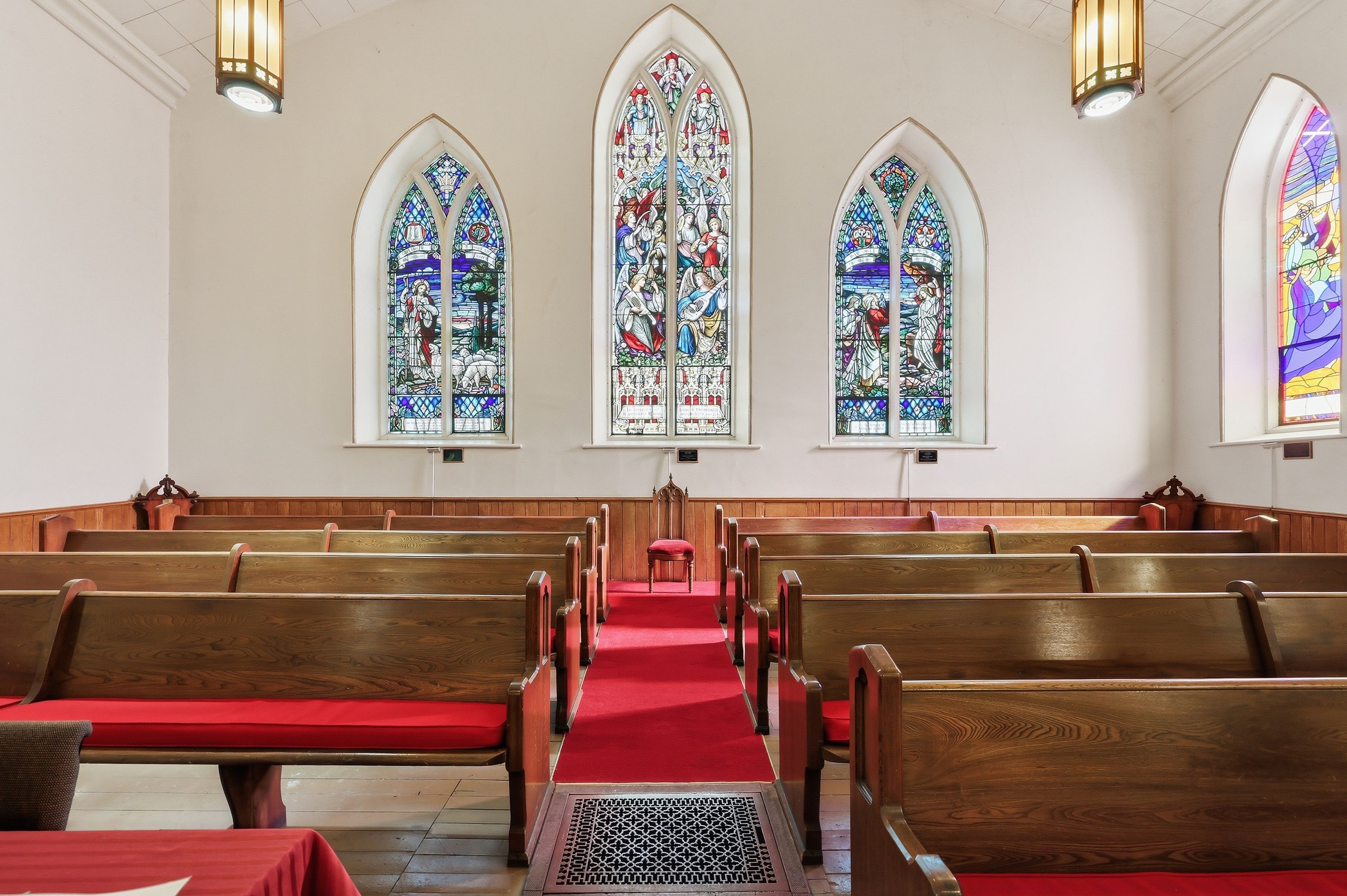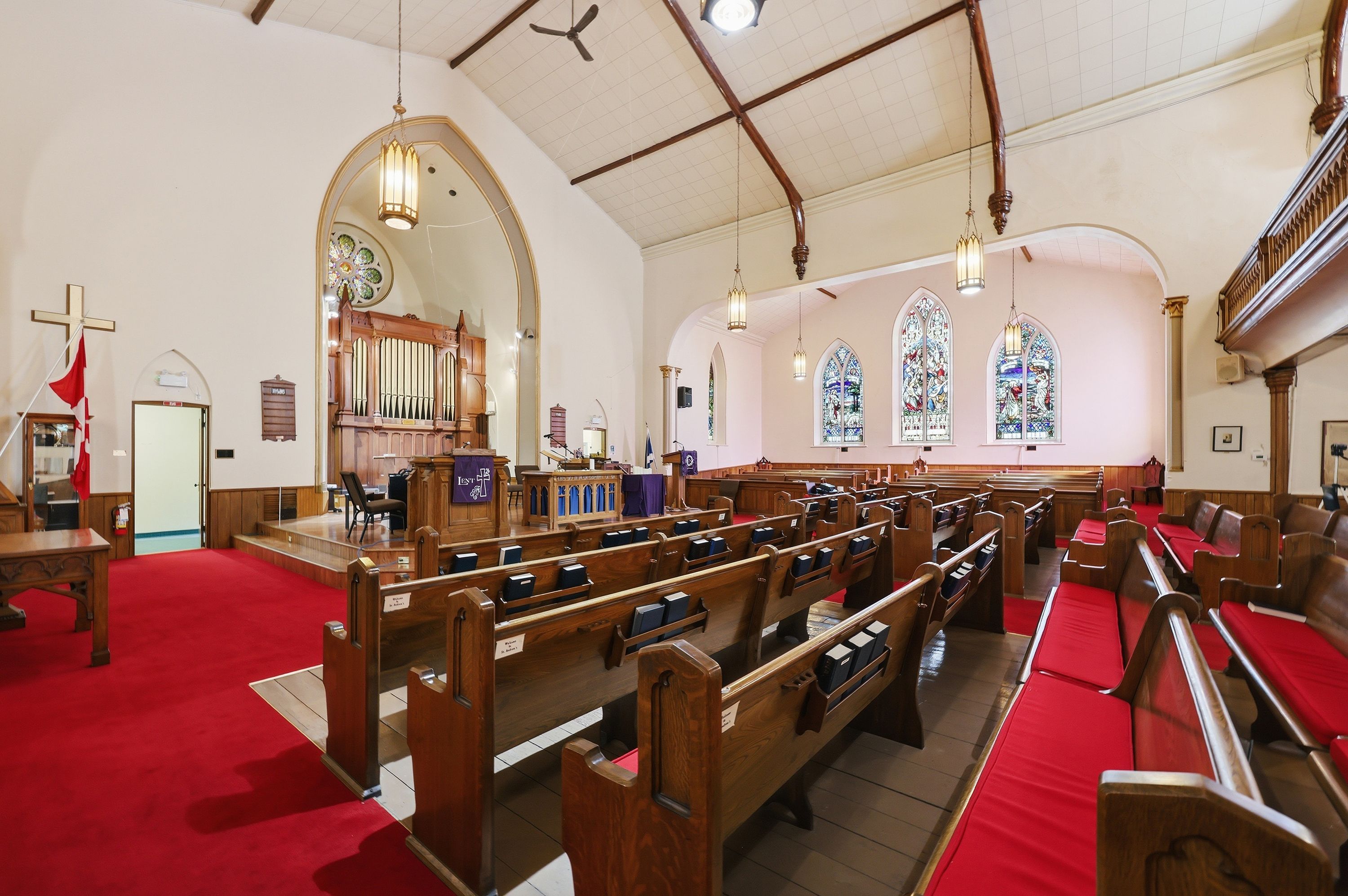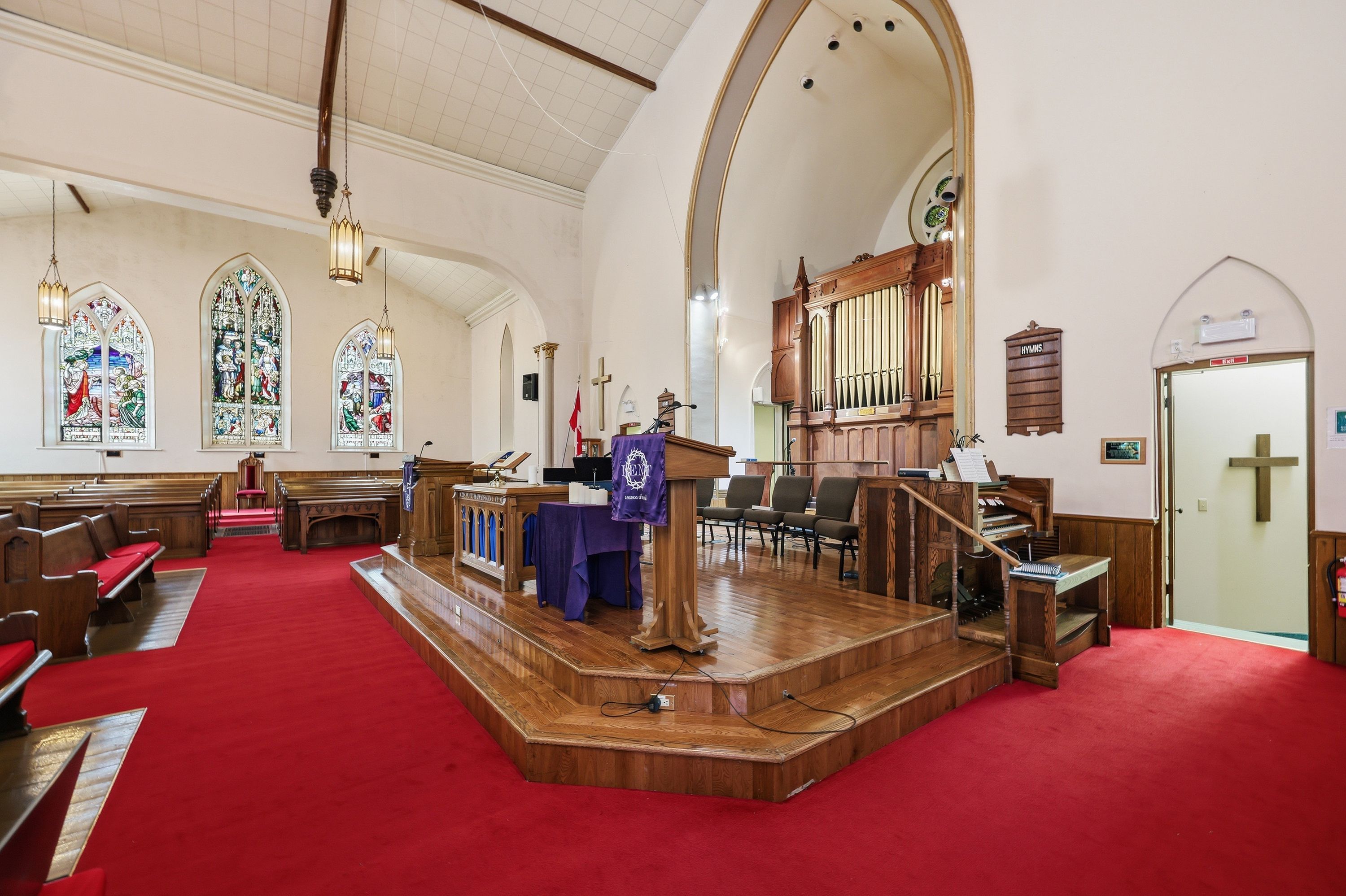 • Stained glass windows and soaring ceilings add unique character.