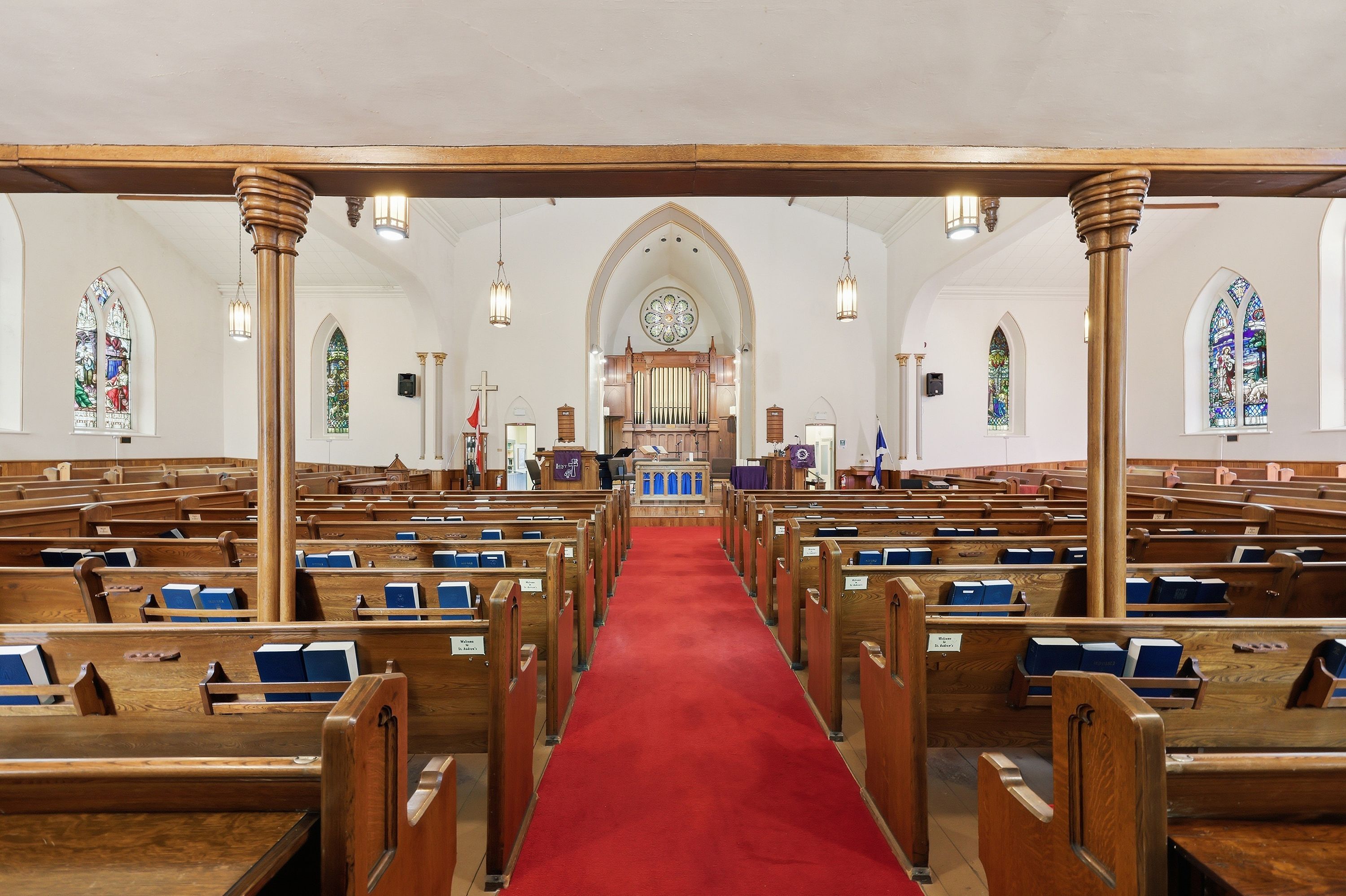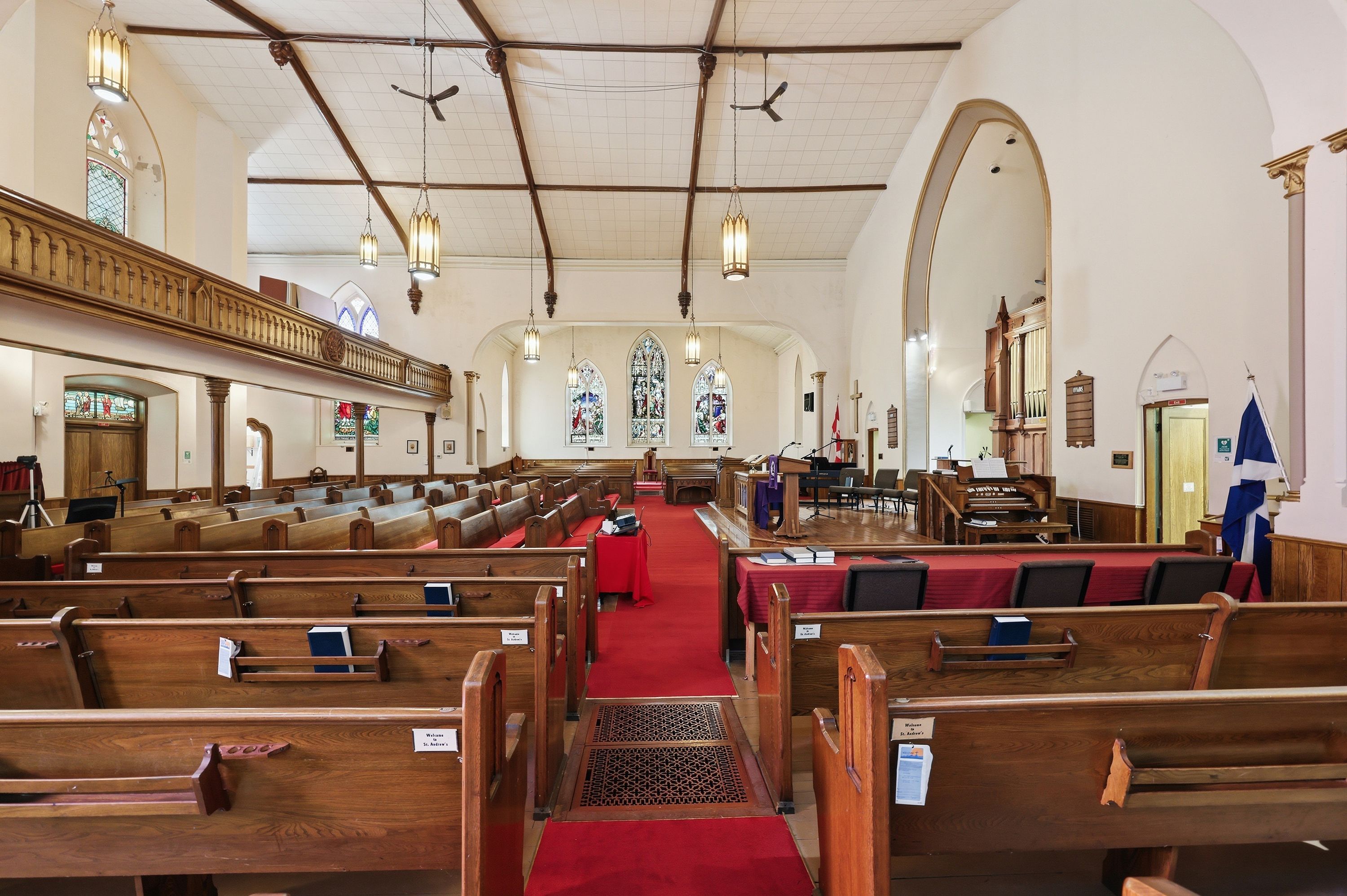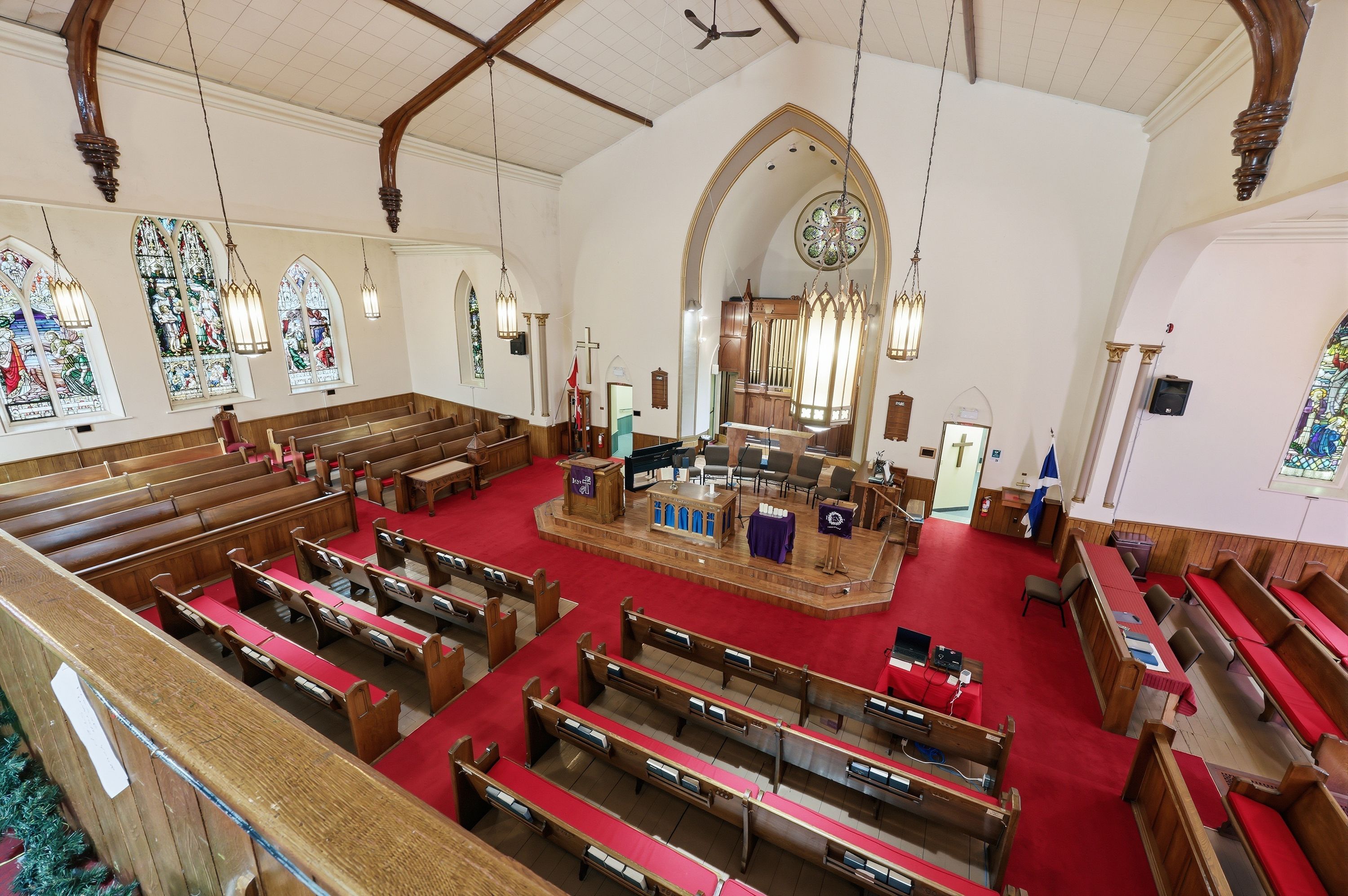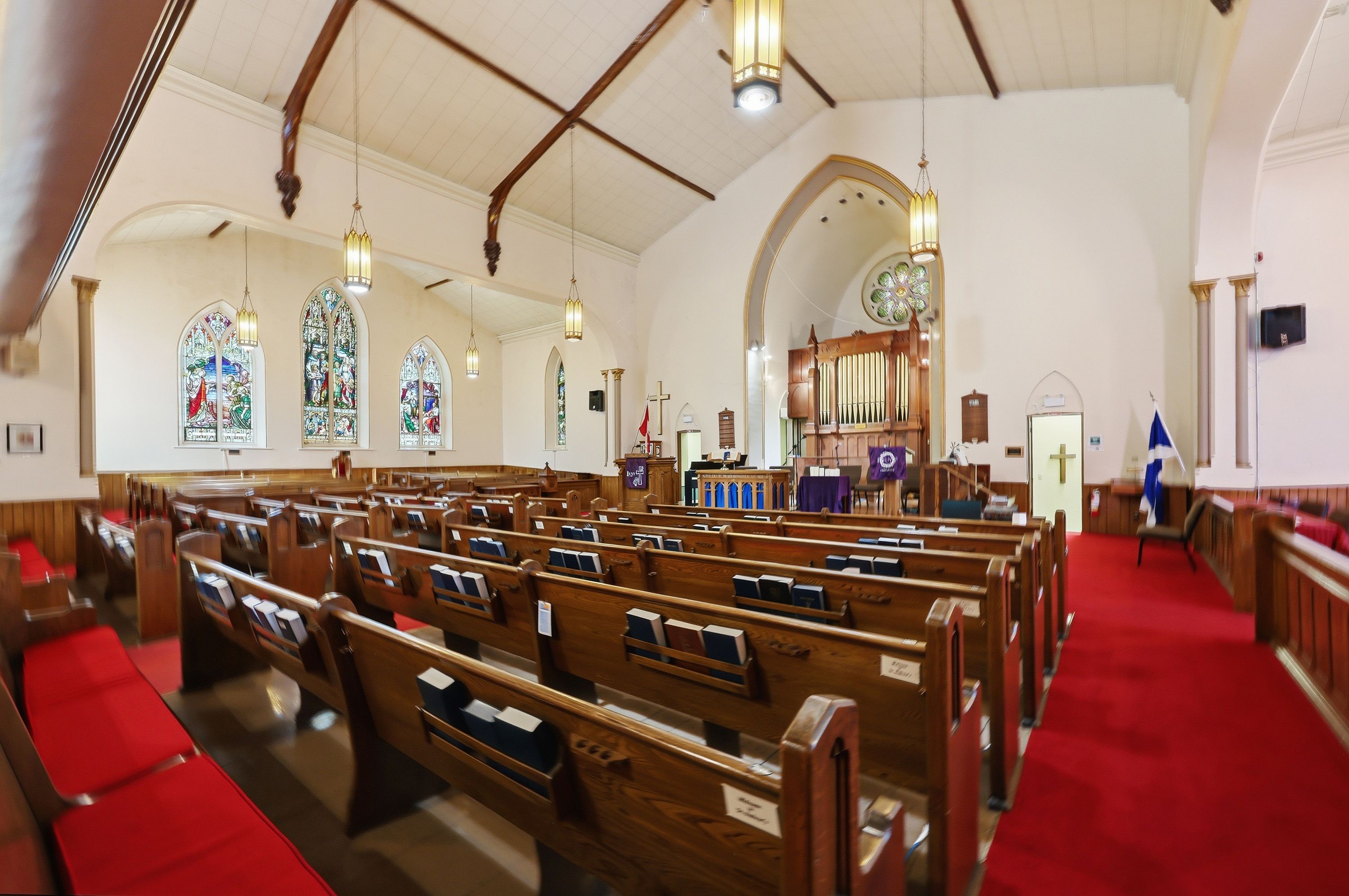 • Stained glass windows and soaring ceilings add unique character.