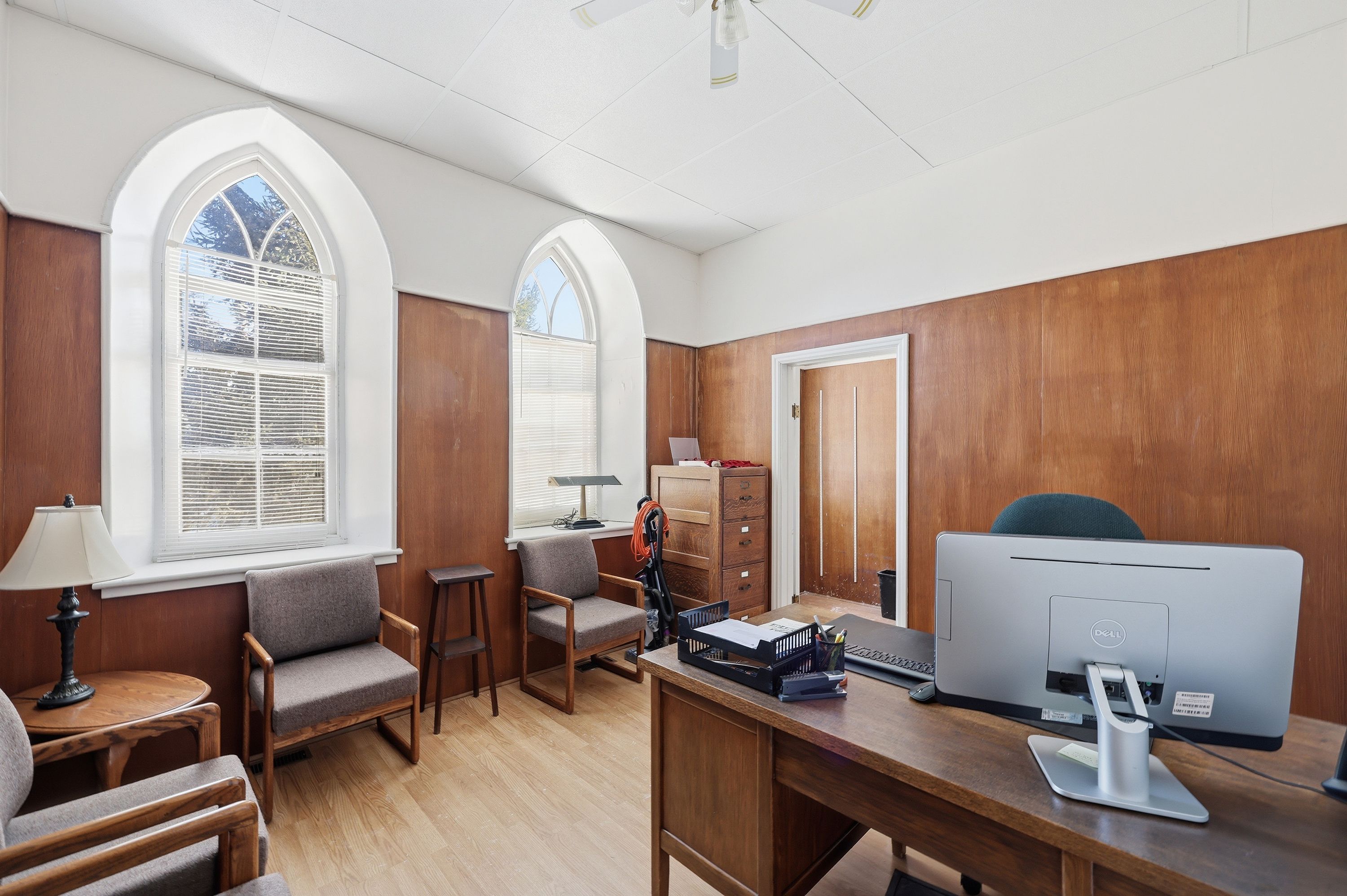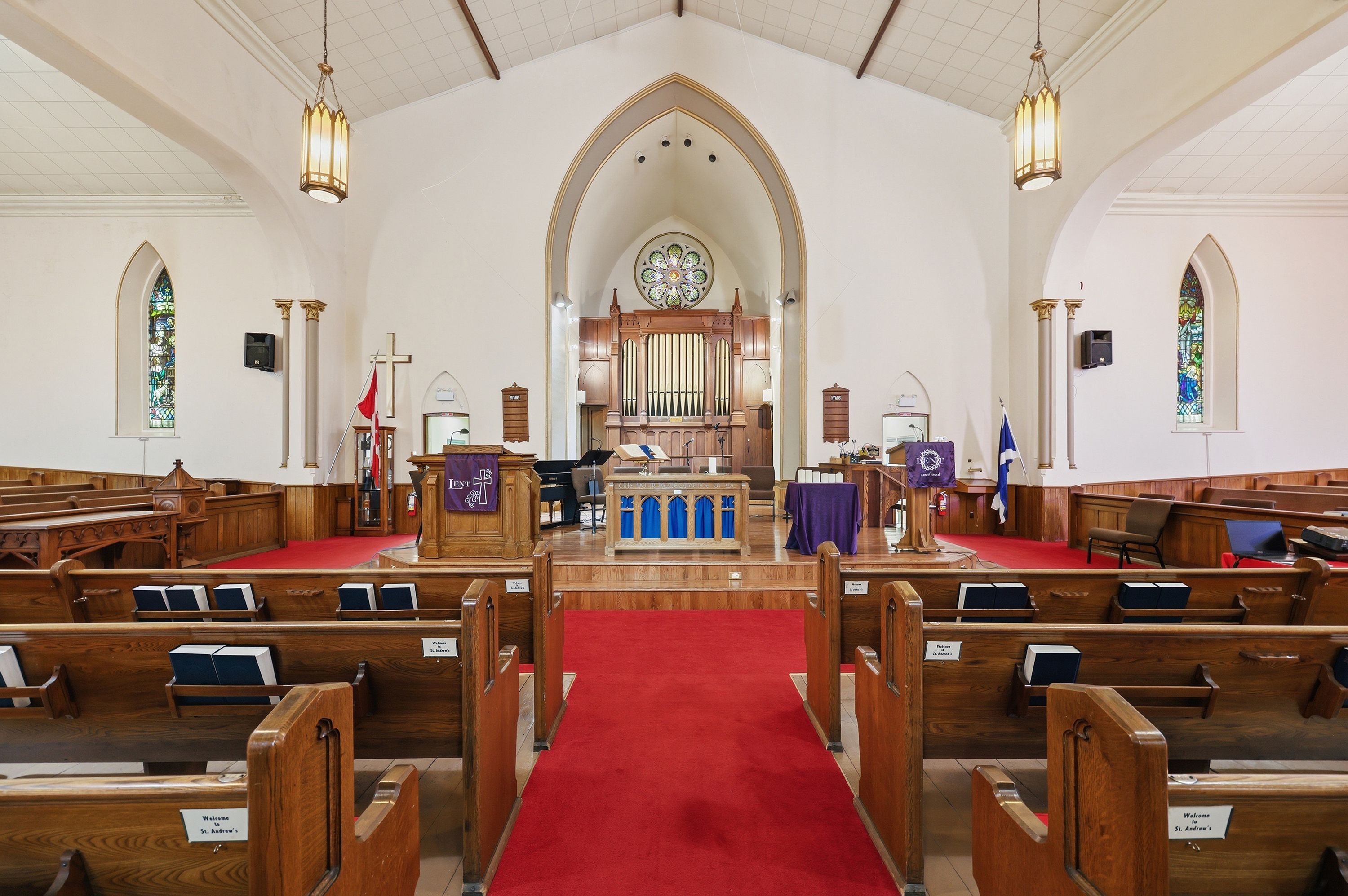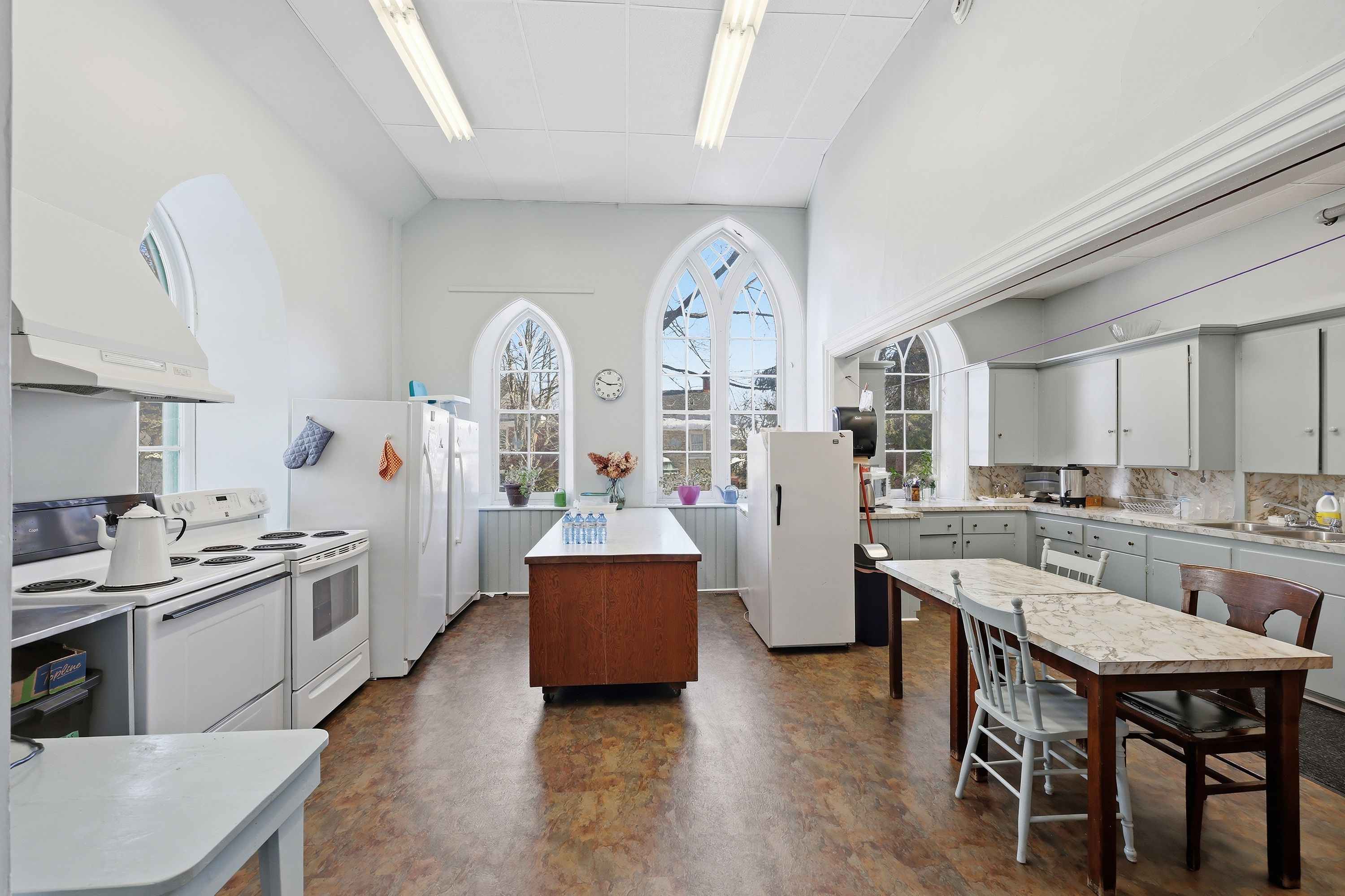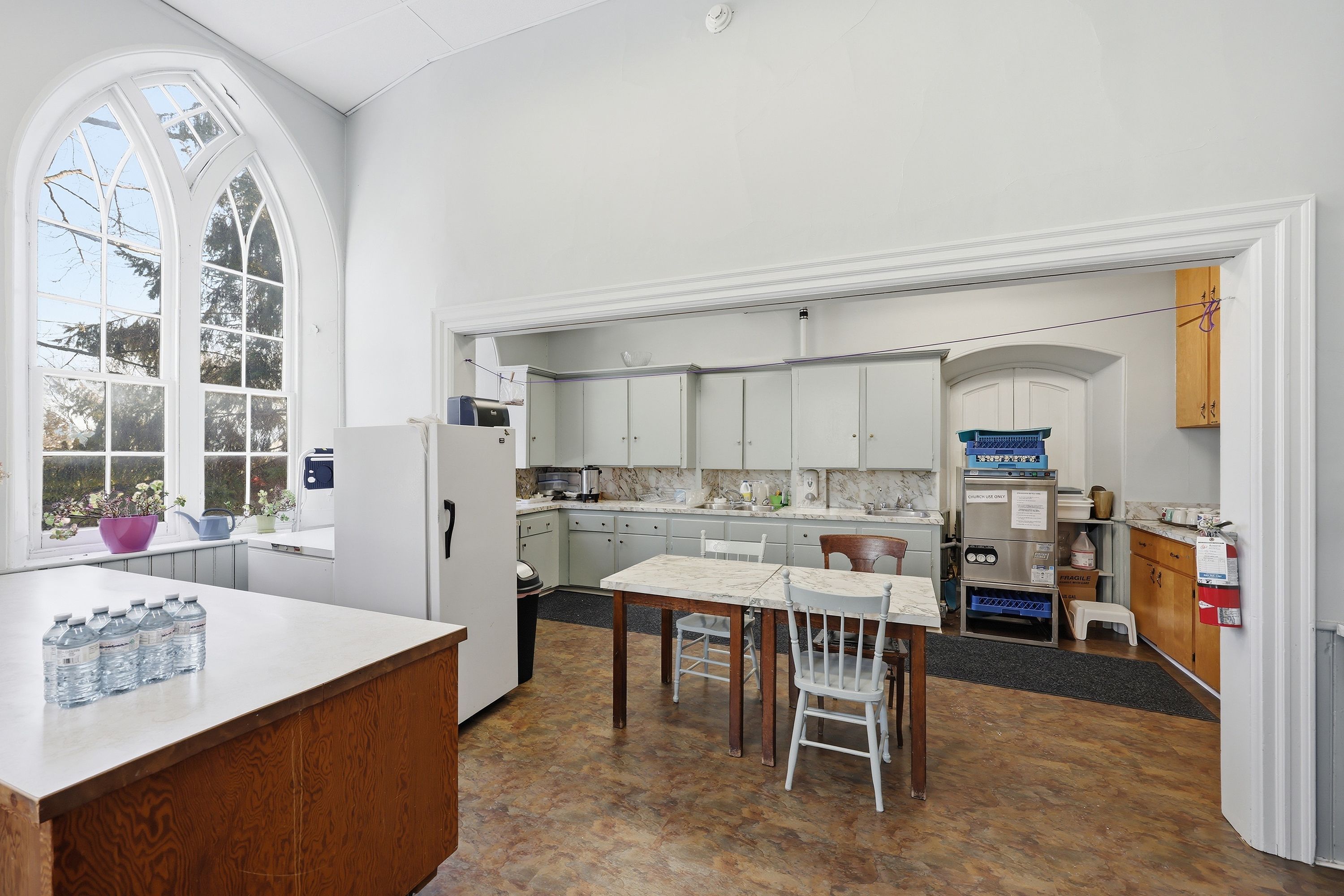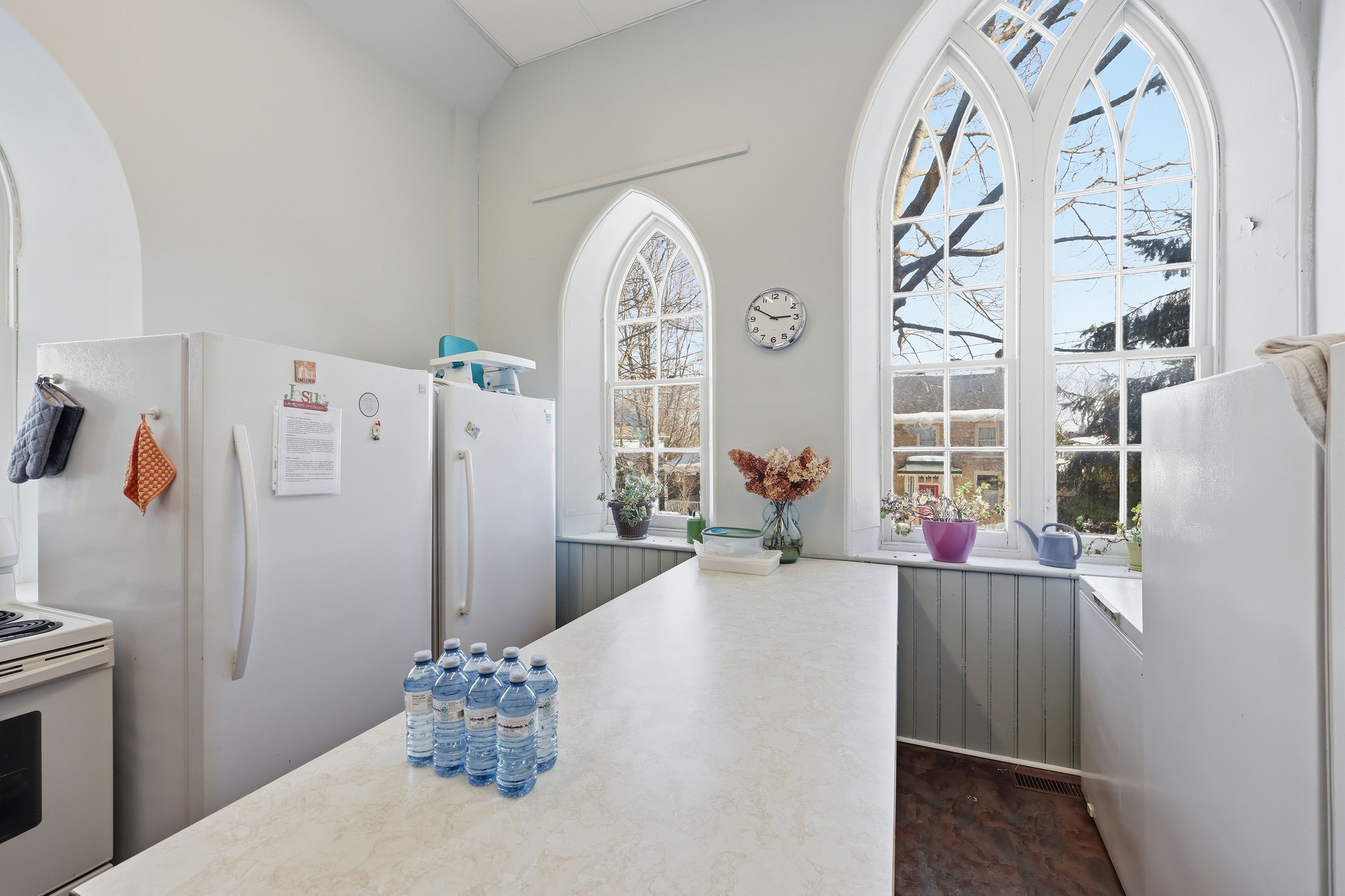 • Stained glass windows and soaring ceilings add unique character.