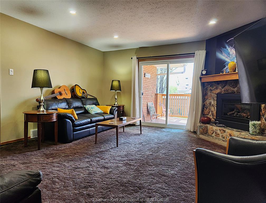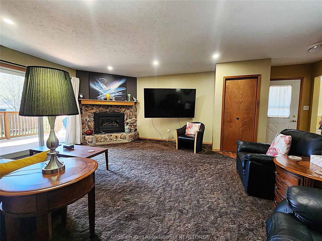 • Bright living room featuring a cozy stone-hearth gas fireplace.