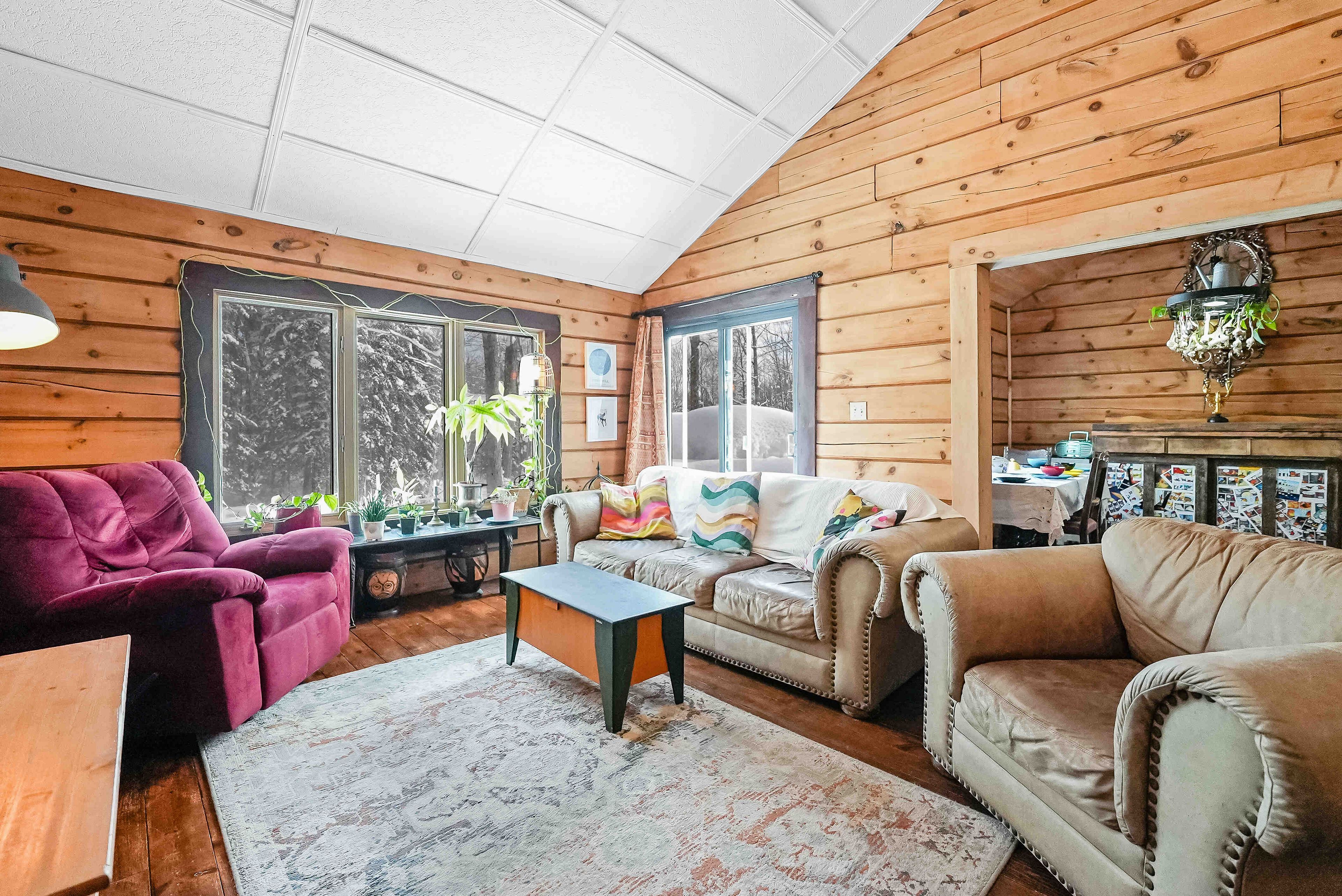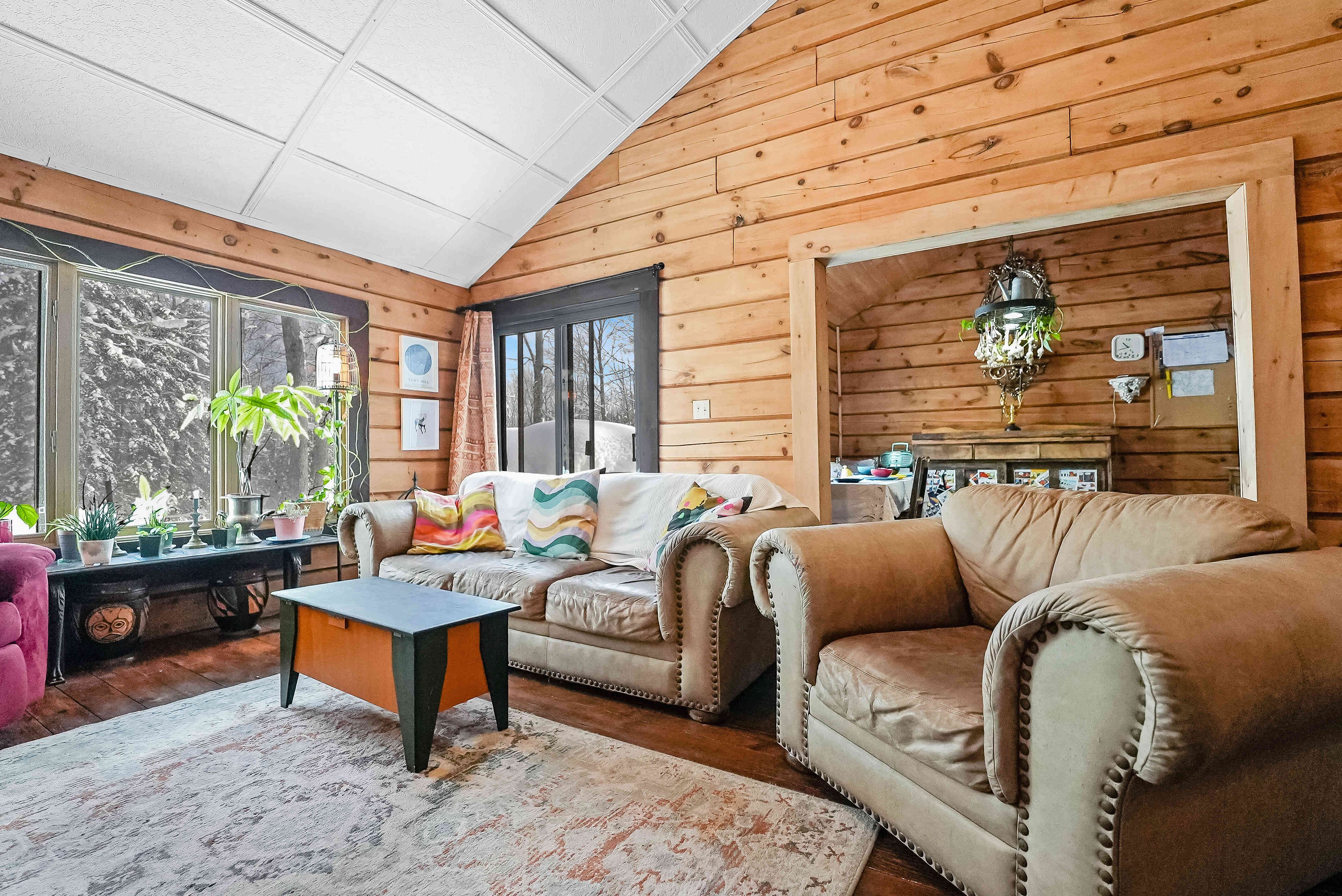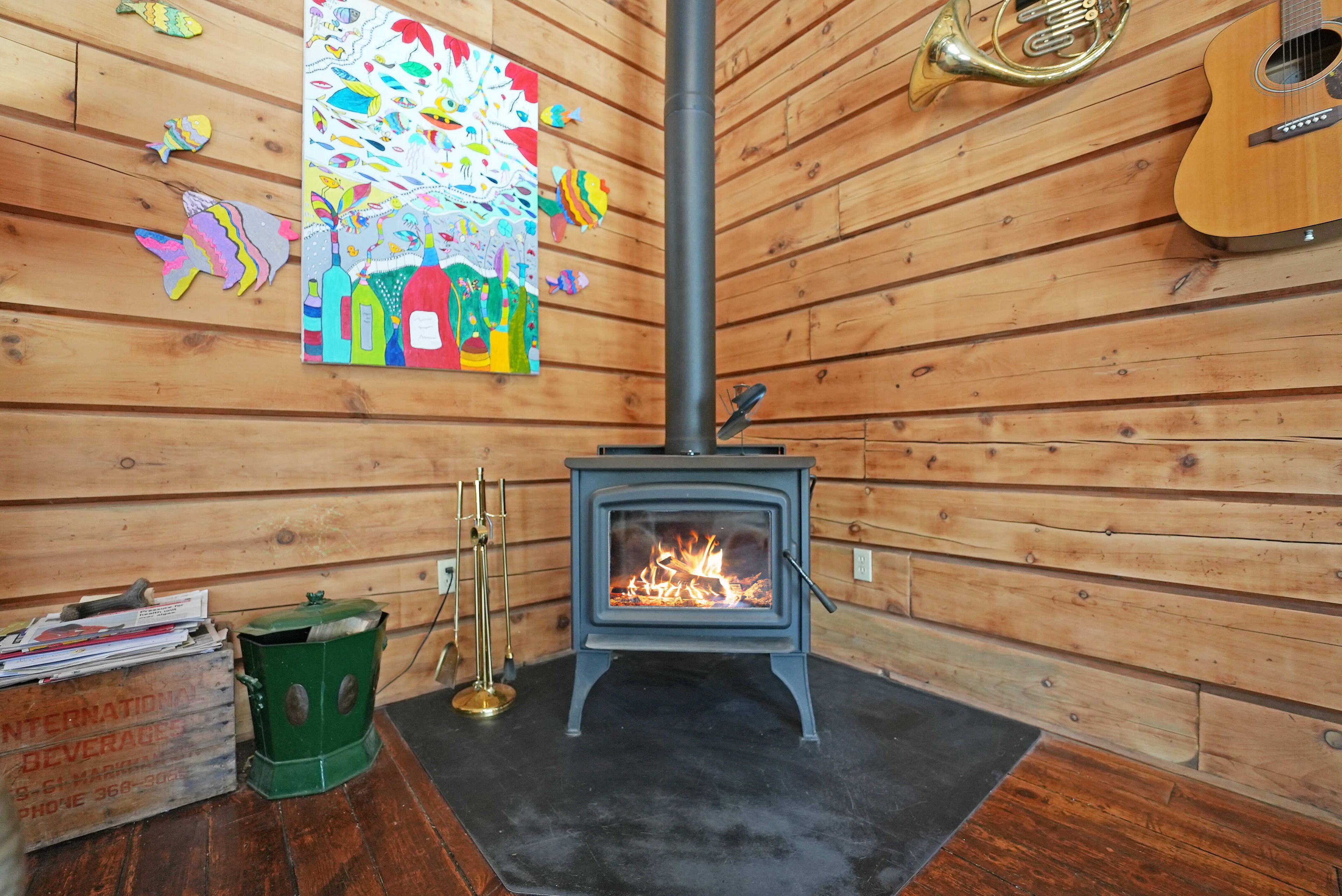 • Main log home features three floors, updated kitchen, and cozy wood stove.
