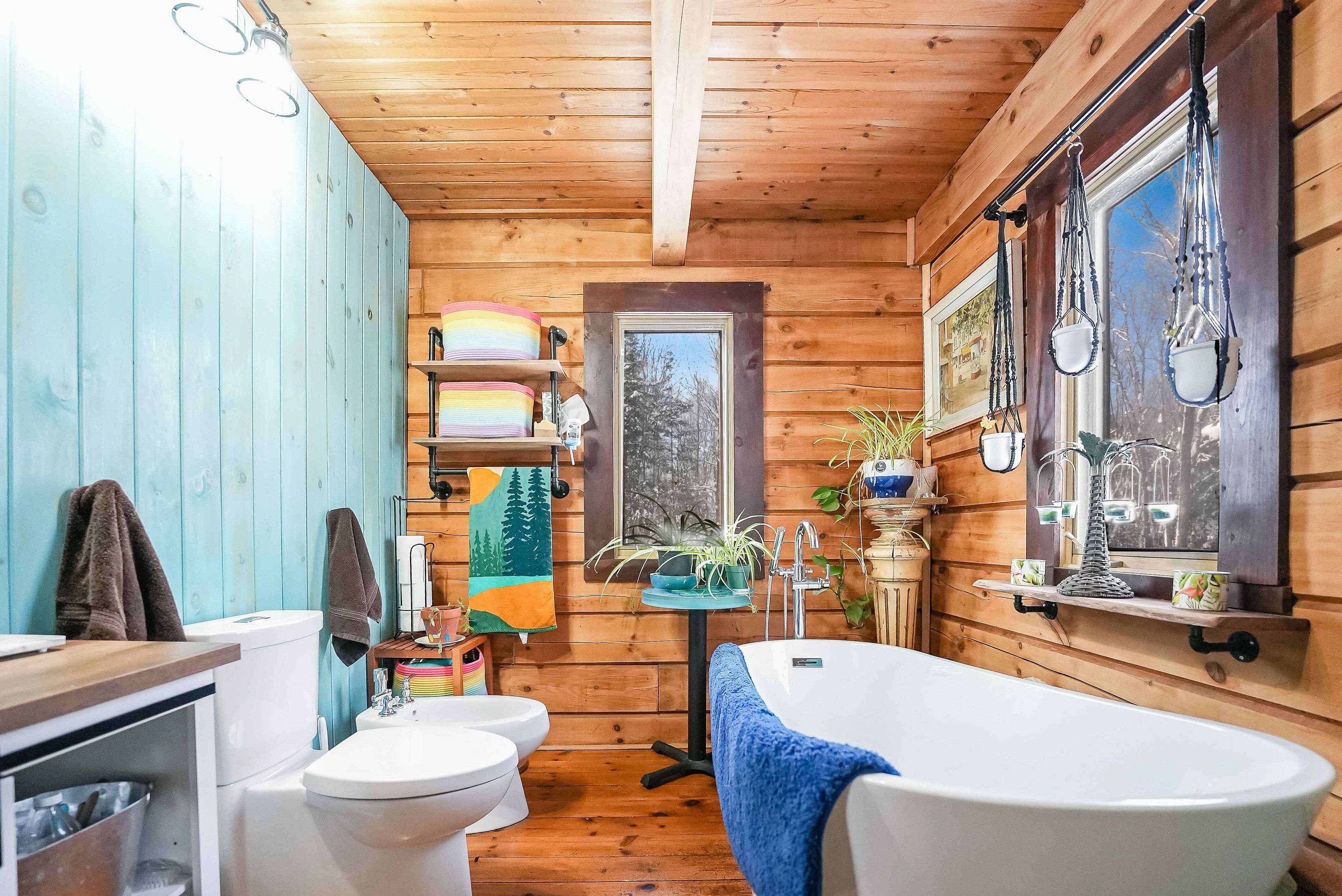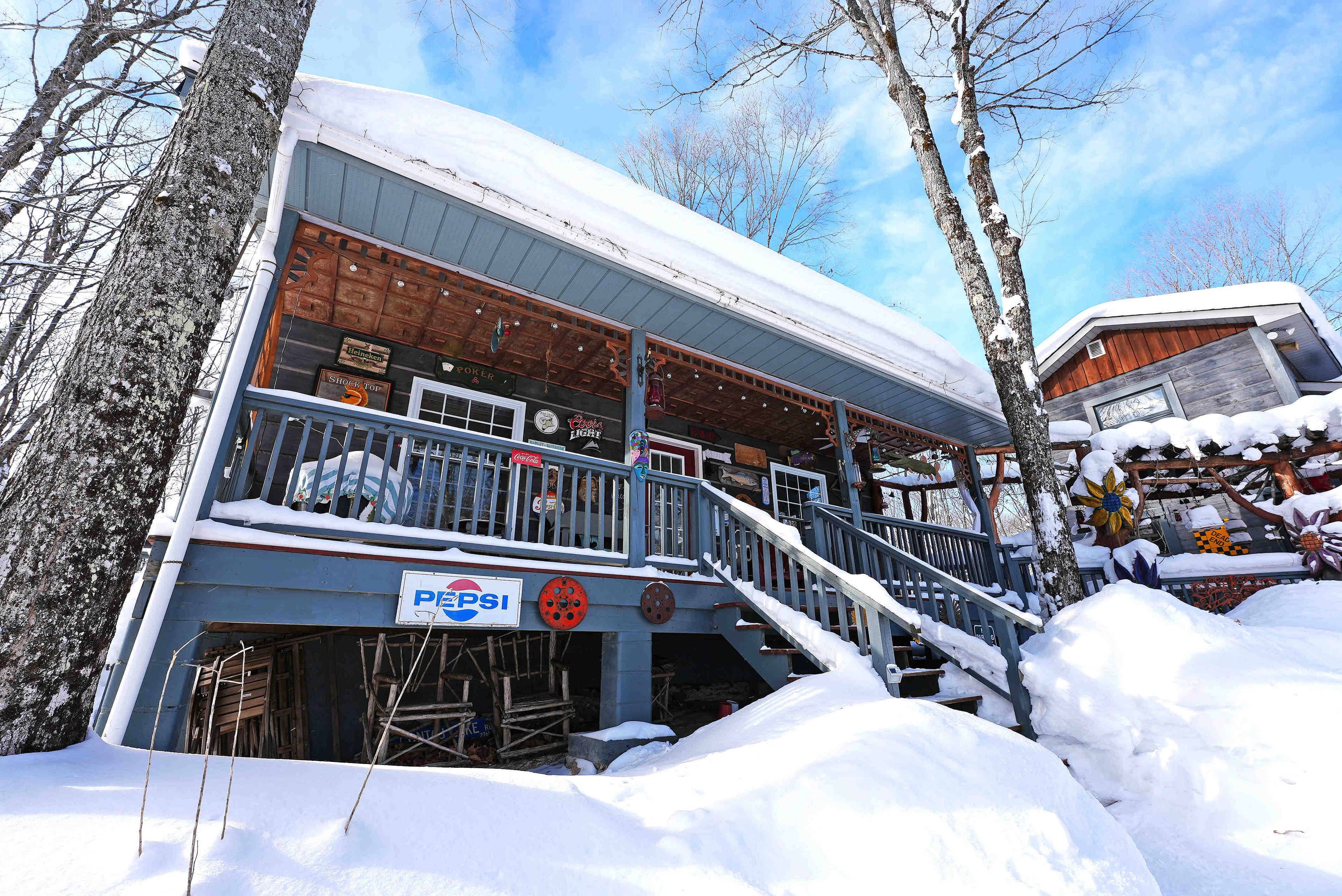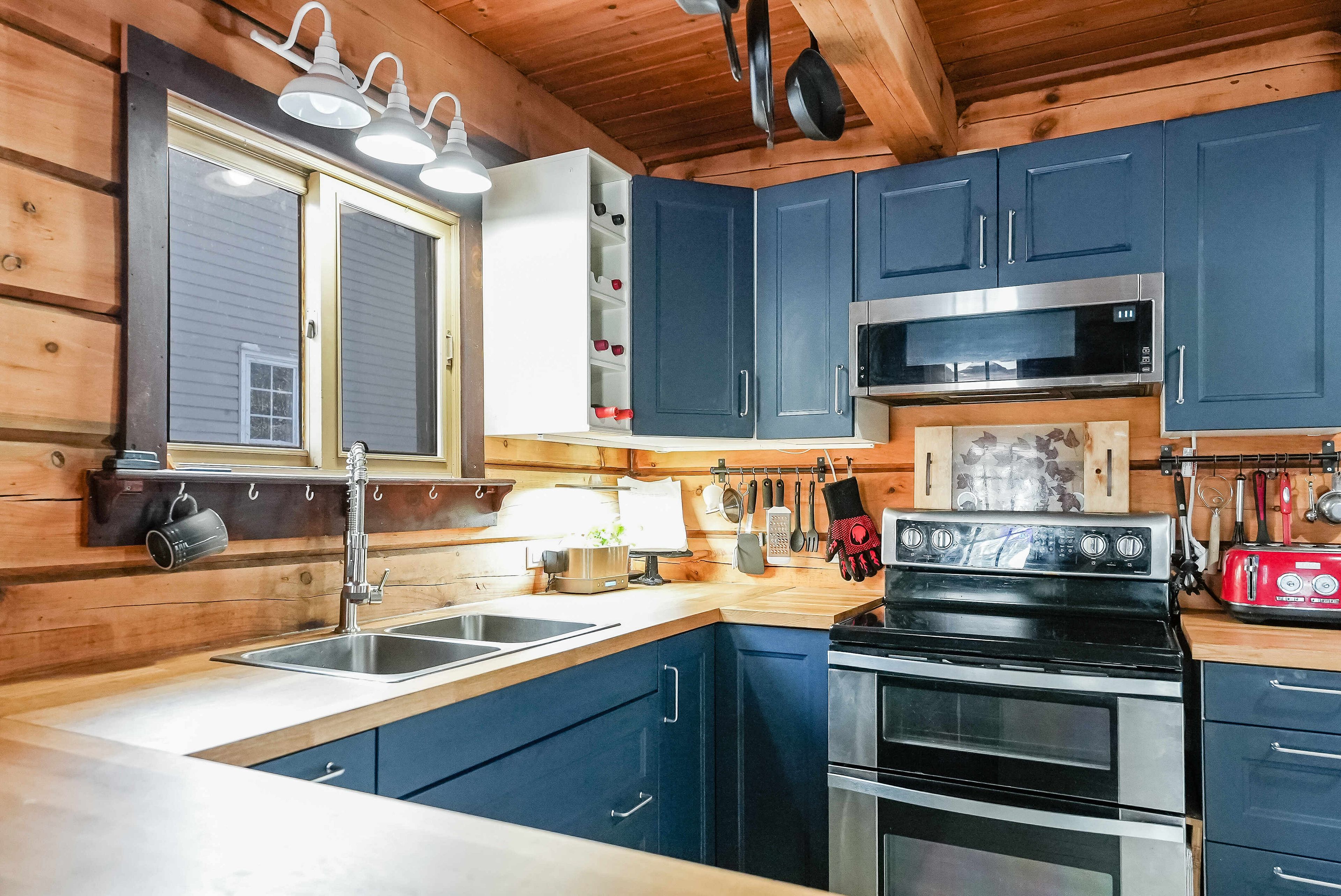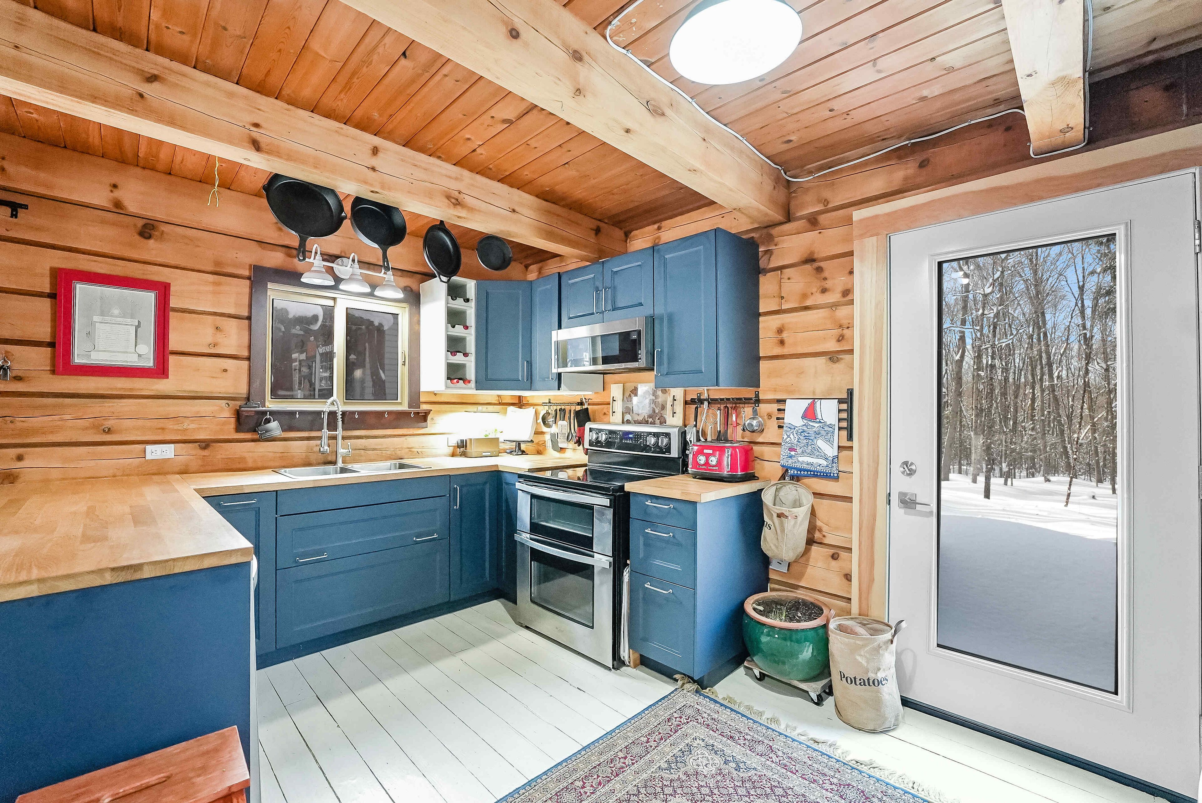• Main log home features three floors, updated kitchen, and cozy wood stove.
