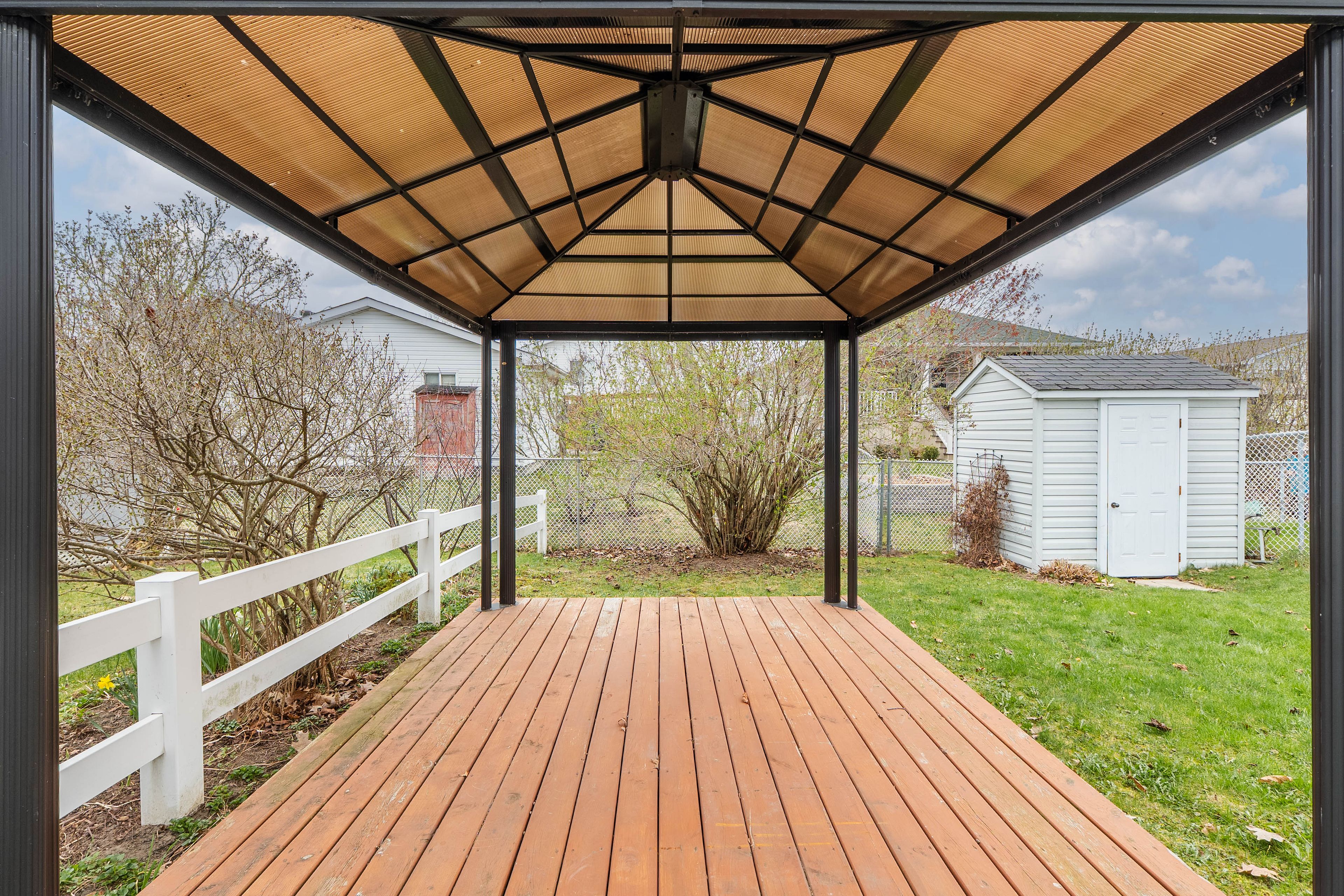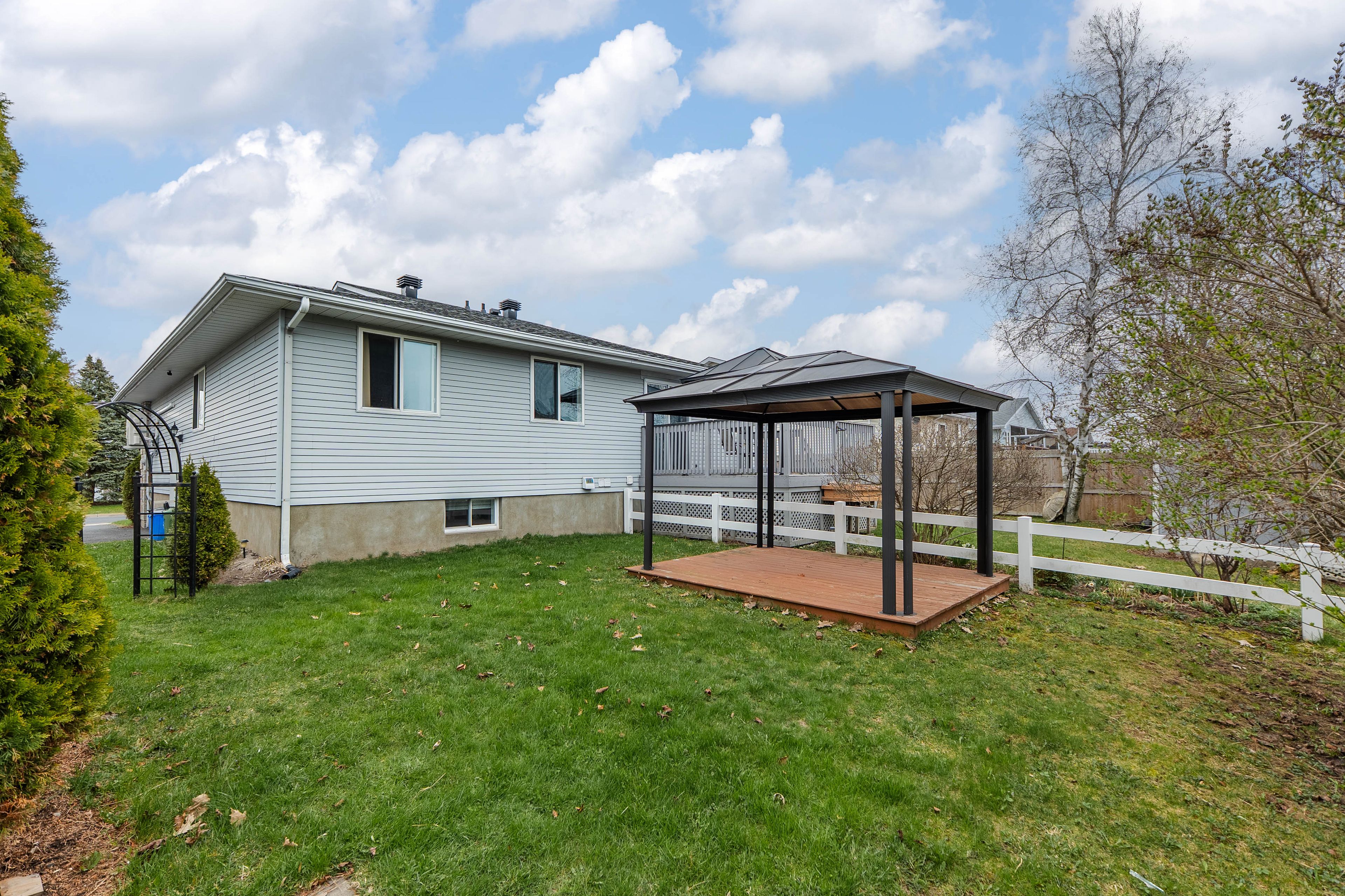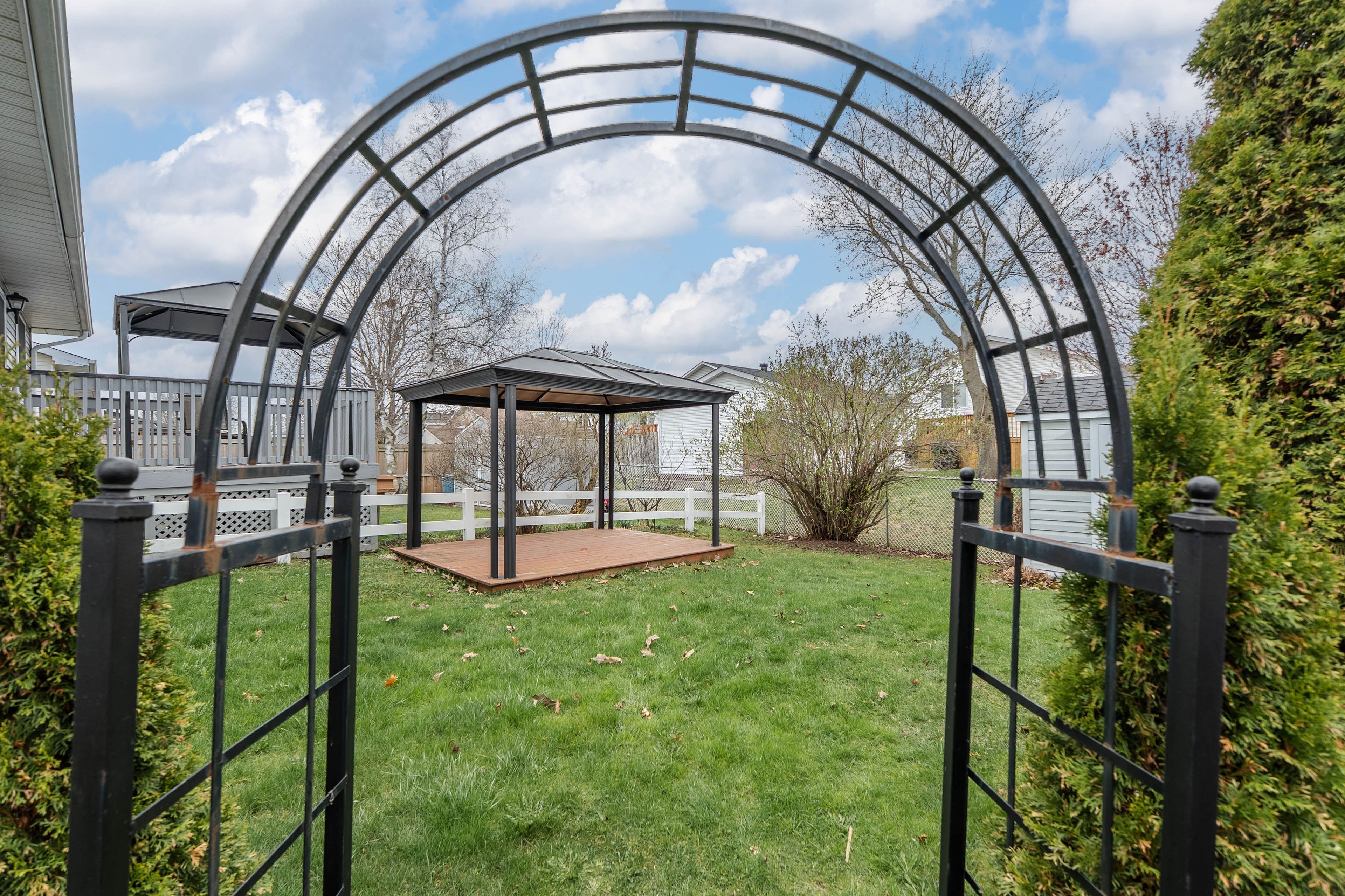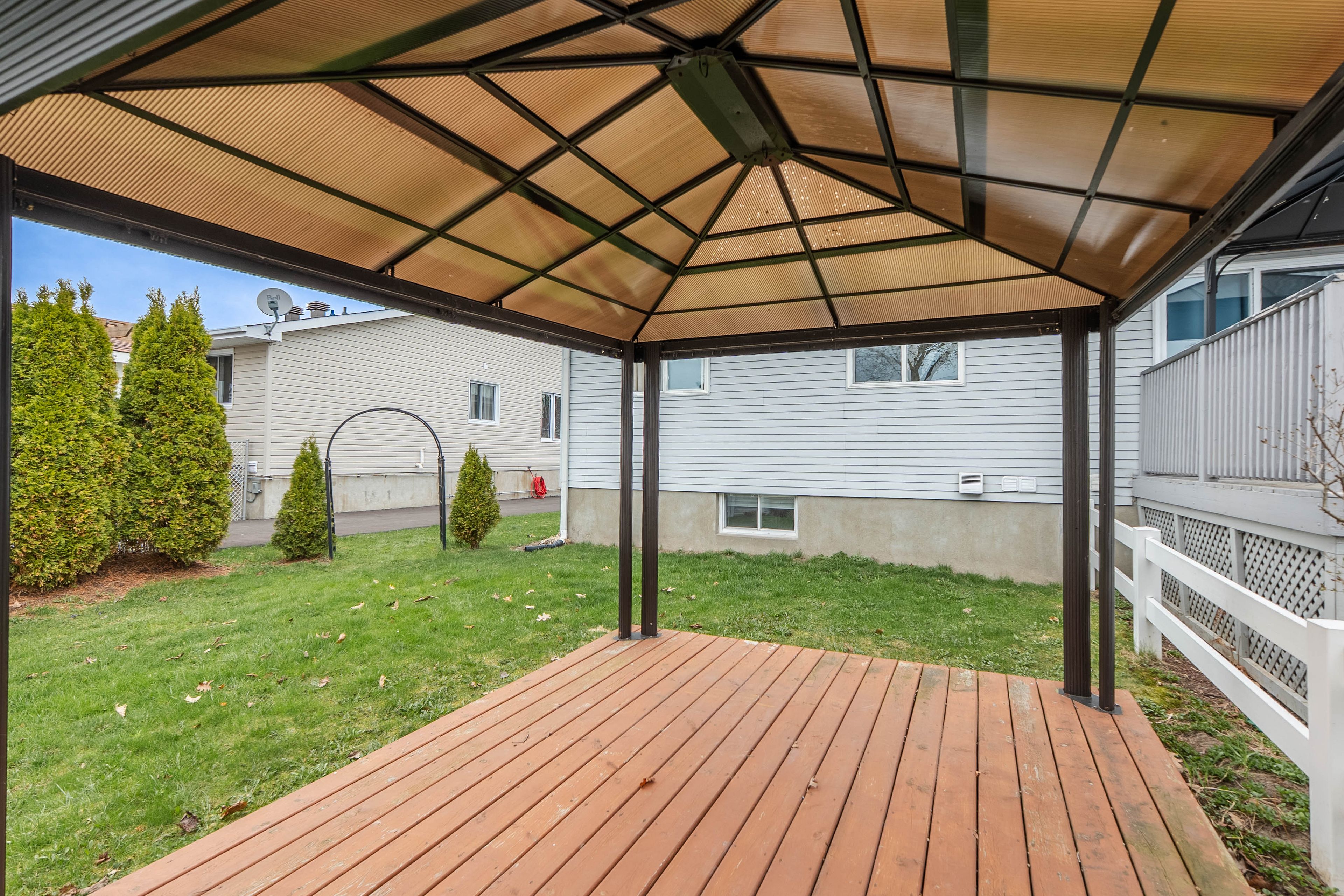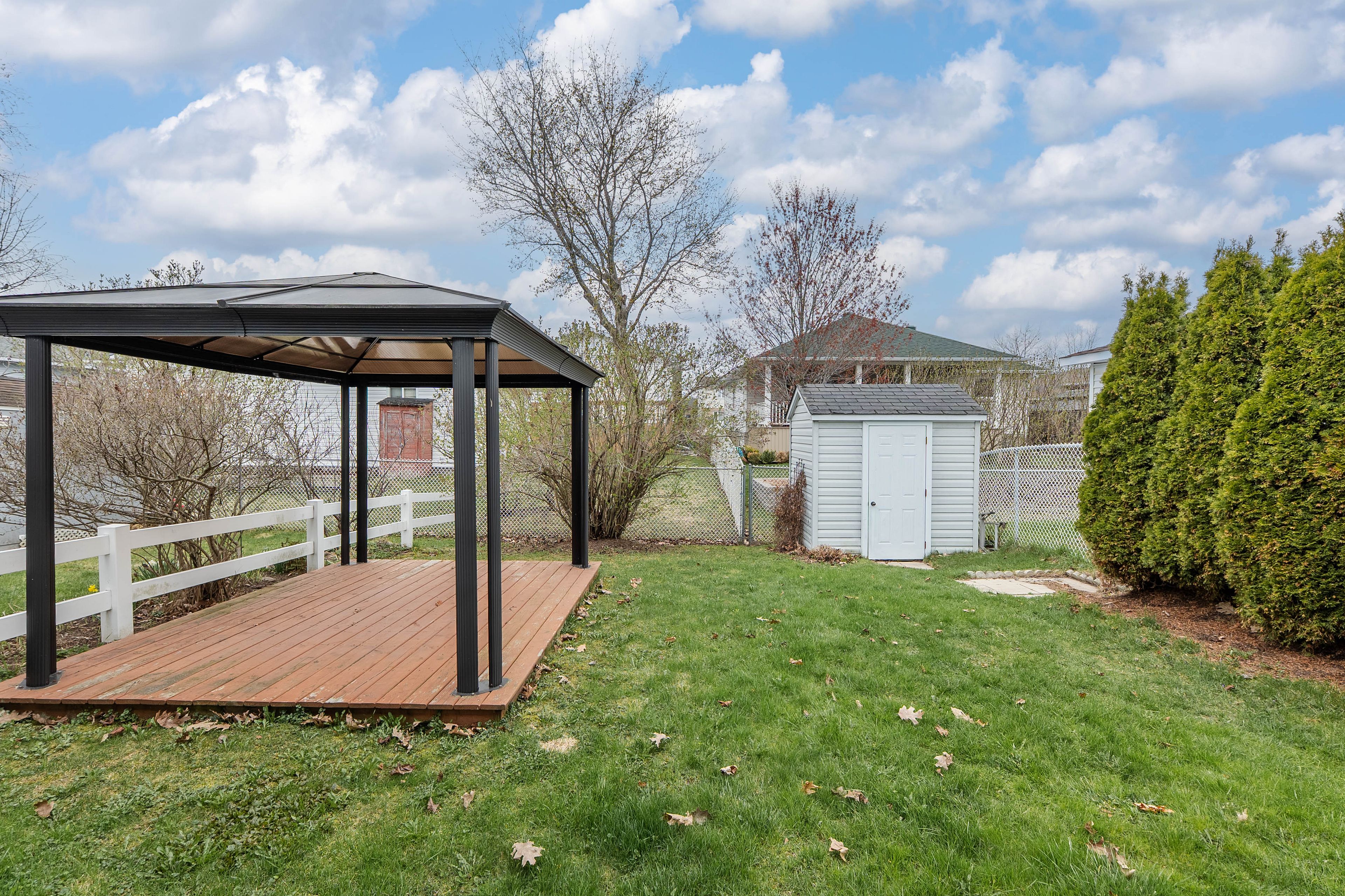 • Cozy backyard with floating deck and gazebo for relaxation.