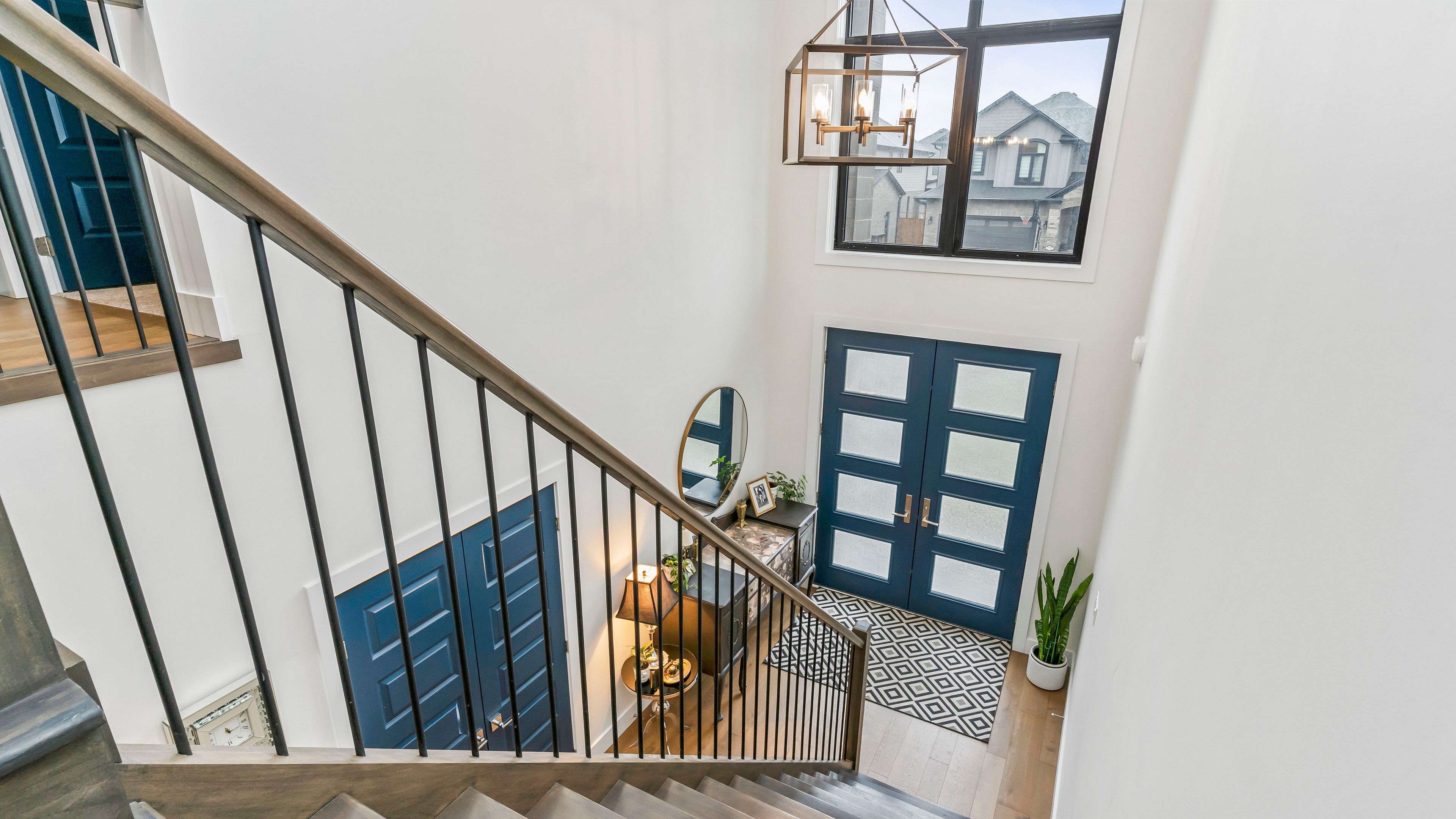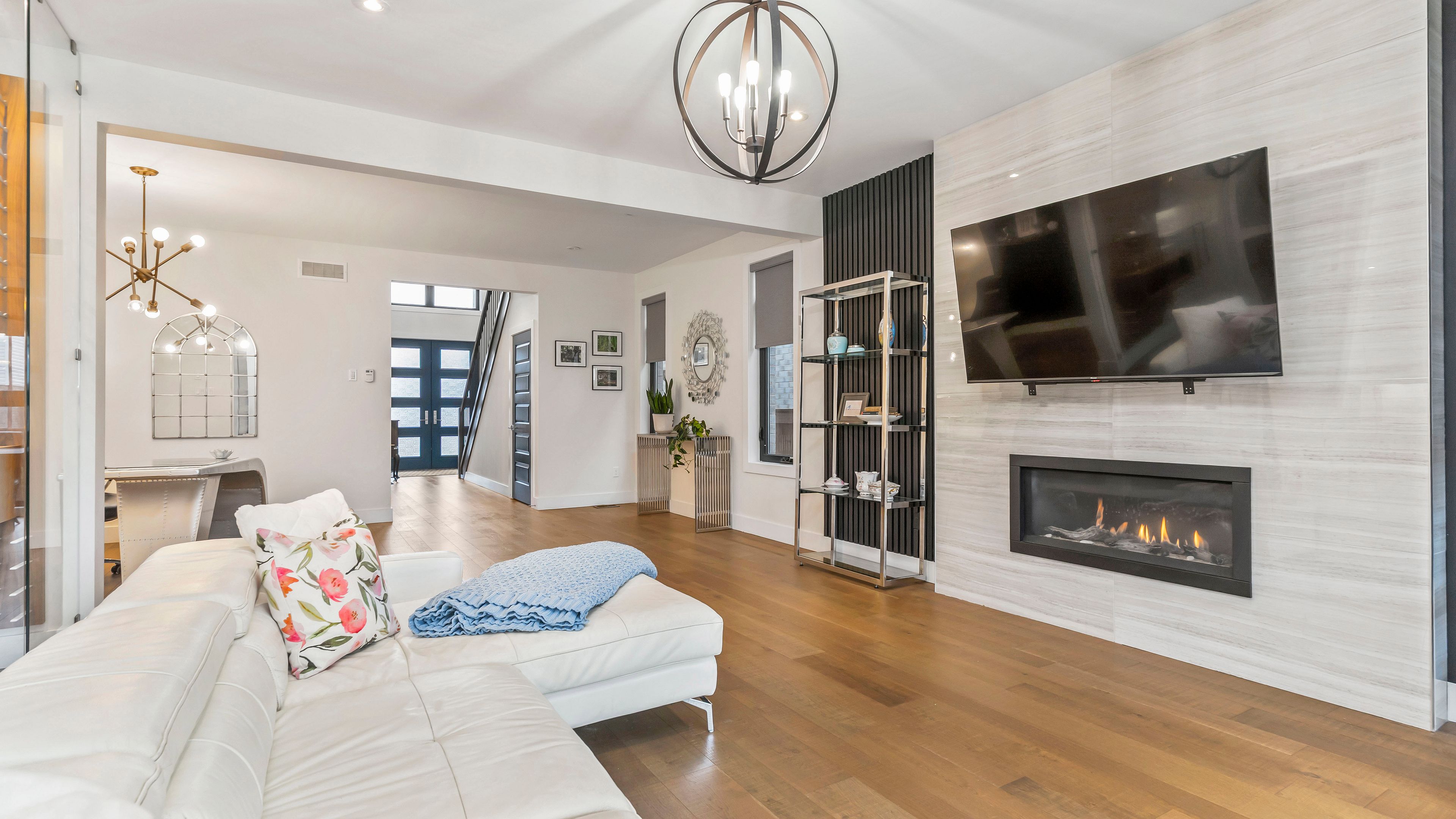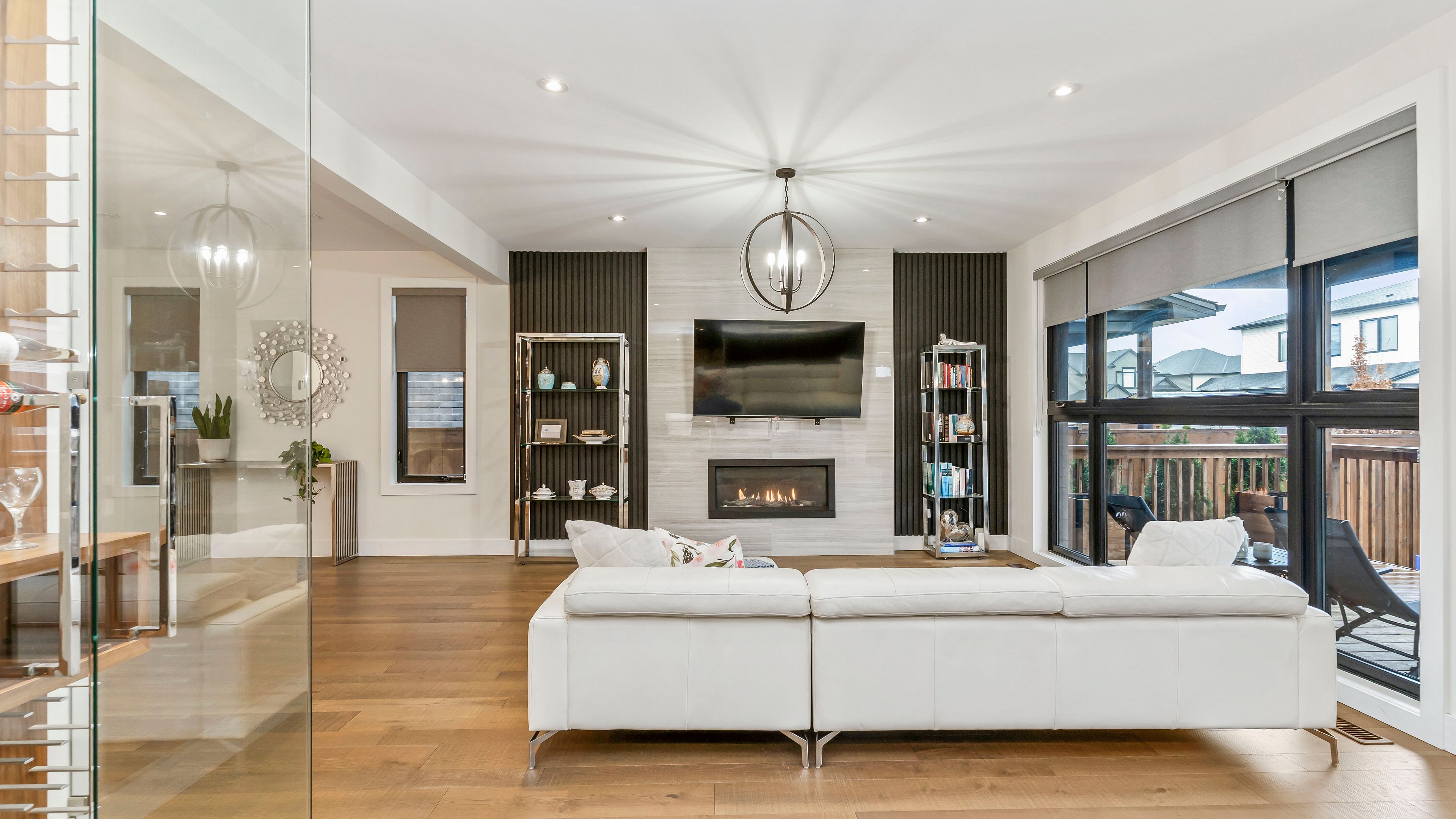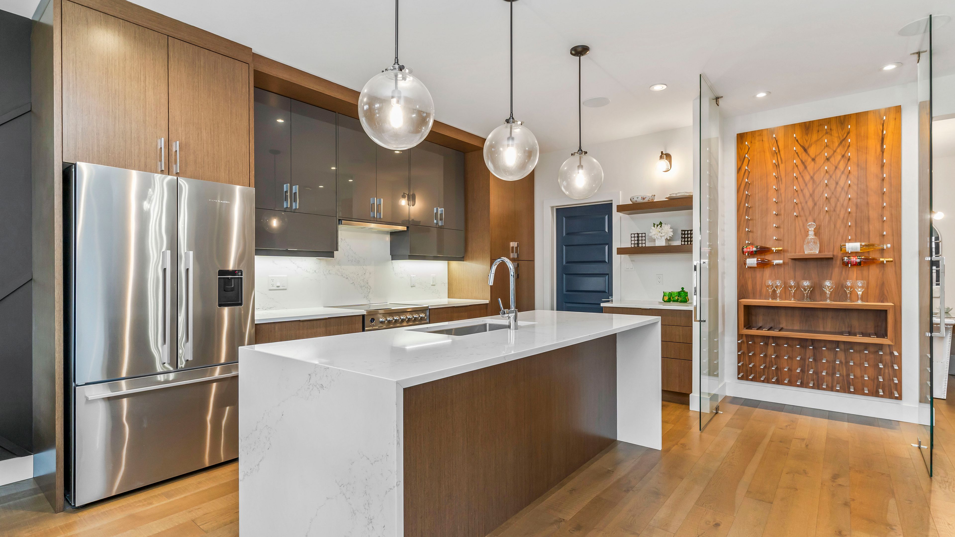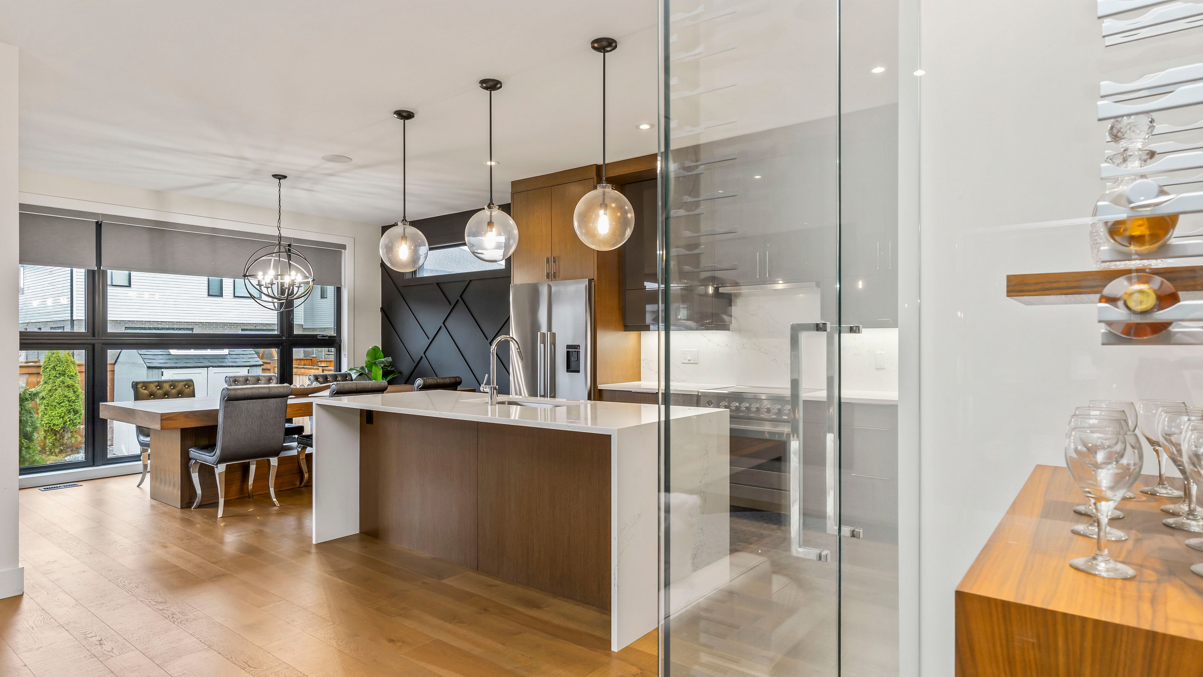 • Open-concept main floor featuring a striking glass wine cabinet.