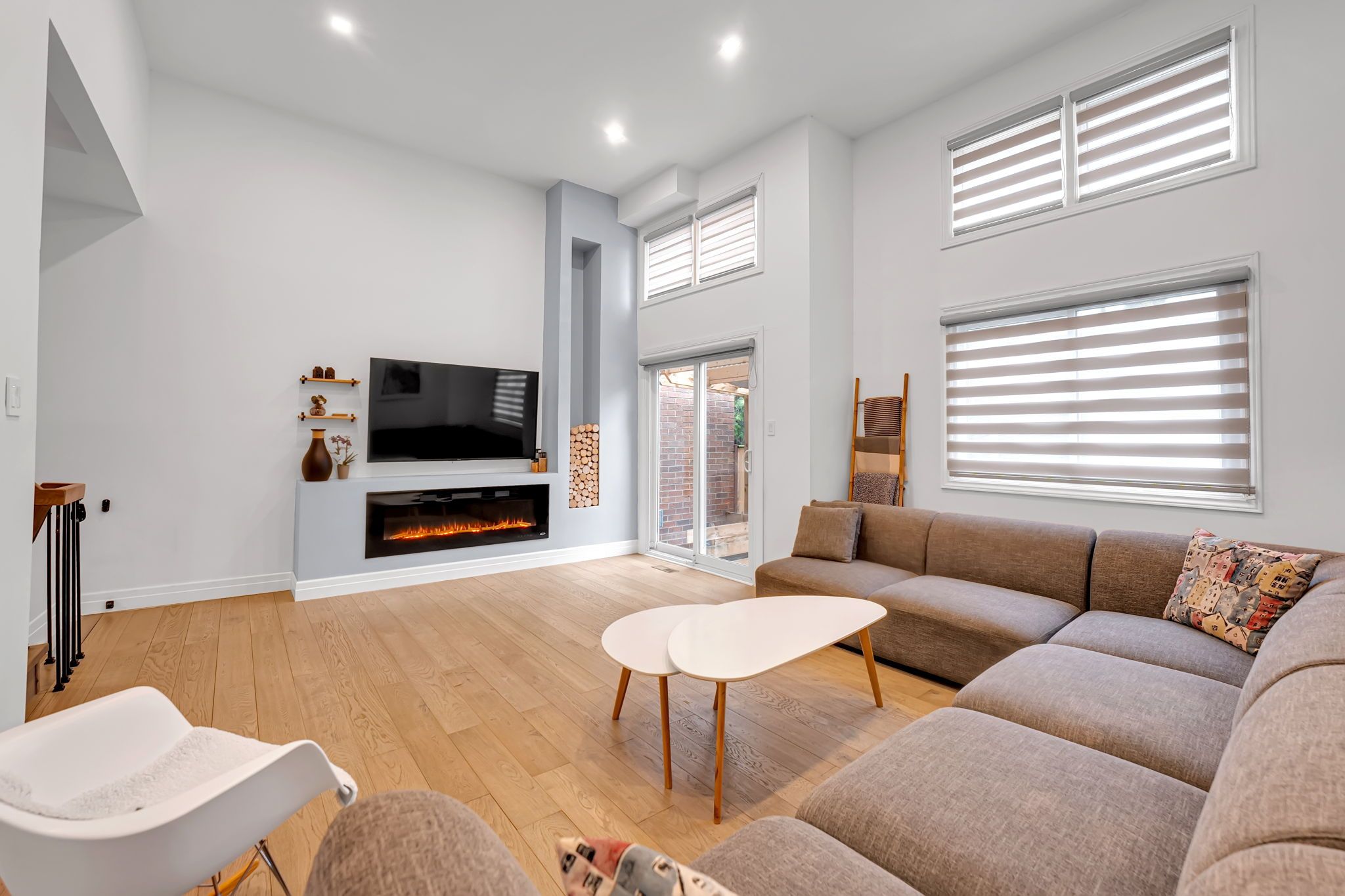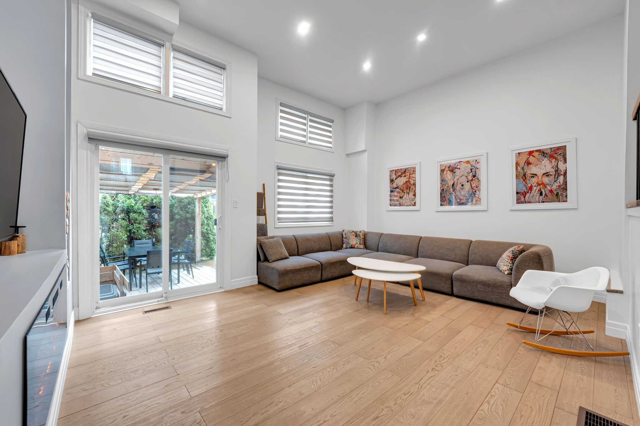 • Spacious living room with cathedral ceilings and fireplace, leads to private backyard.