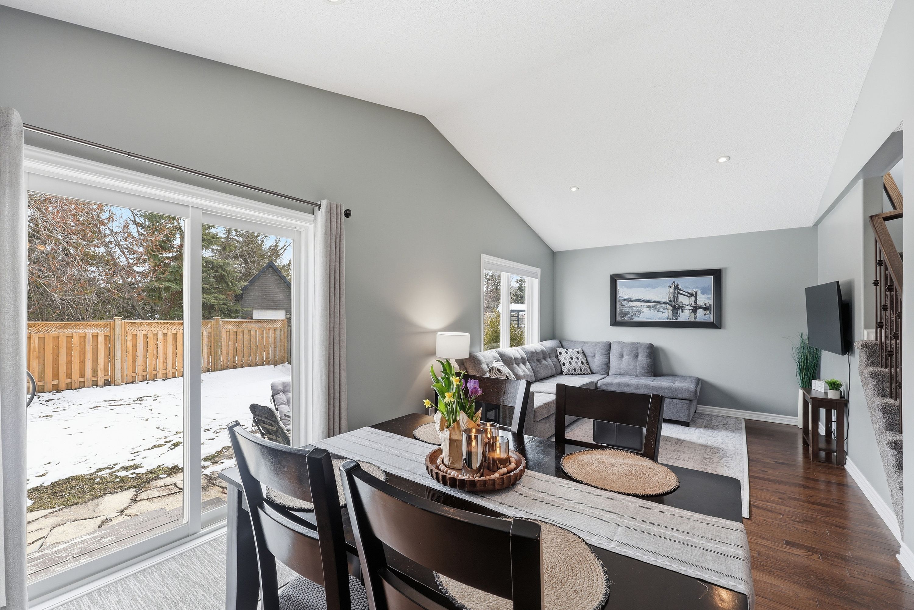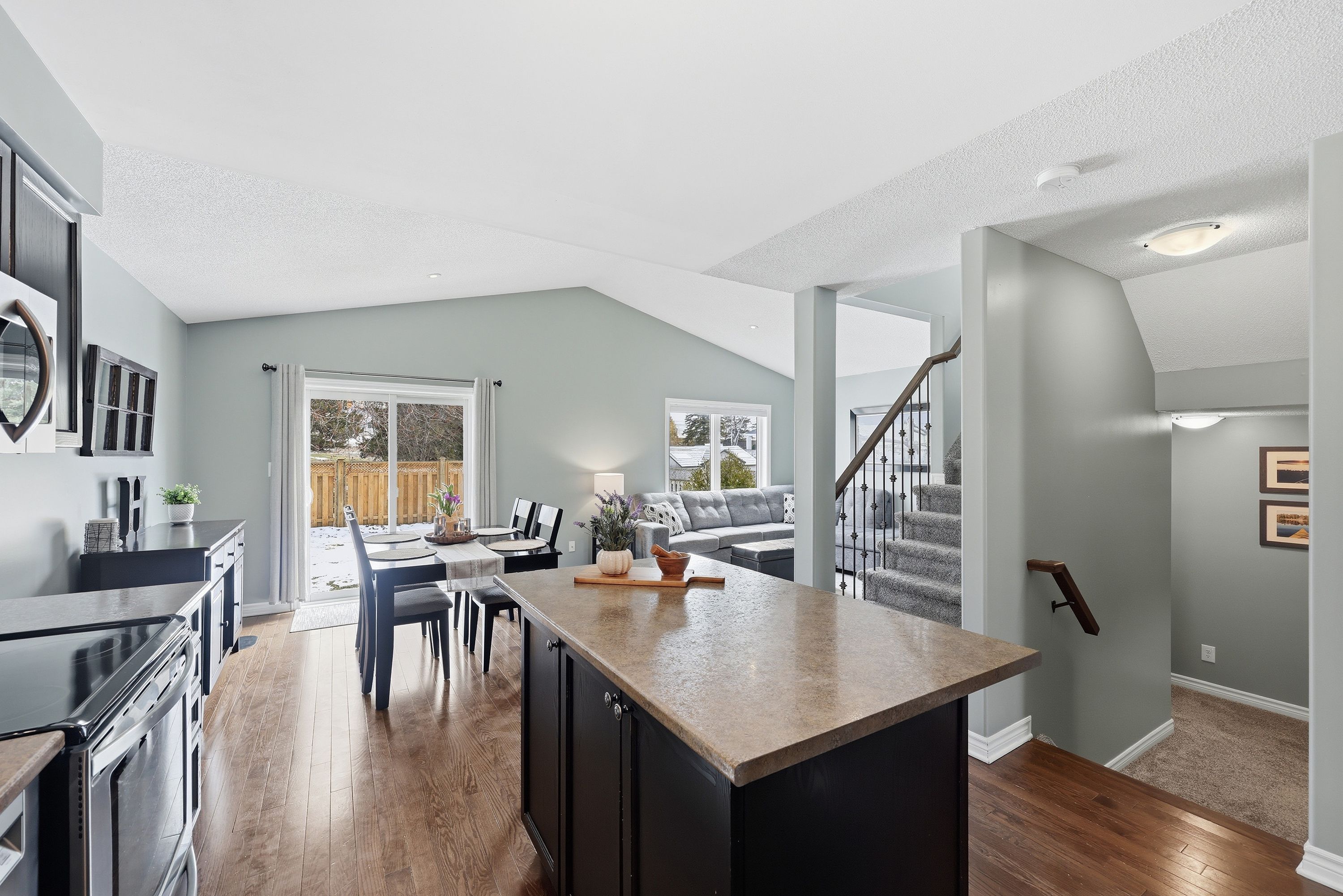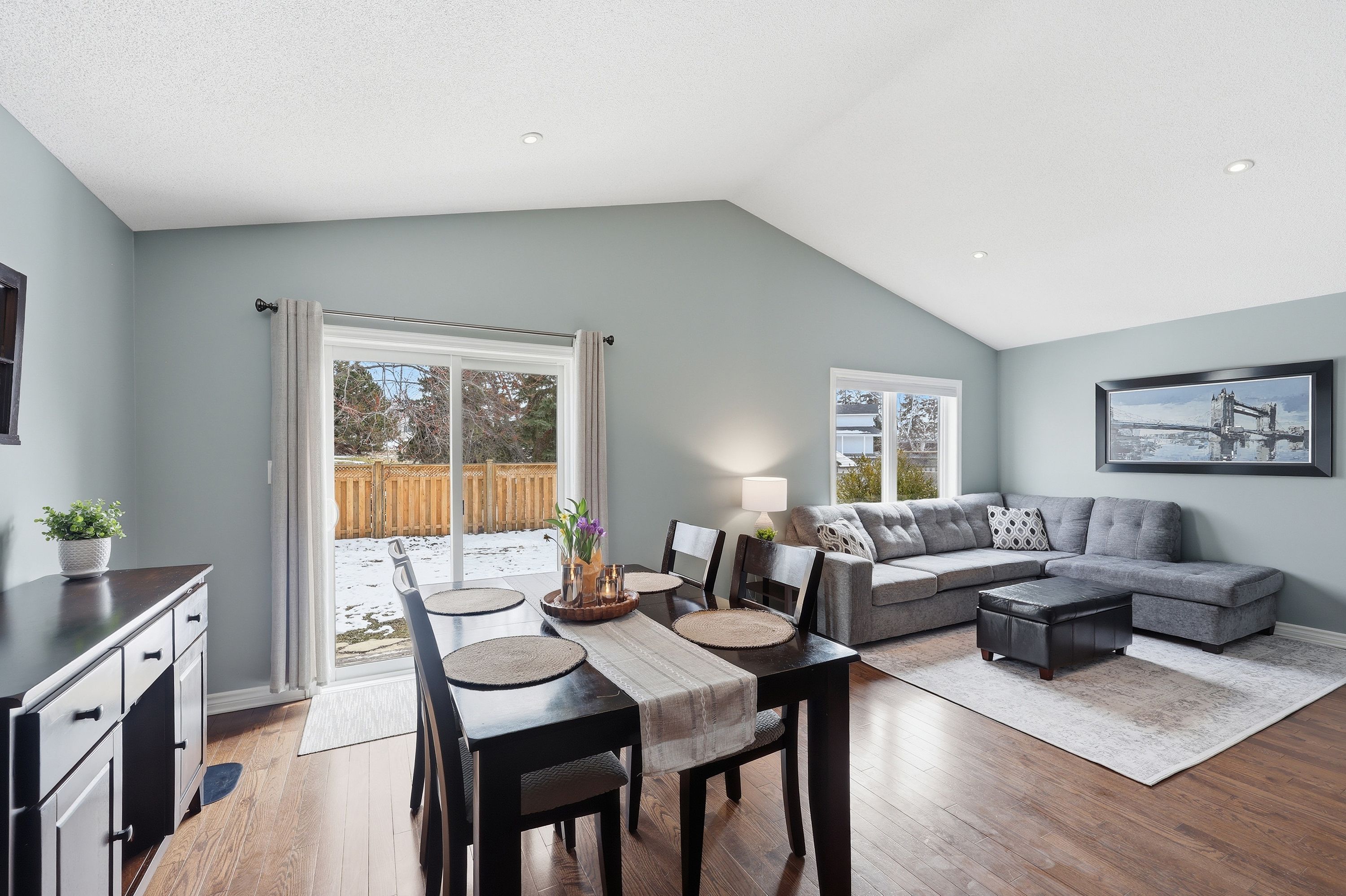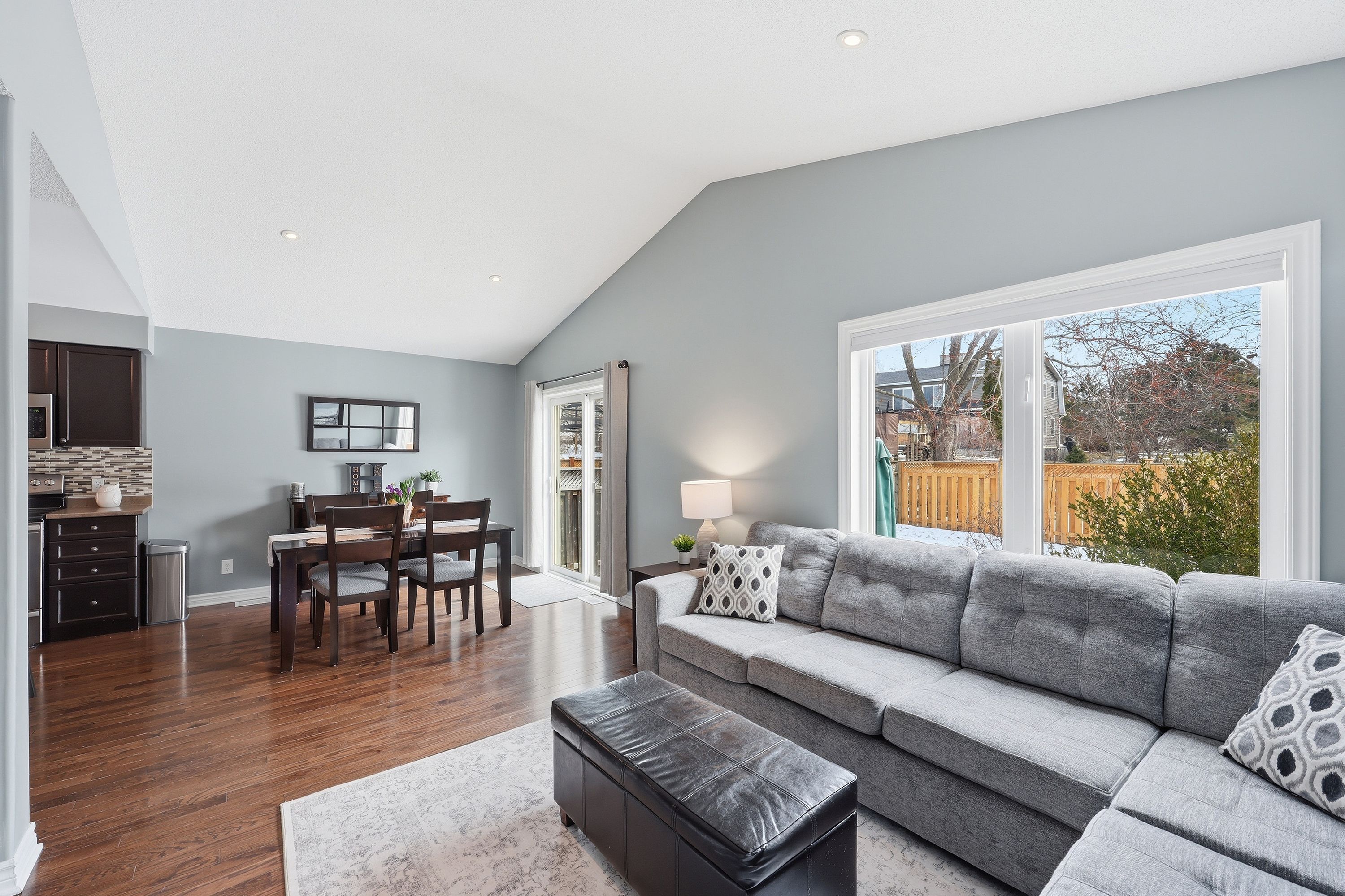 • Bright carpet-free main floor with an open layout and vaulted ceiling.