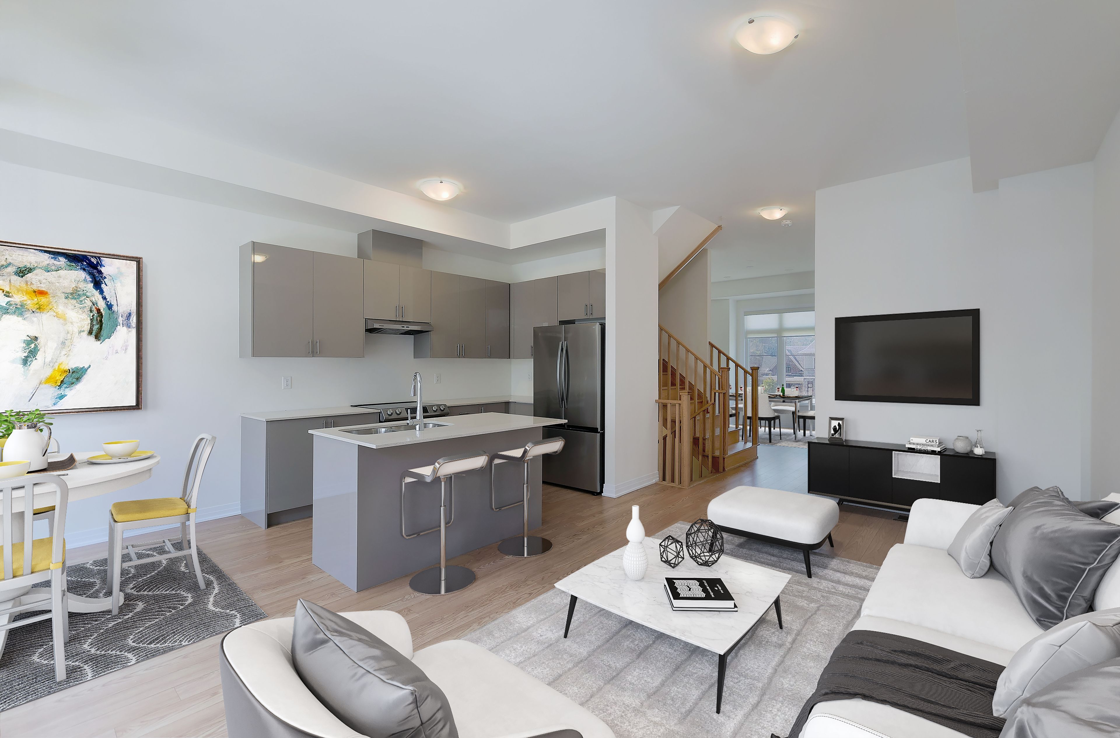 • Open-concept main level with high ceilings for a bright atmosphere.