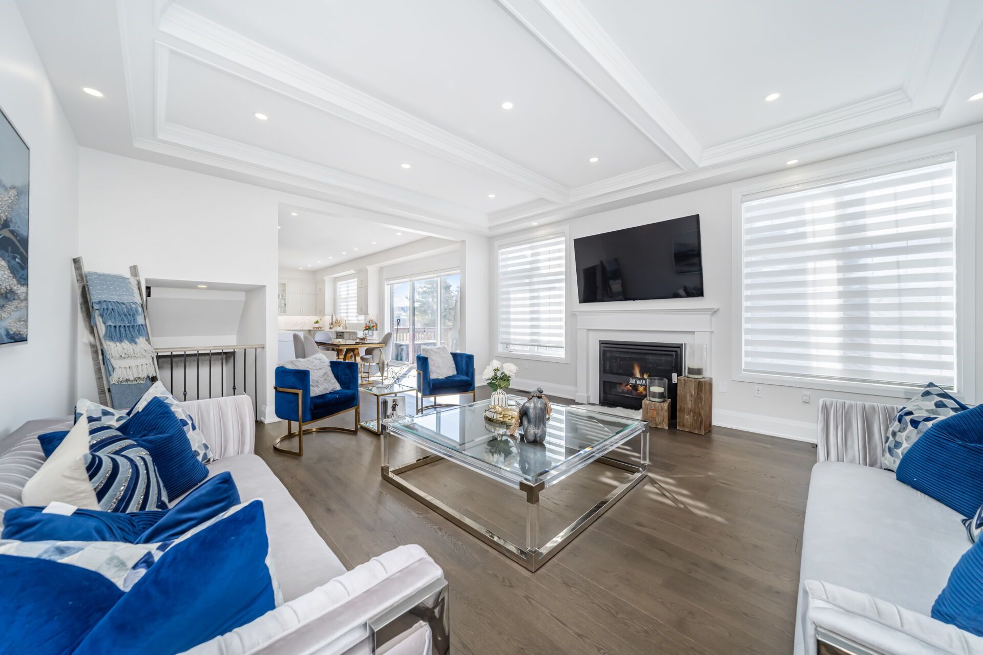 • Inviting family room featuring a cozy gas fireplace and custom wall.