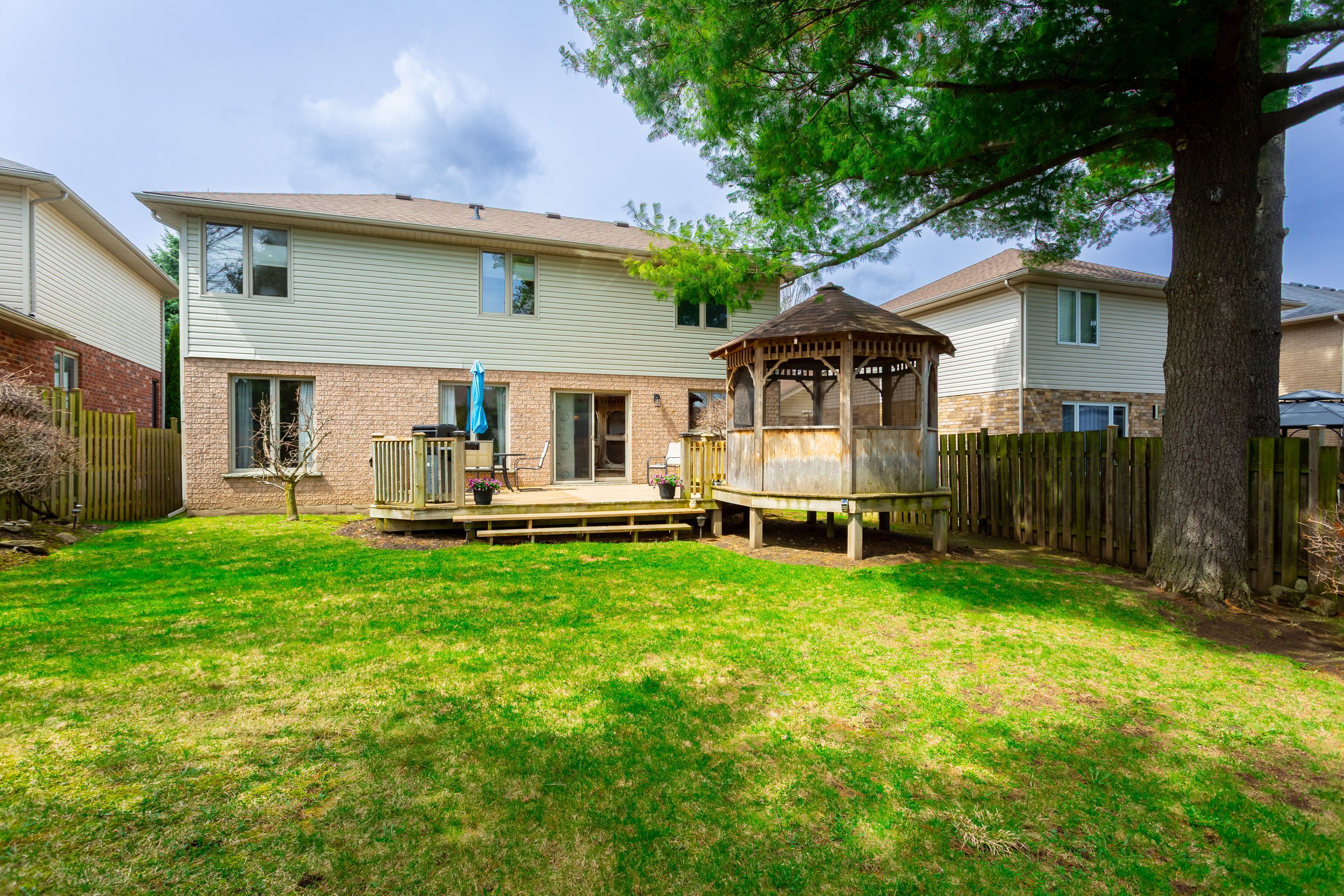 • Large fully fenced yard with a screened gazebo and generous deck.
