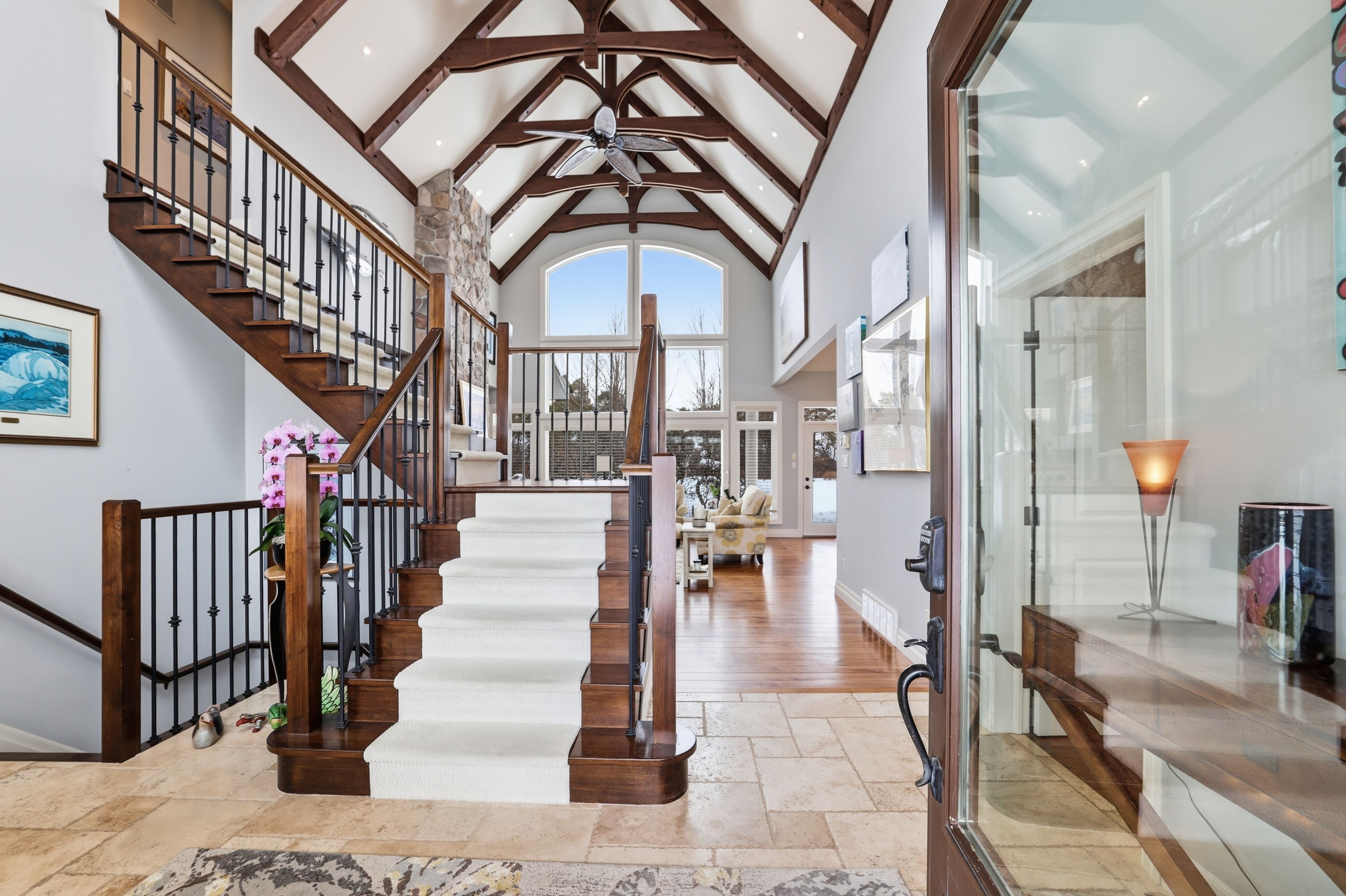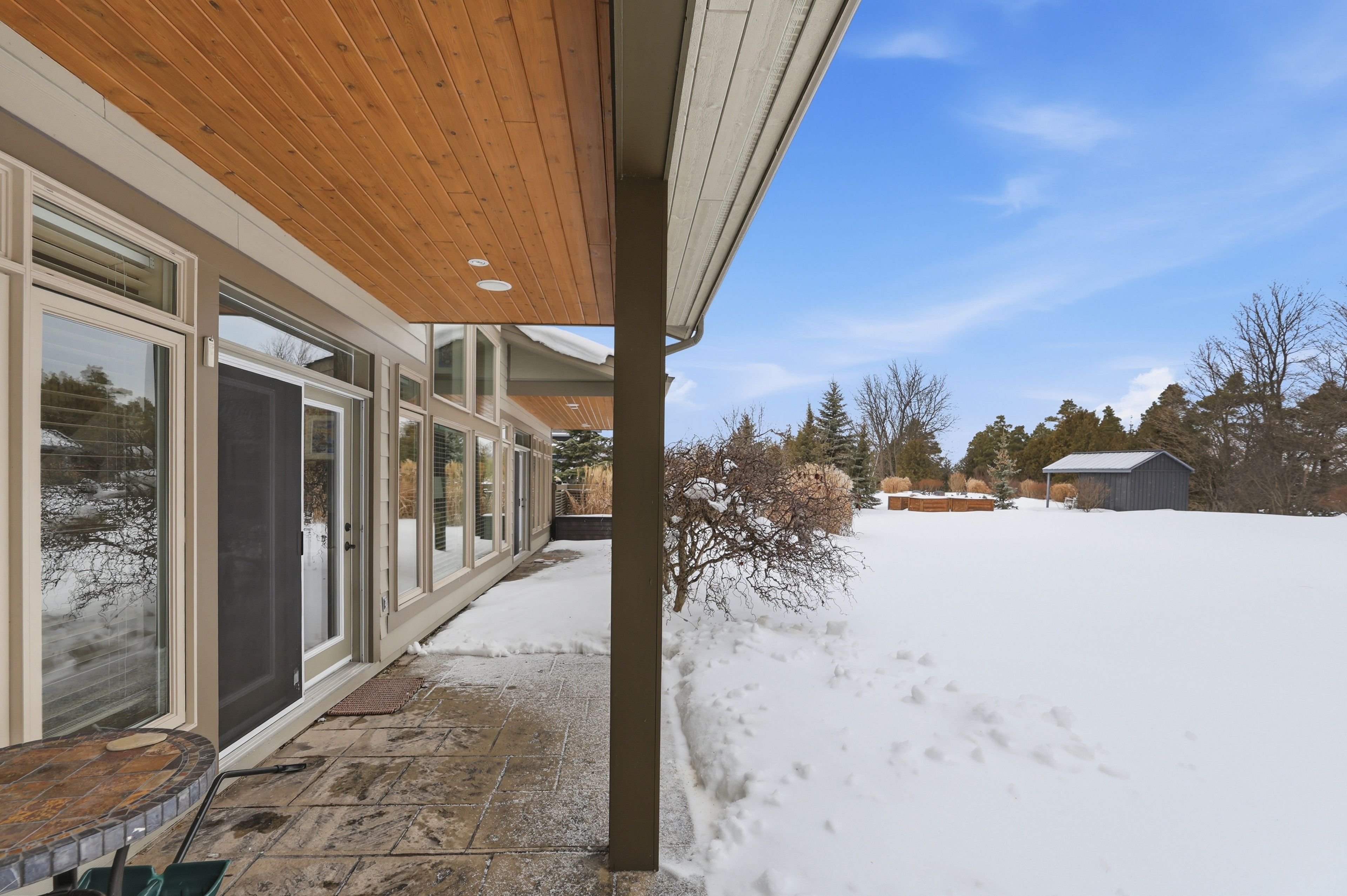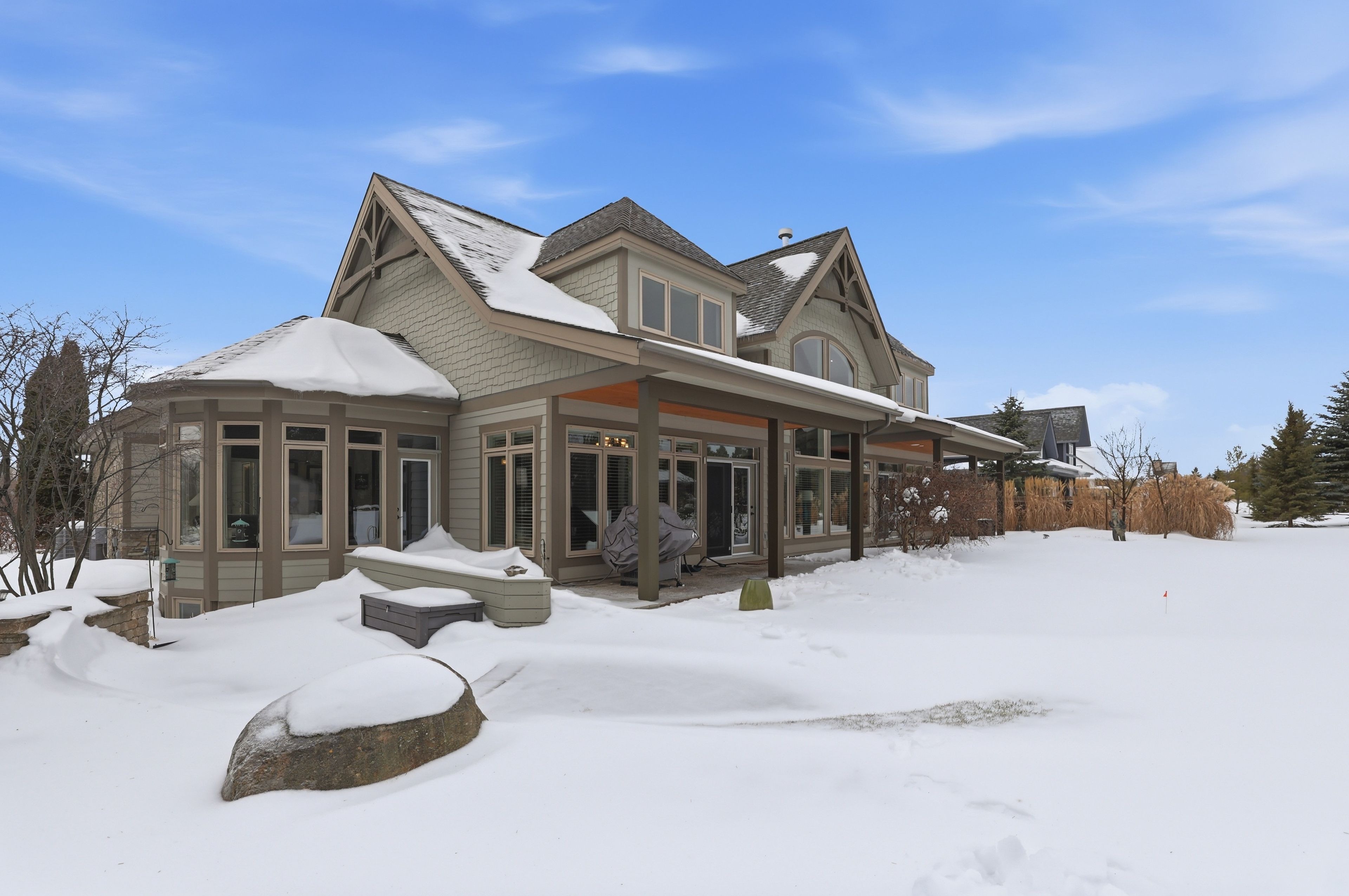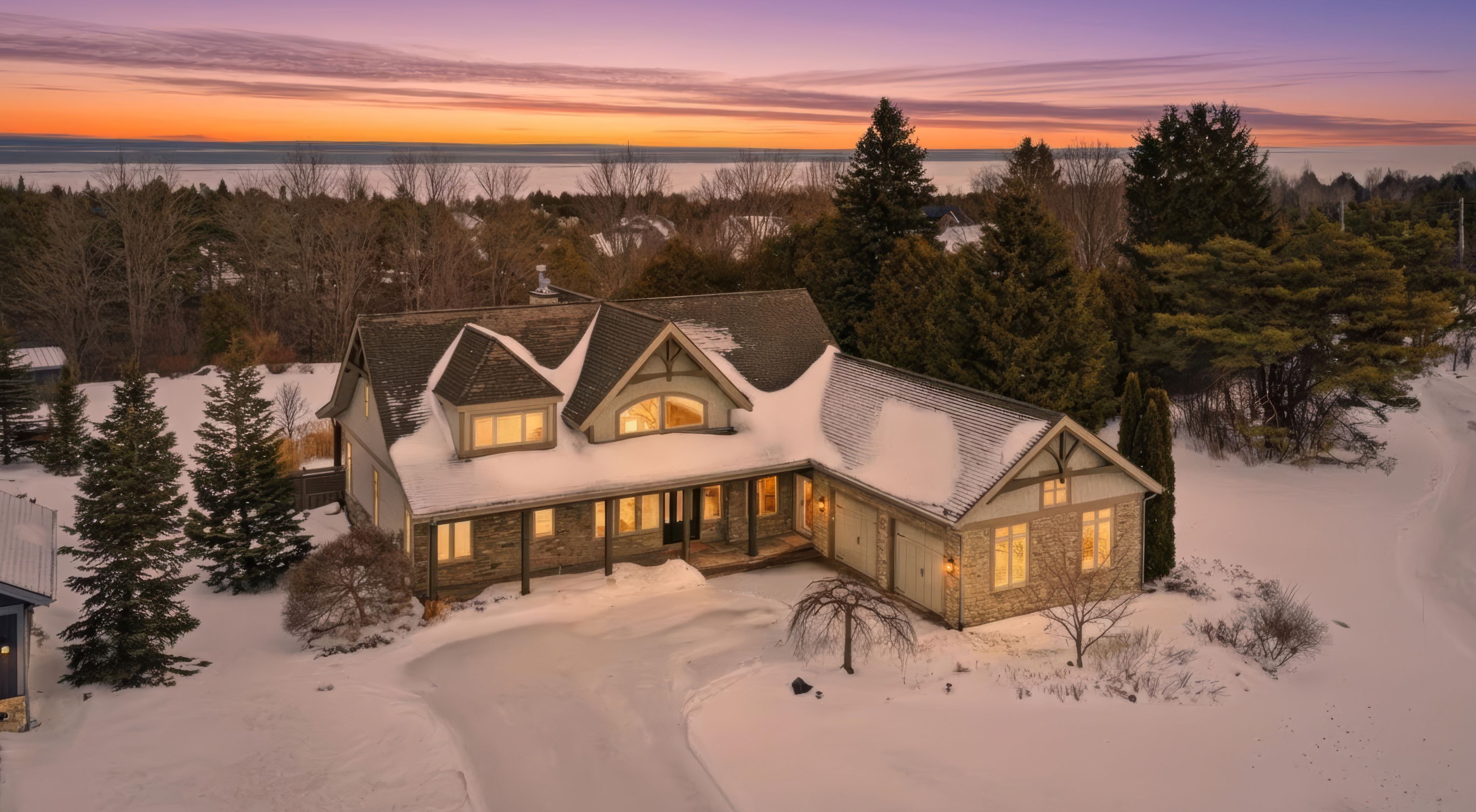 Welcome to 176 high bluff lane in the sought-after trailwoods community of thornbury, a beautifully crafted custom home offering exceptional main-floor living just moments from the water, trails and vibrant downtown. Designed with comfort and elegance in mind, the main level showcases vaulted ceilings, a stunning stone fireplace and an abundance of natural light. The spacious kitchen is the heart of the home, featuring a large island, walk-in pantry and seamless flow to the dining and living areas, perfect for entertaining. A dedicated main floor office, convenient laundry/mudroom and a serene primary suite with walk-in closet and luxurious 5-piece ensuite complete this level. Upstairs, two generous bedrooms each offer their own private ensuites ideal for family or guests. The finished lower level provides additional living space with in-floor heating, perfect for recreation, media and fitness. Built as the trailwoods model home, this property has been meticulously maintained and thoughtfully upgraded. Highlights include a 7kw generac generator, 200 amp service with whole-home surge protection, dual sump pumps with generator backup, a 5-ton carrier a/c (2020), rinnai combi boiler (2020), life breath hrv, water softener, honeywell true steam humidifier, and 24/7 monitored alarm system. The insulated garage features led lighting, heater and existing gas line. Exterior features include stamped concrete porches, hardy board siding, refreshed wood beams (2025), a 100 sq. Ft. Garden shed, extended landscaping with full irrigation, and a recently sealed driveway. An exceptional offering in west thornbury