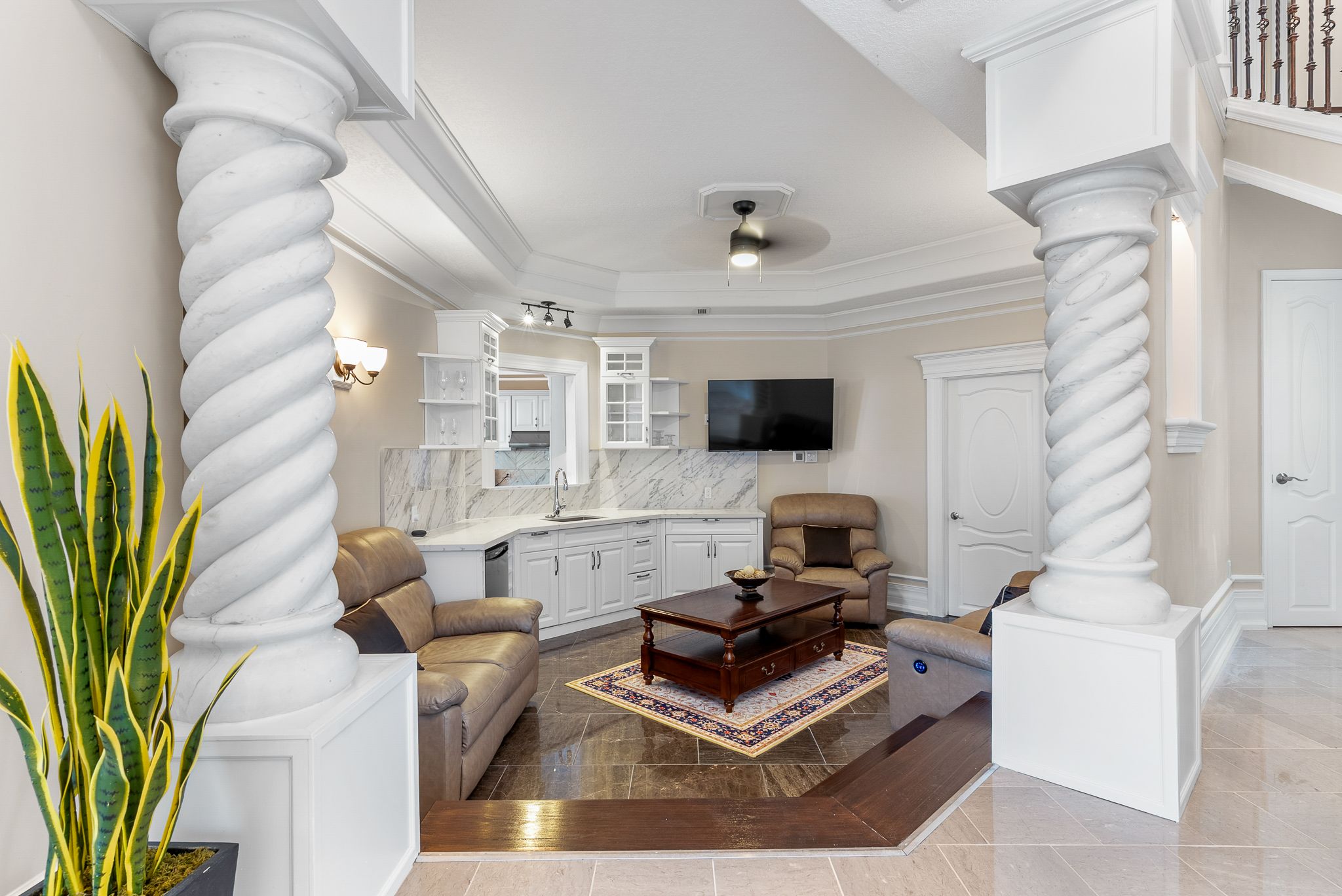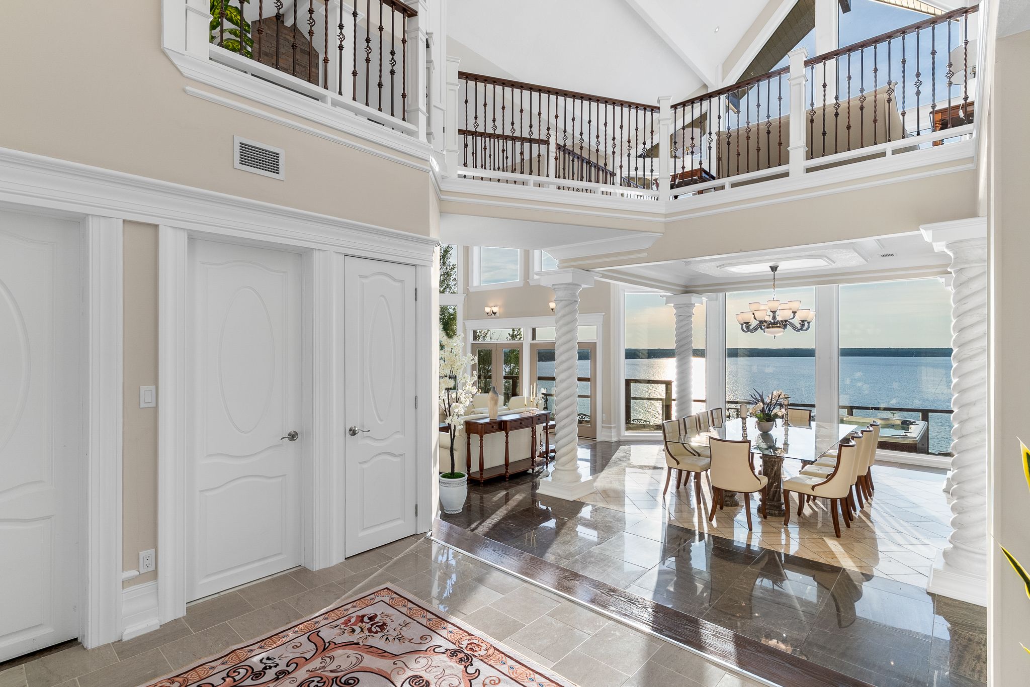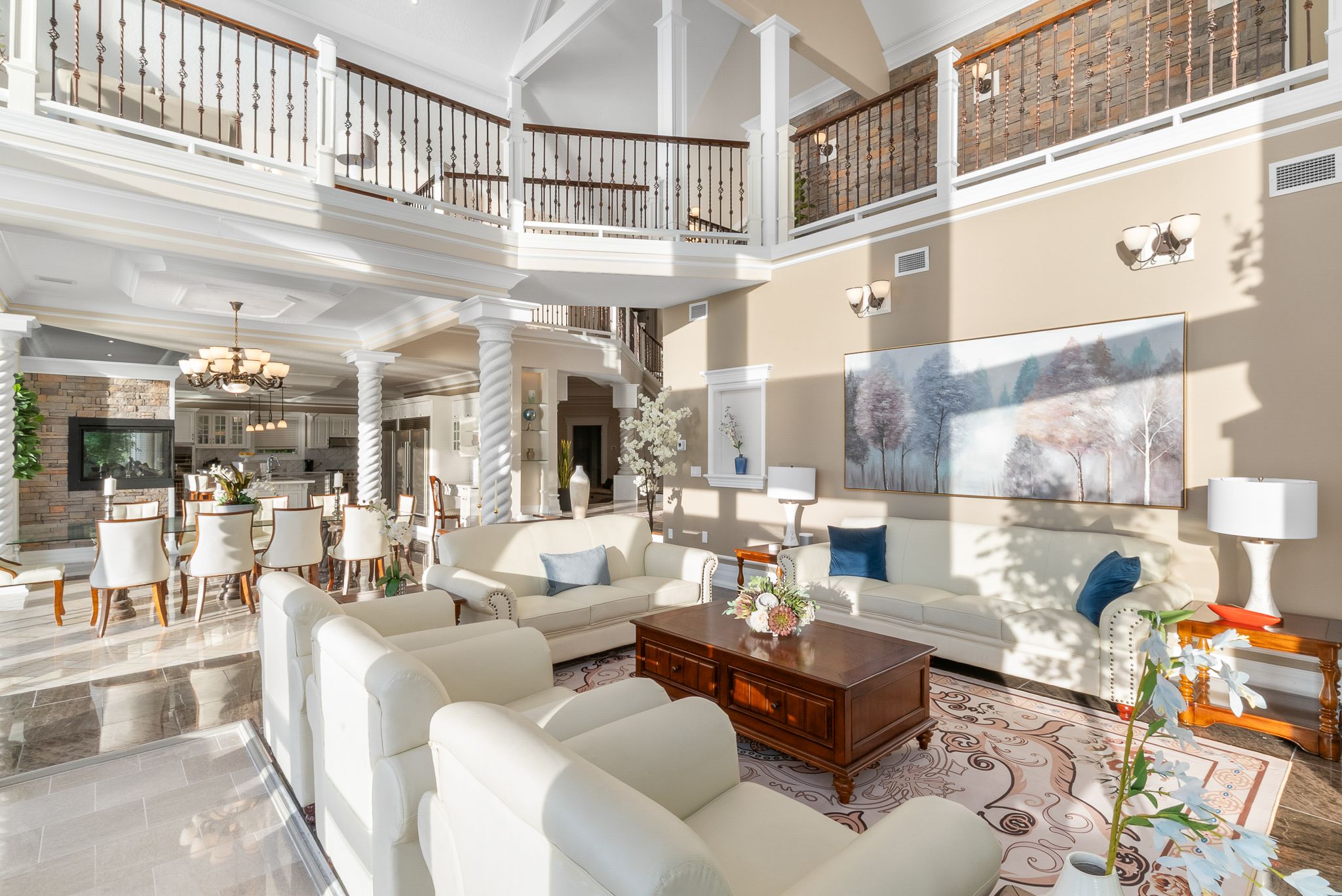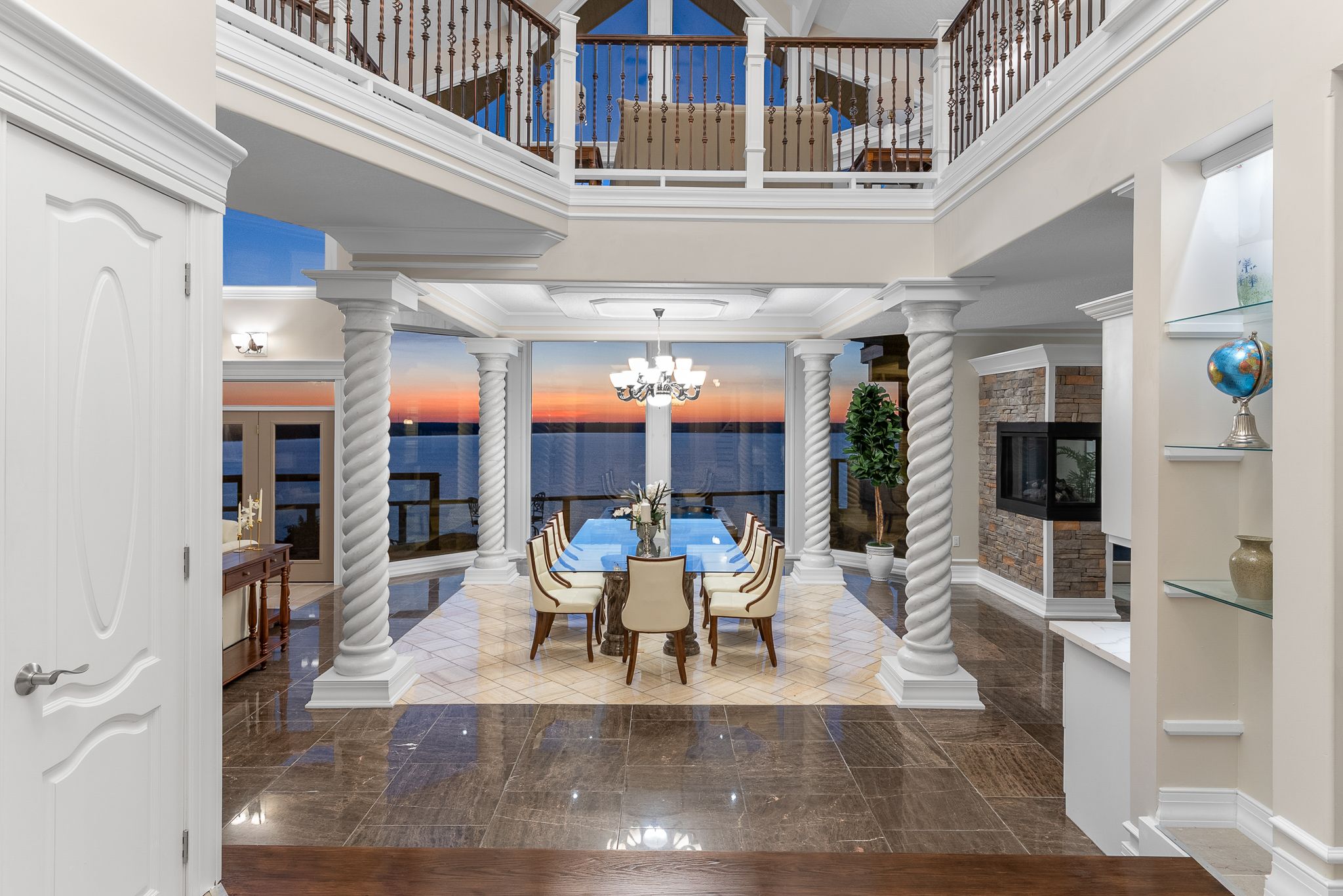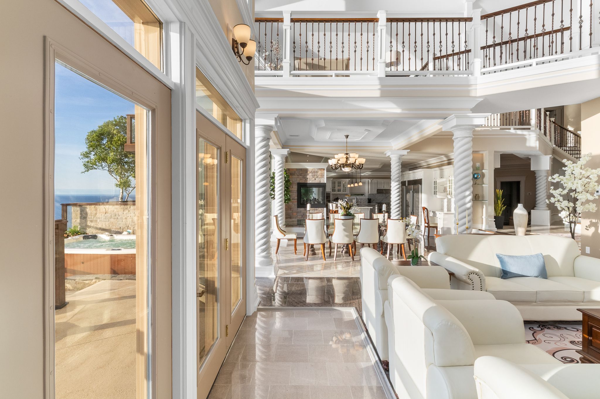 • Great room features 33-ft ceilings and elegant marble pillars.