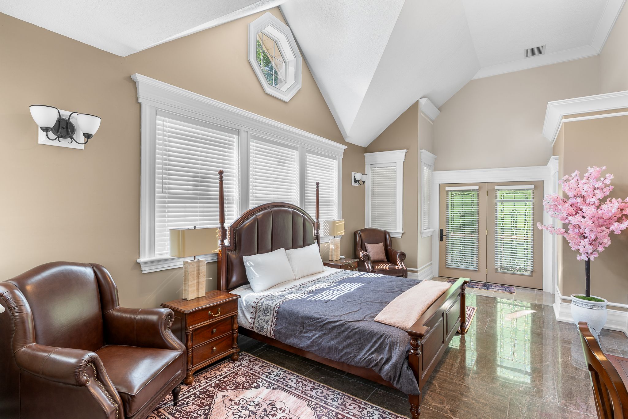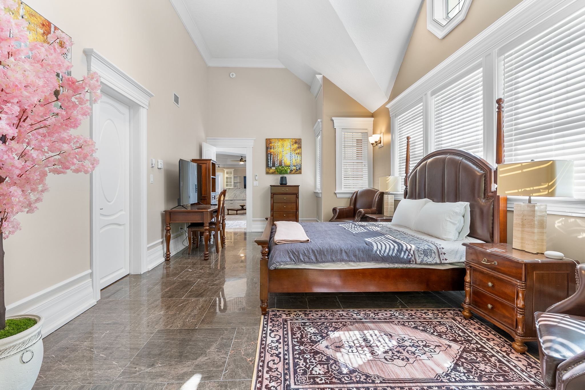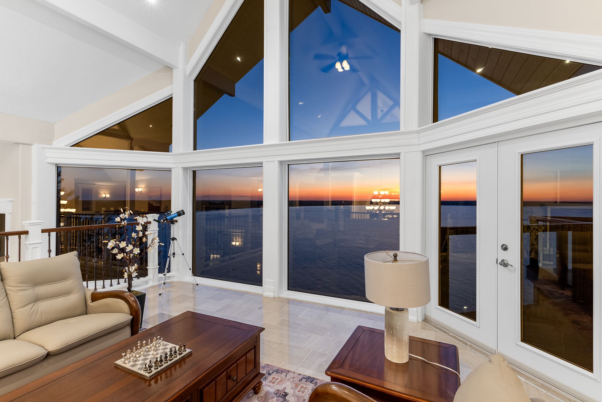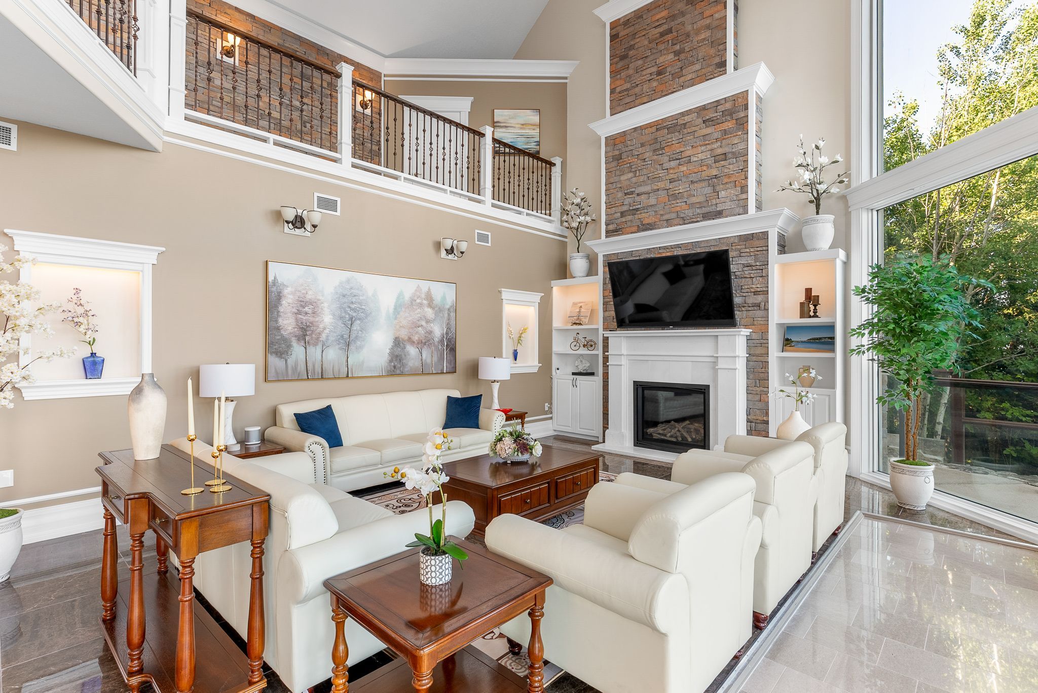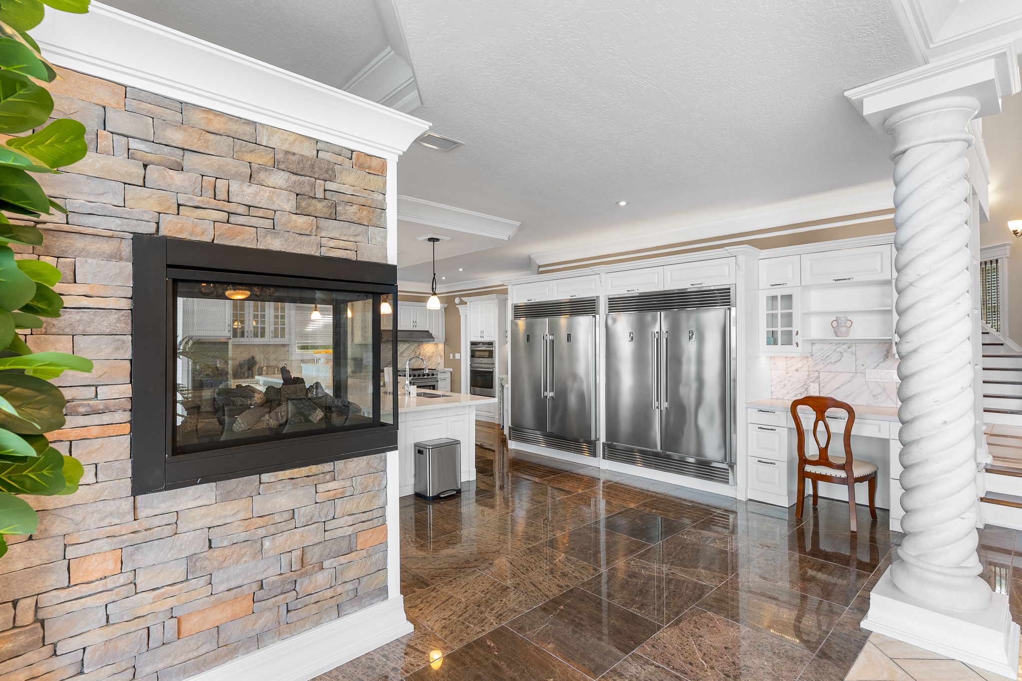 • Great room features 33-ft ceilings and elegant marble pillars.