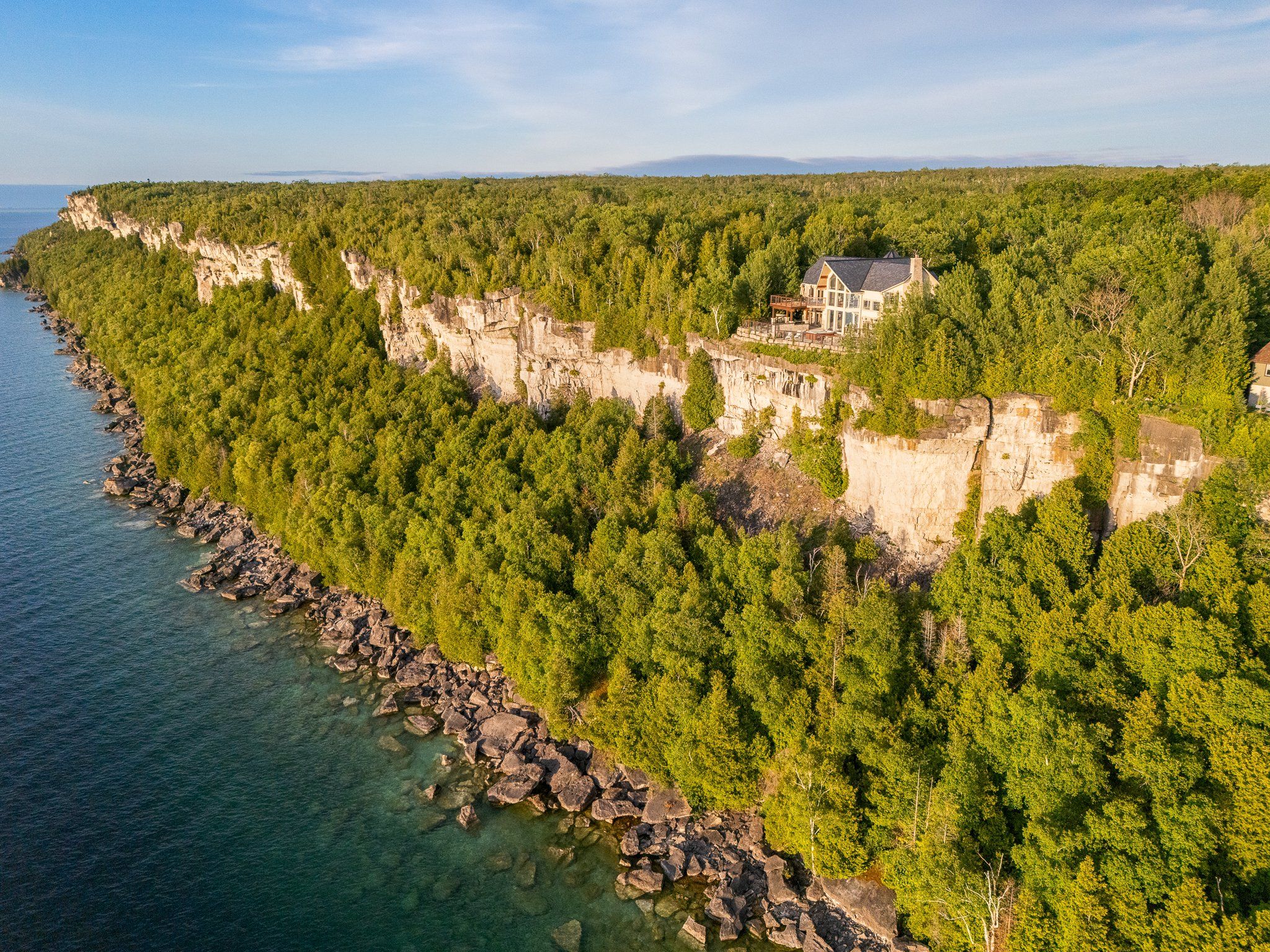 The peninsula perch is a 6,418 sq ft cliffside masterpiece perched 300 ft above the turquoise waters of georgian bay, offering nearly 4 km of uninterrupted northwest-facing views and world-class sunsets over whippoorwill bay. This architectural feat features r45 icf construction from foundation to trusses, topped with a timeless slate roof and a concrete driveway leading to a triple-car garage with heated floors and ev charger rough-in. Inside, the great room boasts soaring 33-ft ceilings anchored by solid marble pillars and a grand fireplace with a custom marble mantle, while the mezzanine sitting area and primary bedroom balcony offer a front-row seat to the escarpment. The professional chef's kitchen is equipped with a large island induction cooktop with a pop-up air vent, a walk-in pantry, four sub-zero fridge/freezer units, two dishwashers, and an ice maker. Designed for comfort and efficiency, the home features radiant heated floors throughout and the convenience of primary bedroom laundry. The outdoor living space is a maintenance-free oasis with a covered porch, large hot tub, and high-end astroturf grounds, all situated in a designated dark sky community just 30 minutes from the 5,000-ft runway at wiarton keppel international airport.