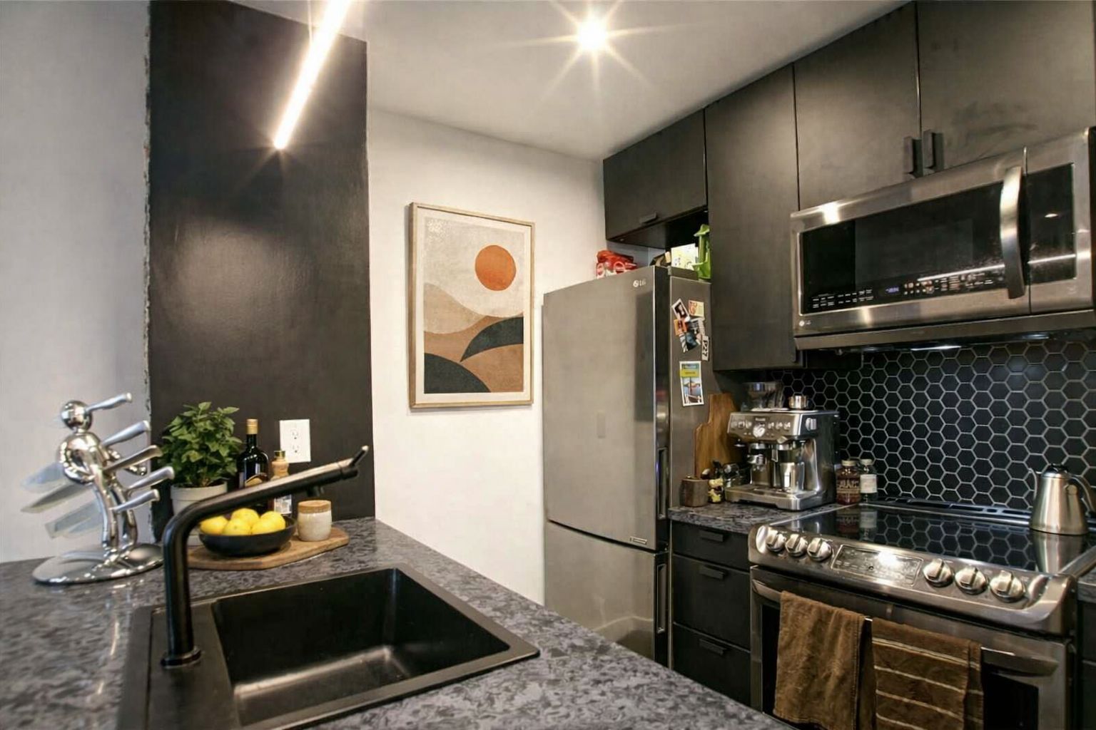 • Renovated kitchen with a beautiful stone waterfall island and modern appliances.