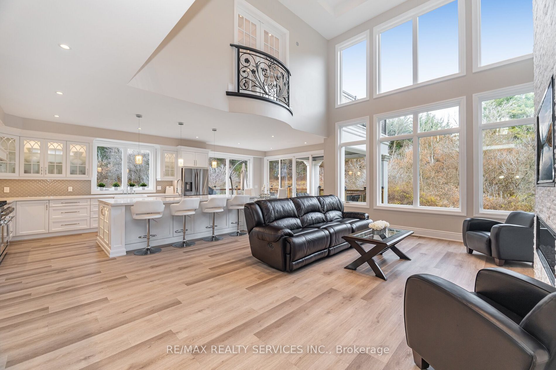 • Impressive family room with floor-to-ceiling windows and stone wall fireplace.