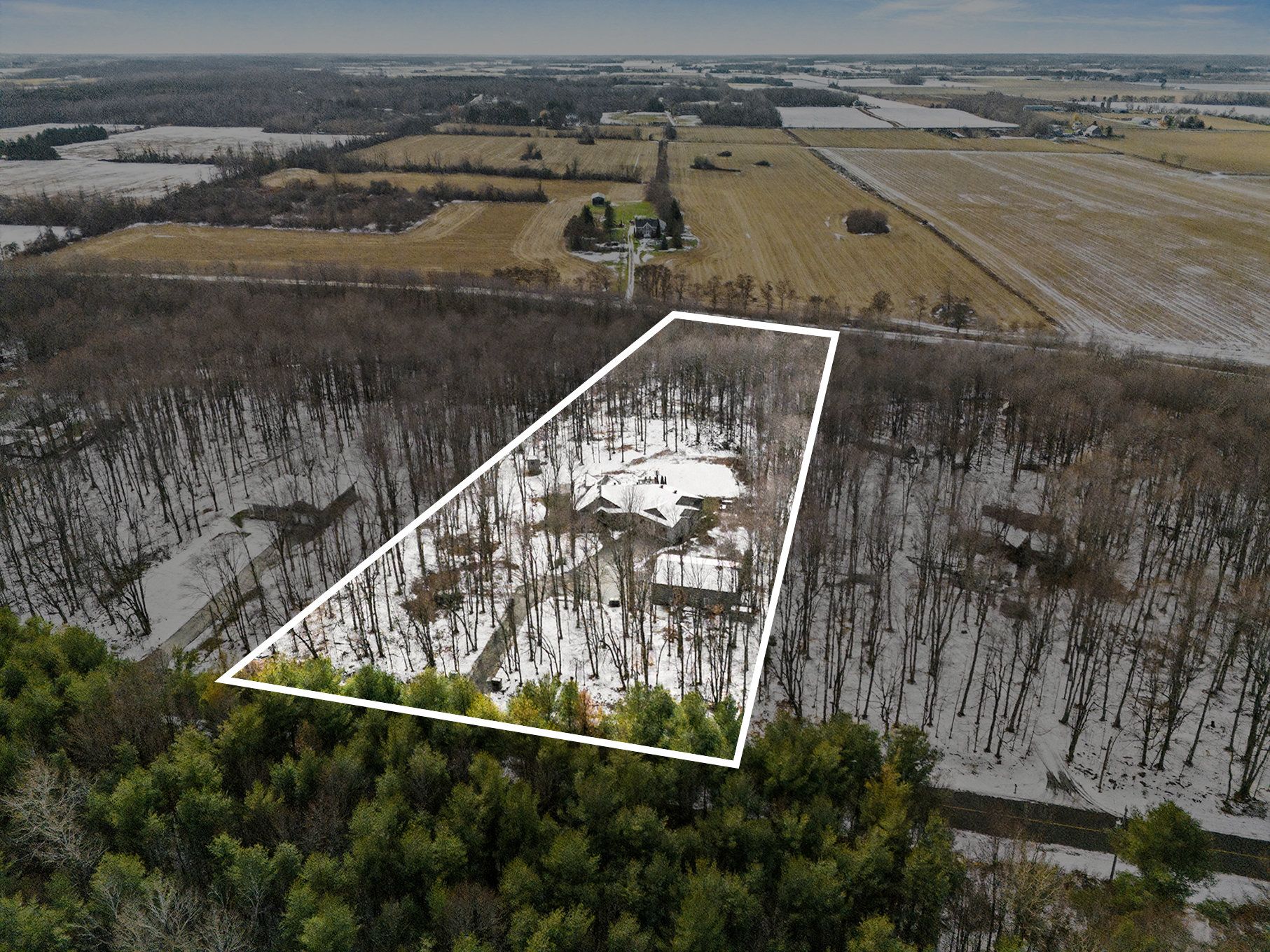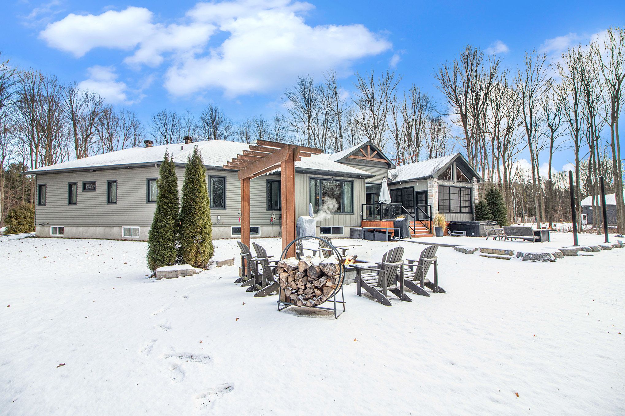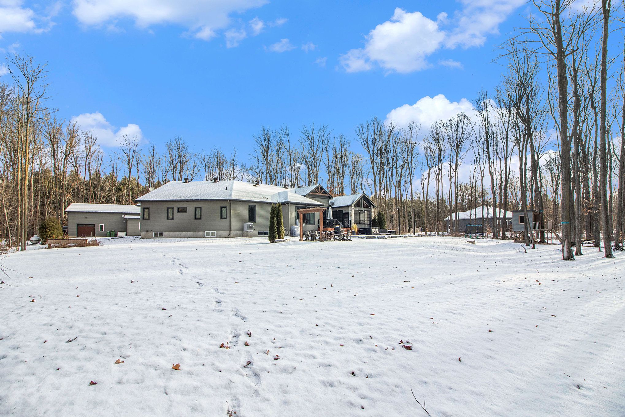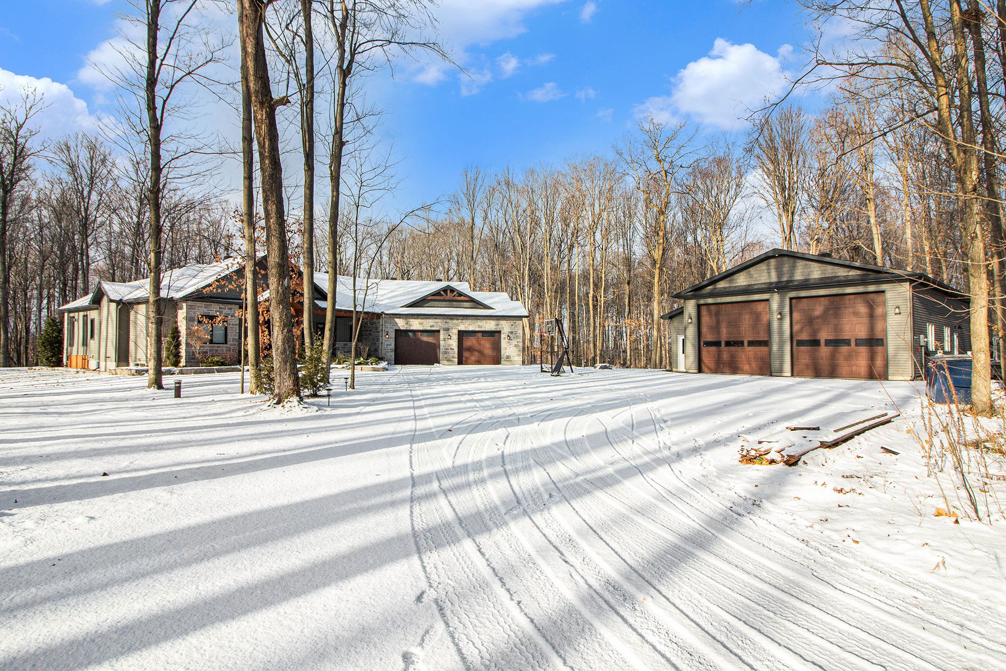 *open house saturday feb 7th 2026* prepare to discover the pinnacle of luxury country living in this breathtaking custom designer-built estate, perfectly poised on a premium, private treed lot just shy of four acres. Imagine waking up to mornings flooded with light, where the cathedral ceilings soar above elegant wood beam accents, setting the stage for unforgettable gatherings around the colossal 11-foot quartz island that anchors the open-concept gourmet kitchen, complete with a massive walk-in pantry and walls of fenestration framing serene outdoor views. The main floor offers a private sanctuary in the primary suite, boasting a walk-through closet, a highly upgraded ensuite with custom solid wood vanities and a large soaker tub, and direct access to a cozy, fireplace-warmed sunroom-your perfect year-round retreat. From the double attached garage, a large mudroom and main-floor laundry ensure family life stays organized, while two spacious children's bedrooms are connected by a high-end jack and jill washroom and a charming, flexible nook area, ideal as a reading retreat or homework station. The lower level is an entertainer's dream playground, featuring a sprawling bar area, a dedicated movie room for cinematic nights, and a generous kids' playroom beside it. Also on the lower level, a fourth bedroom, a fully equipped gym, and convenient walk-up garage access-perfectly accommodating multi-generational living. This dream is complete with an absolutely massive detached shop (32ft x 48ft) , featuring two large bays, a third side bay, and a loft, providing an incredible space for storing every toy and piece of equipment, cementing this home as the ultimate rural escape, truly overflowing with too many high-end, custom finishes to count. Don't miss out, book your private visit today!