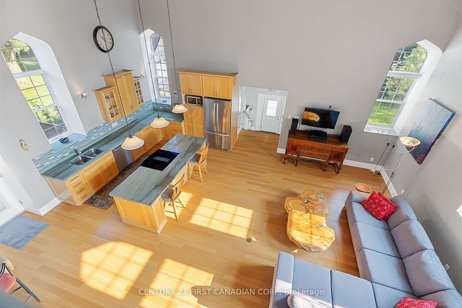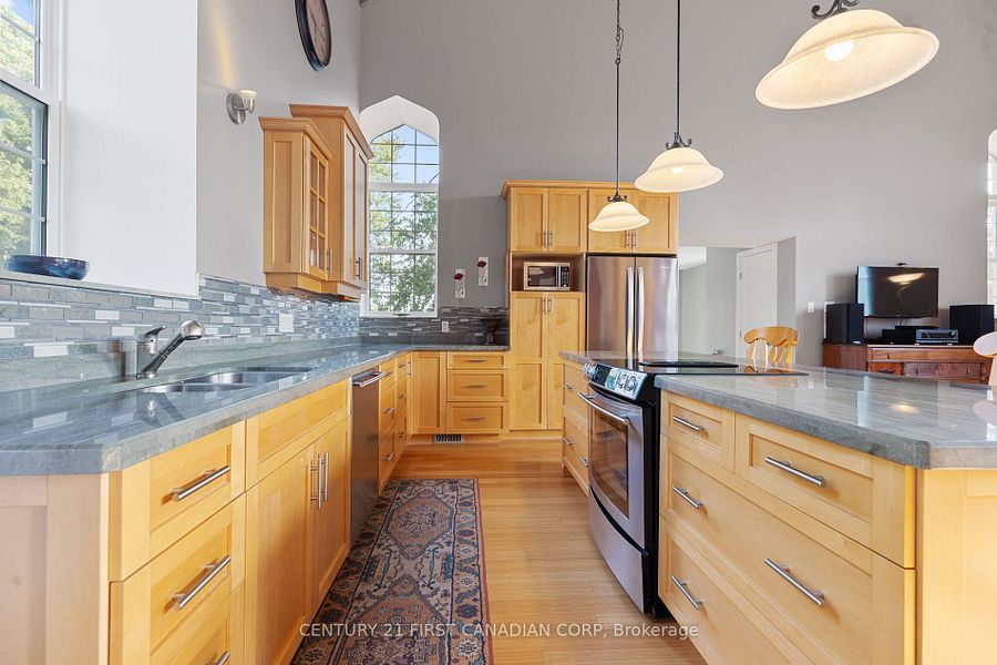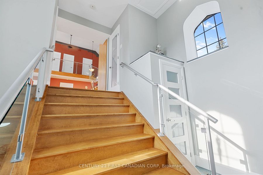 Imagine having the opportunity to immerse yourself in the rich history of an impeccably maintained and restored 1889 limestone schoolhouse in a quaint town outside of st. Marys. Surrounded by mature trees and hardly visible from the road is the former rannoch schoolhouse that helped educate hundreds of local children within its walls from 1889-1967. As you make your way inside you will be greeted with a large foyer with a wide staircase carrying you to the open concept main floor with bamboo flooring and soaring 20ft ceilings that have maintained the original rafter accents. The renovated kitchen offers granite countertops, tiled backsplash, and a pantry just outside of the kitchen. The kitchen overlooks the dining and living space and is perfect for entertaining and enjoying home cooked meals with family and friends. The main floor also features the primary bedroom with a walk in closet and luxurious primary ensuite bathroom and a separate powder room off the main living space. The beautiful maple hardwood staircase with glass railings brings you to two more spacious bedrooms in the upstairs loft with 10ft high ceilings and a full 3 piece bathroom separating the two bedrooms. The gorgeous 8ft tempered glass windows have deep marble window sills and offer an abundance of natural light through all directions, you can even watch the sun rise and set all from inside your home. This is not your usual conversion of a heritage rich property, where often they lack sufficient usable space required for the modern day single family dwelling. This home has the character and beautiful architecture of a 1889 schoolhouse with tasteful modern day finishes that exemplify its beauty. There is also a large full basement with plenty of natural light pouring through the large above grade windows, a fourth bedroom, living space and laundry room. Outside there is an oversized 2 car garage (24ft x 26. 5ft) built in 2008 with an upstairs loft for the perfect man cave, and 100amp service!