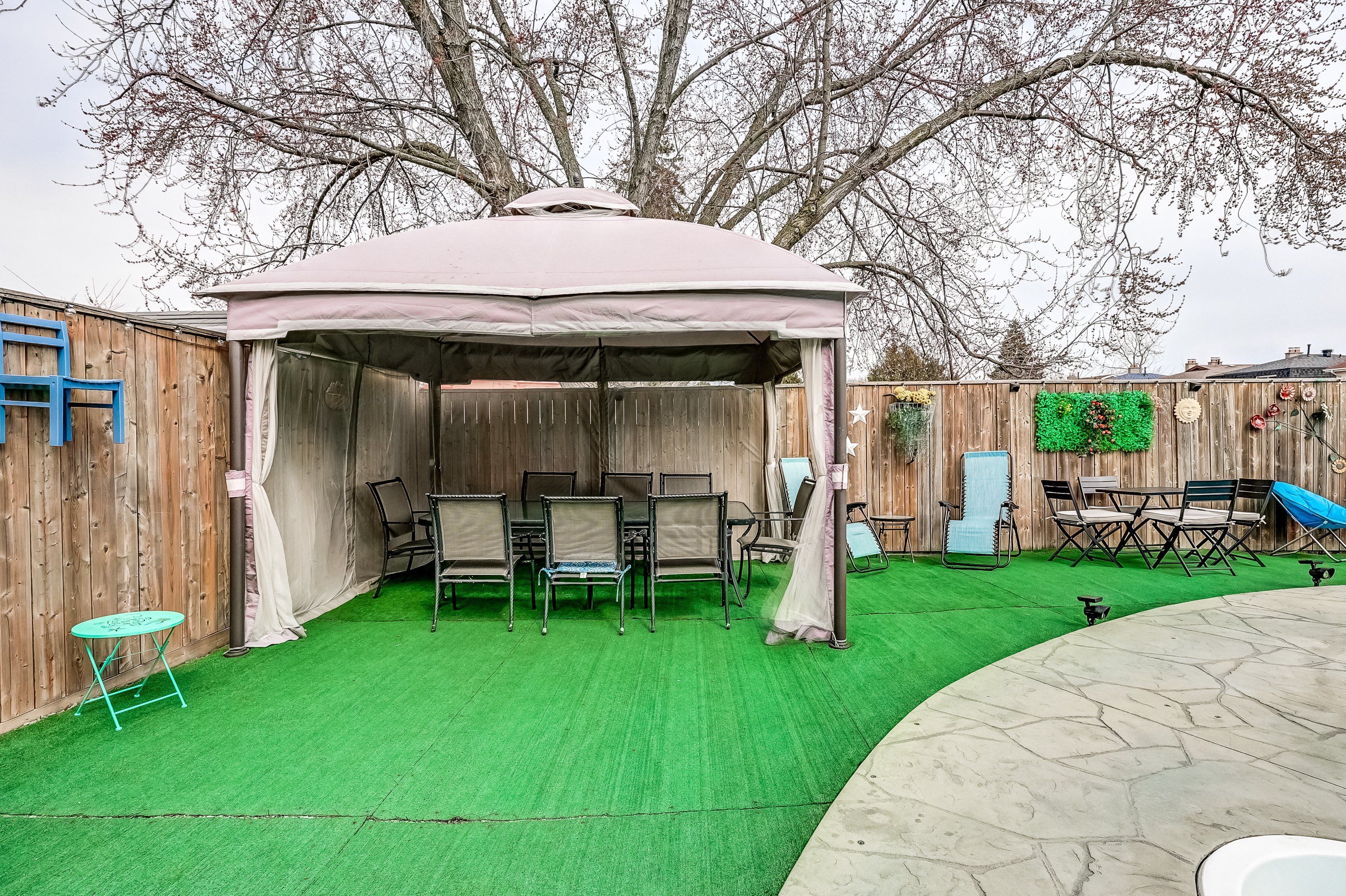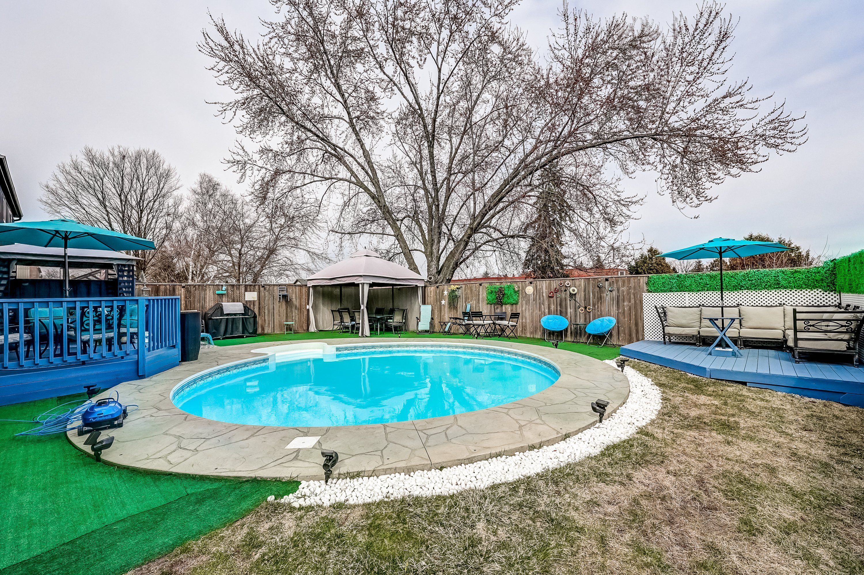 • Backyard oasis includes inground pool, multiple decks, and a gazebo.