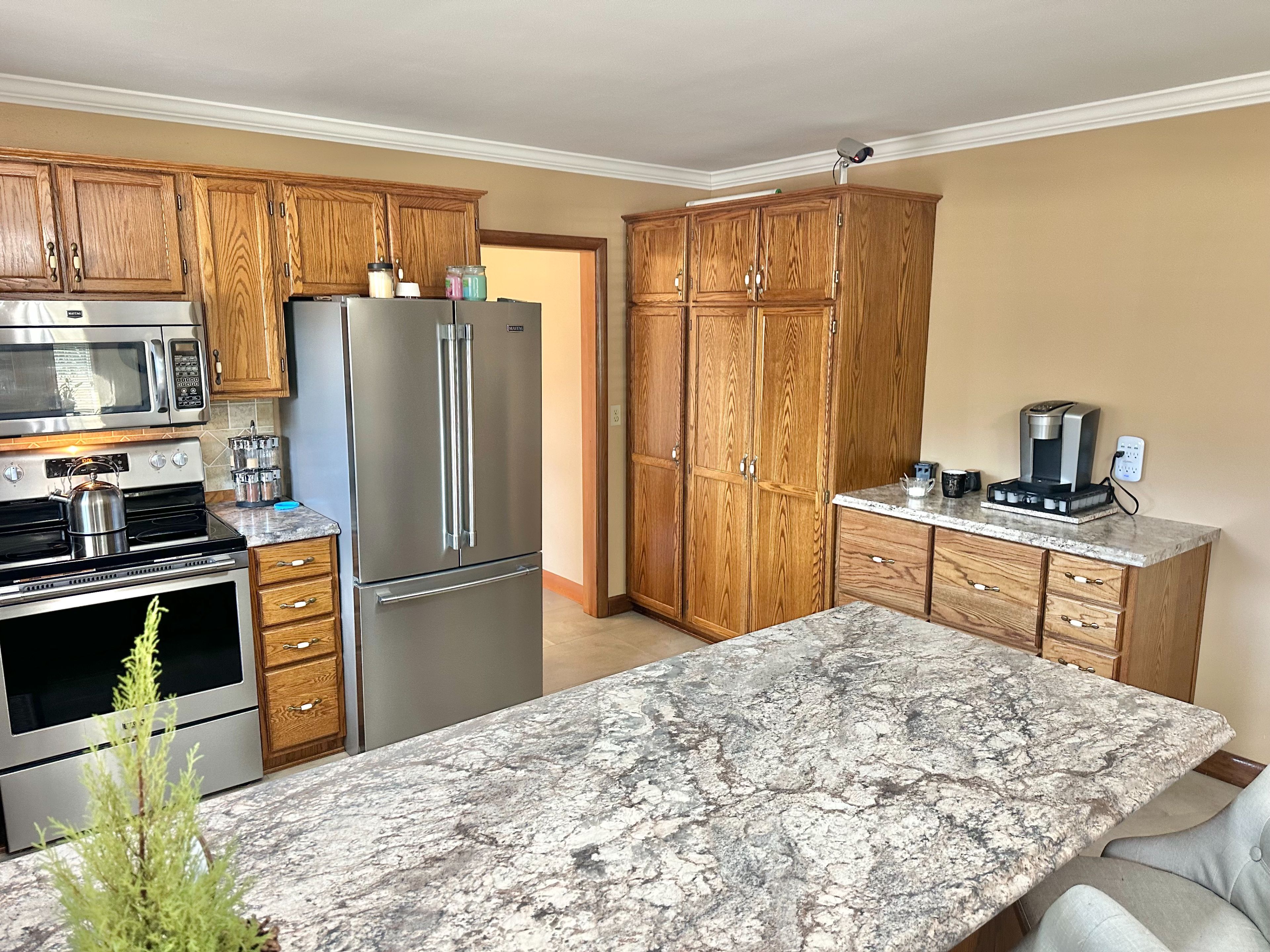 • Bright eat-in kitchen with stainless steel appliances and convenient pantry.