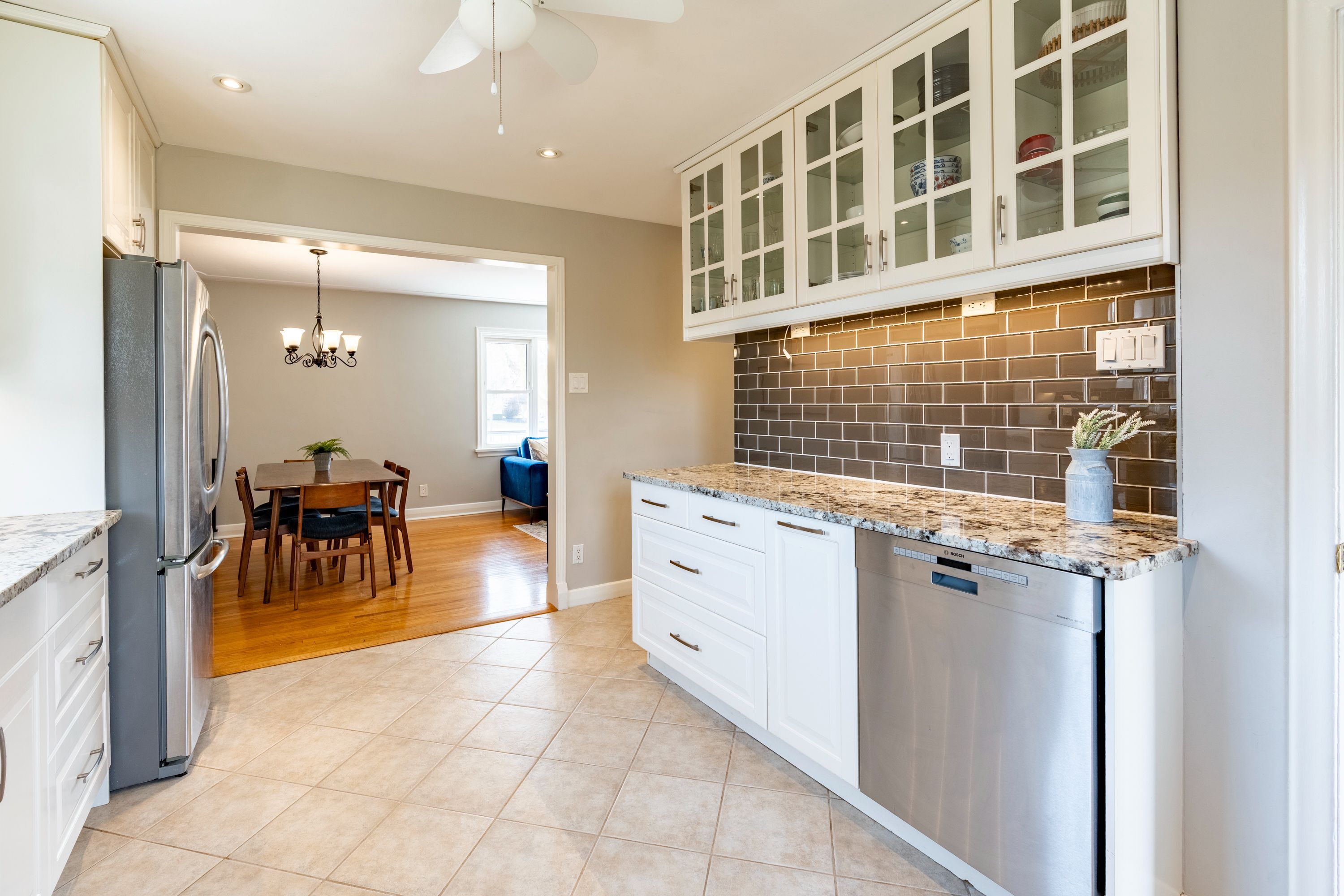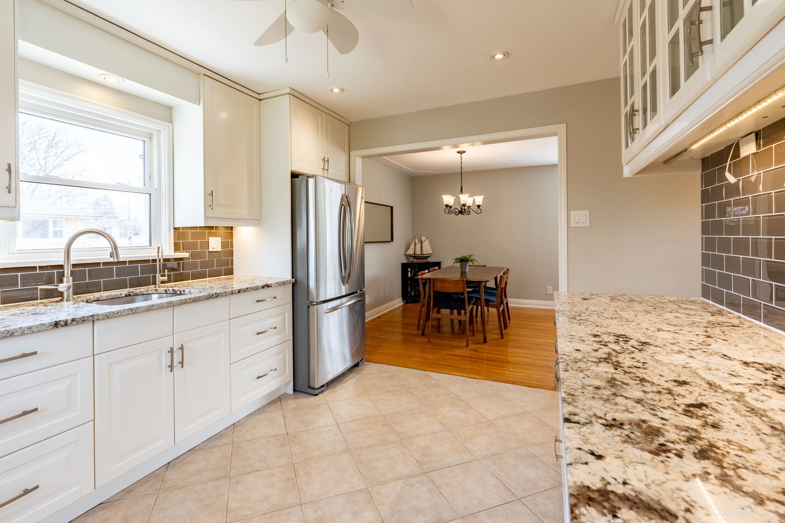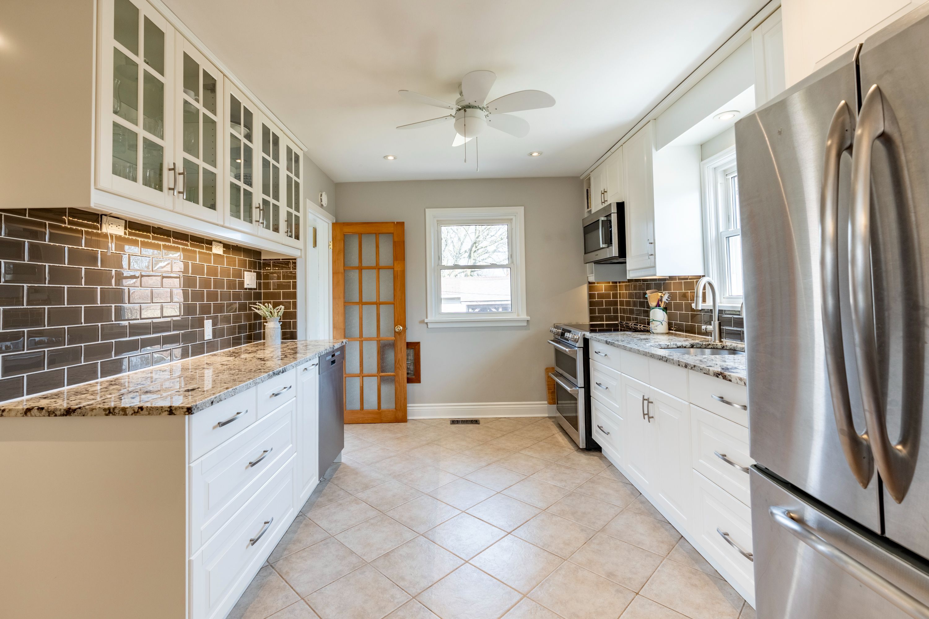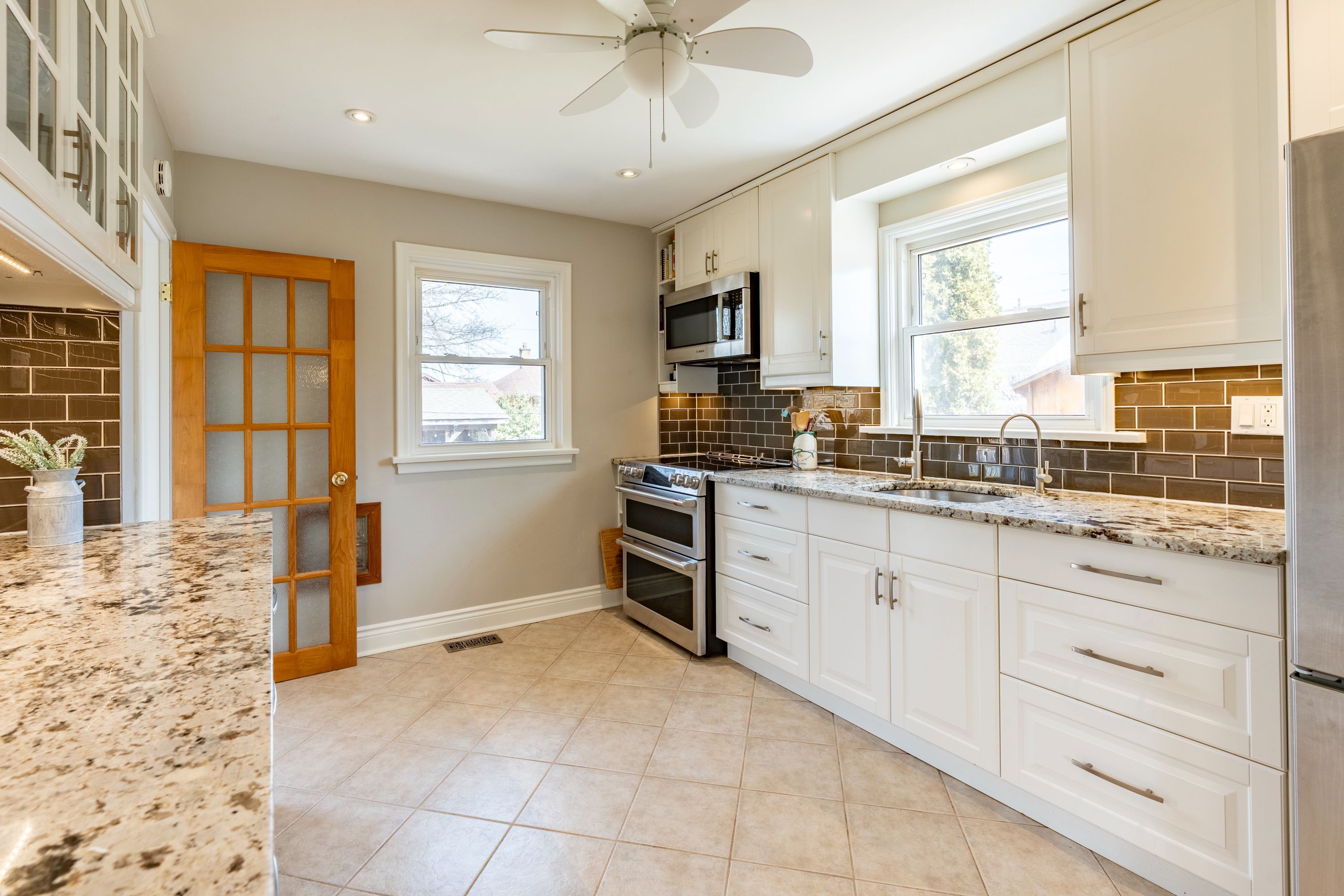 • Elegant kitchen with quartz countertops and stainless steel appliances.