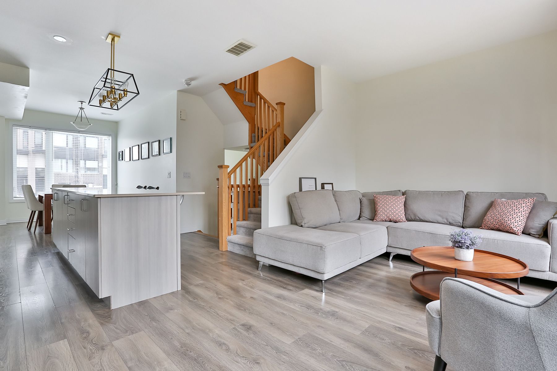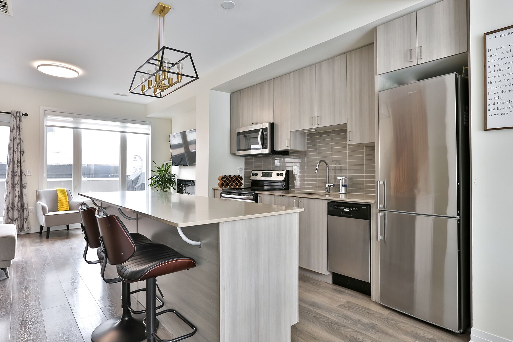 • Bright open-concept living area with an upgraded kitchen and cozy gas fireplace.
