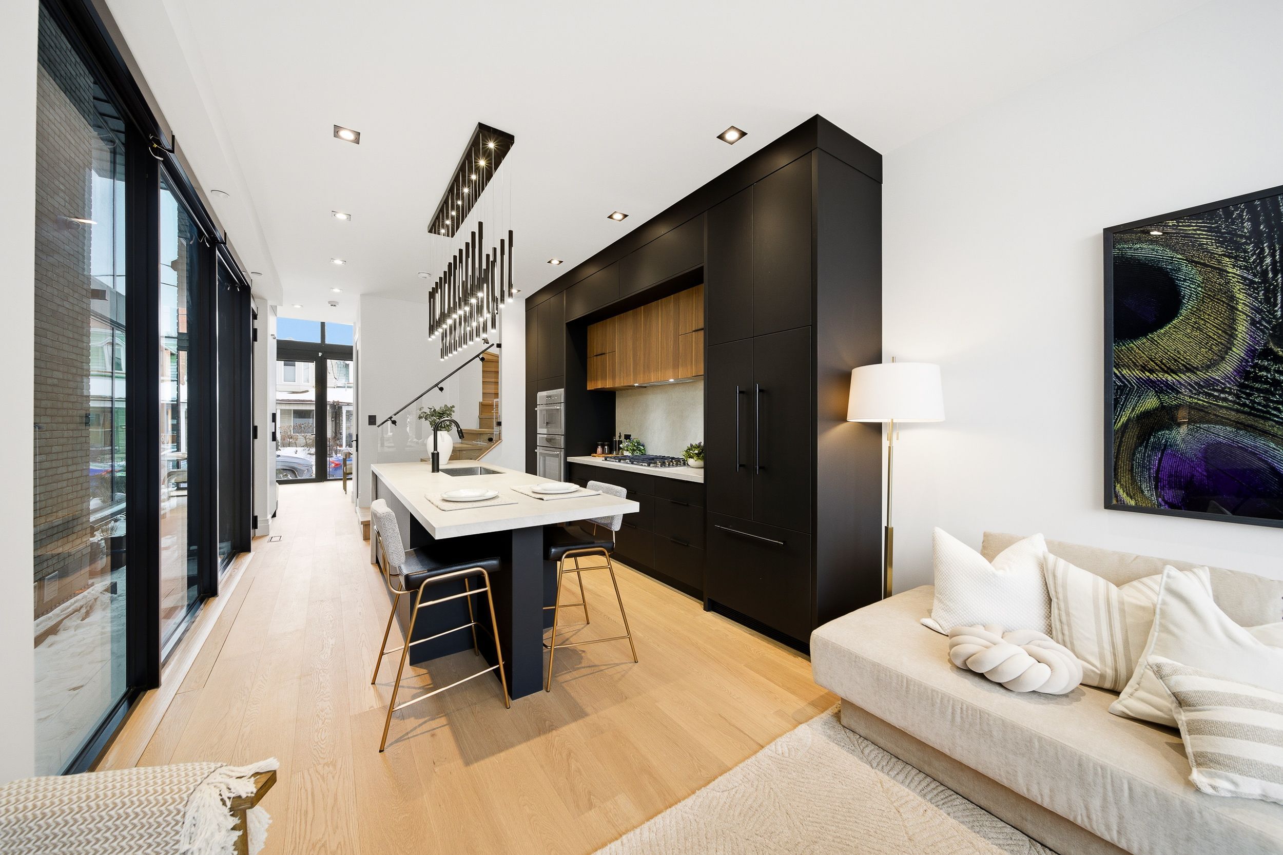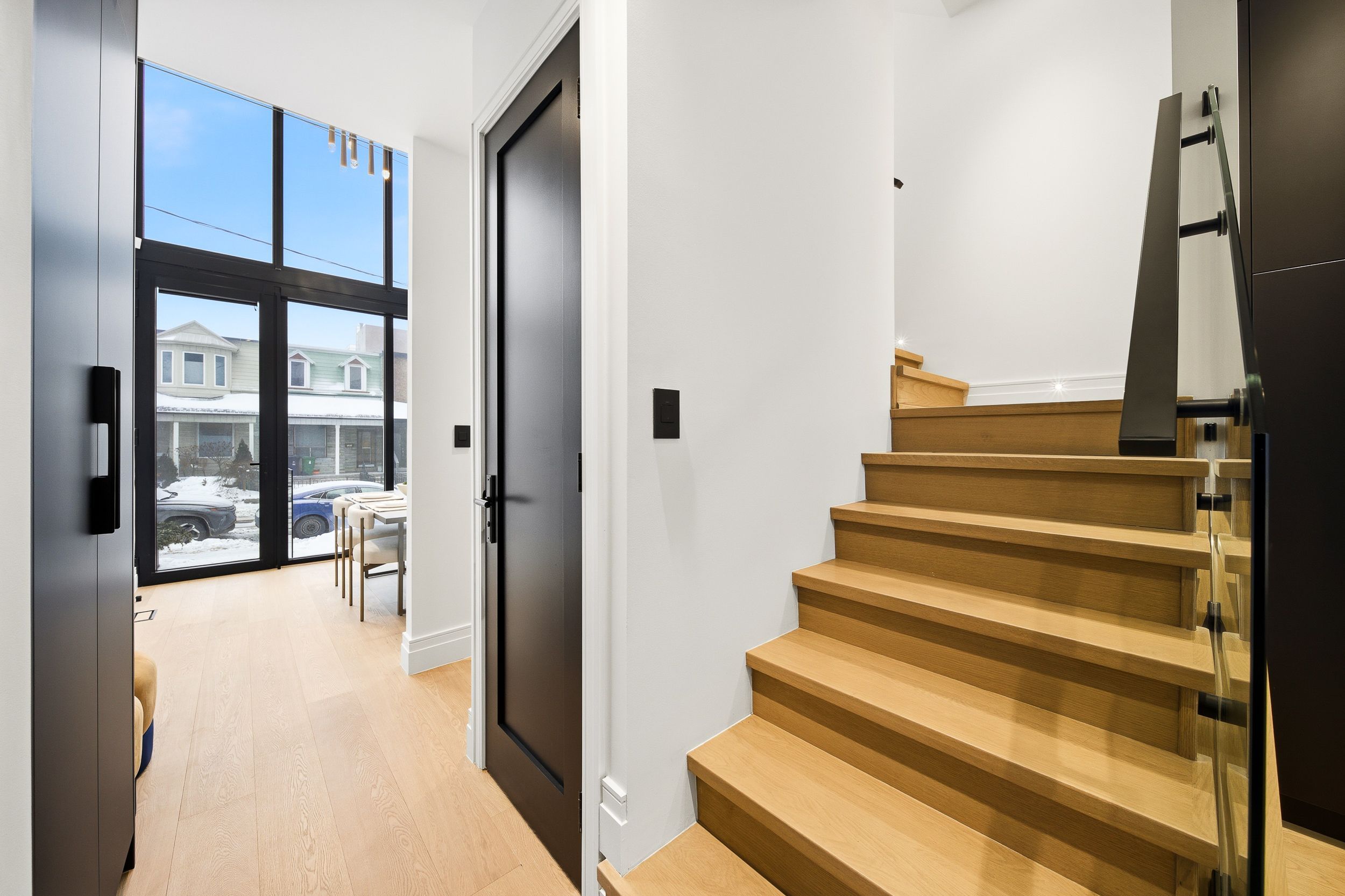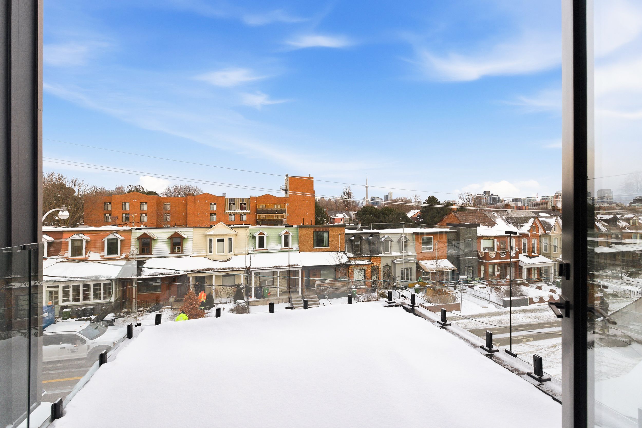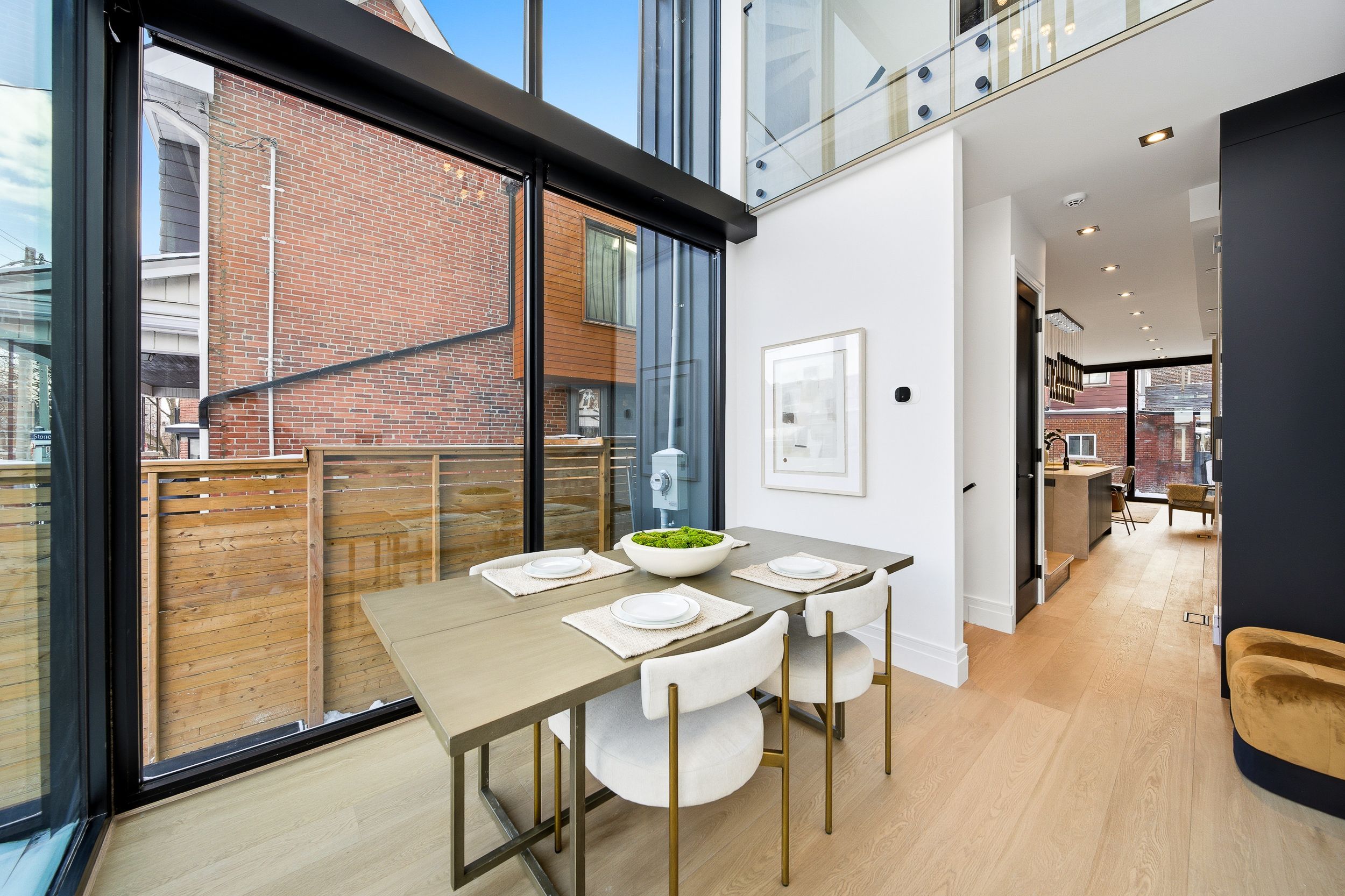 Discover this brand new, custom-built modern home with striking architectural presence, showcasing soaring ceiling heights, walls of glass, and refined detailing throughout. The main level is anchored by an impressive double-height dining area defined by 19-foot ceilings and floor-to-ceiling window walls on two sides. With east and west exposures, natural light pours through the interior from morning to evening. The kitchen features extensive custom cabinetry, taj mahal-inspired porcelain stone surfaces, and a premium integrated appliance package. The adjacent living area features a striking three-sided glass fireplace. A convenient side entrance provides direct access to the kitchen and front closet, offering functional everyday entry into the home. The upper levels continue the home's emphasis on thoughtful design, offering well-proportioned bedroom spaces, custom closets, and beautifully finished bathrooms. The full-floor primary retreat occupies its own level, featuring 11. 6-foot ceilings, and a spa-inspired ensuite with a freestanding tub, double vanity, and walk-in shower, along with extensive custom built-in storage and a built-in coffee bar with integrated beverage fridge, extending directly to a rooftop terrace with cn tower views. The lower level offers impressive ceiling height and a highly functional layout, featuring vinyl flooring throughout, a laundry area with built-in cabinetry, an additional bedroom idea for guests, a home office, or extended living space, and a three-piece bathroom. Additional features include white oak engineered flooring throughout the main and upper levels, reynaers architectural aluminum windows and doors, automated window coverings, and curated designer lighting. Fully landscaped front and rear yards complete the property, featuring turf, steel planters for a polished, low-maintenance outdoor experience. Ideally located in toronto's west end, close to neighbourhood cafes, shops, transit, and everyday conveniences.
