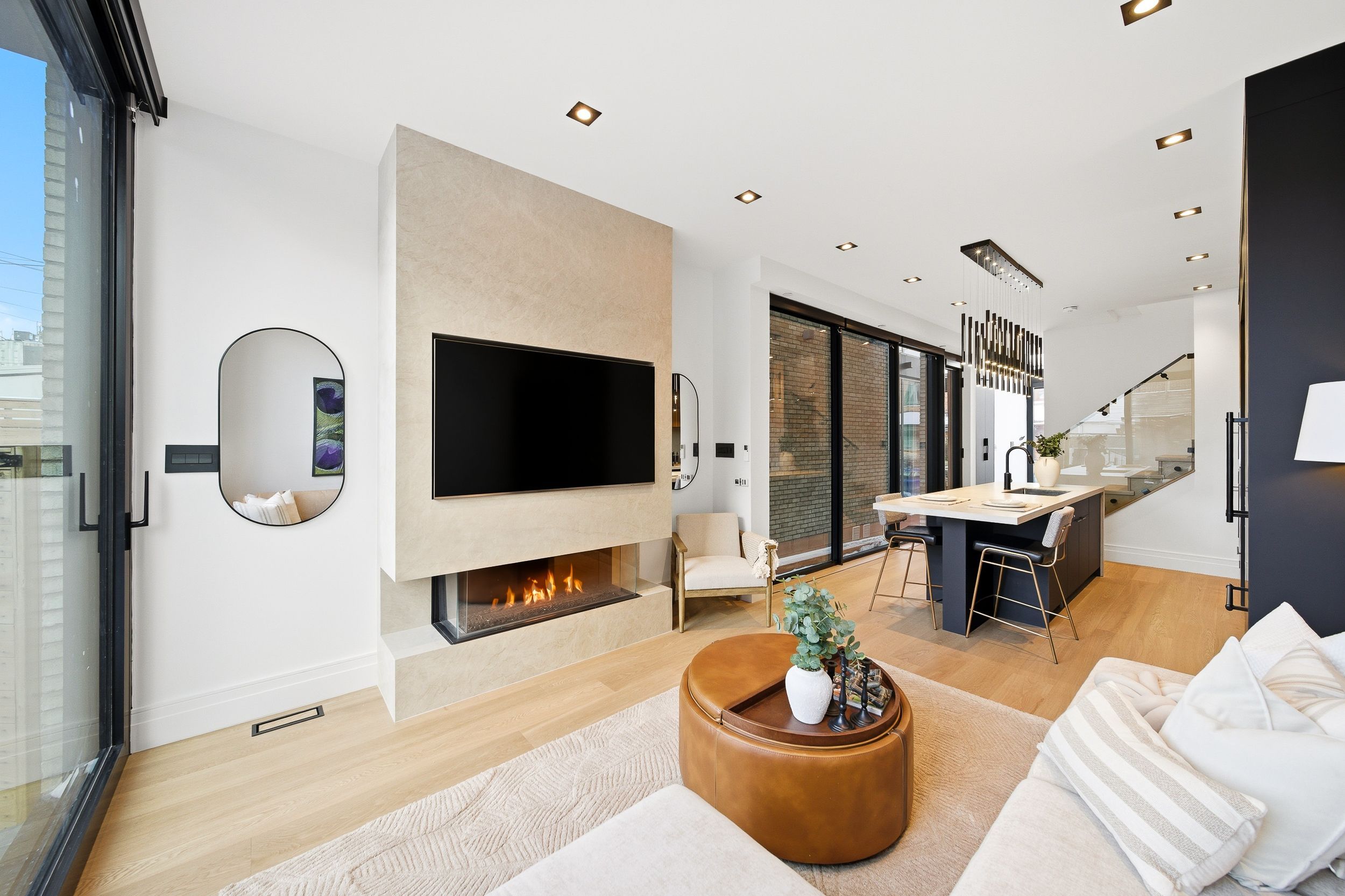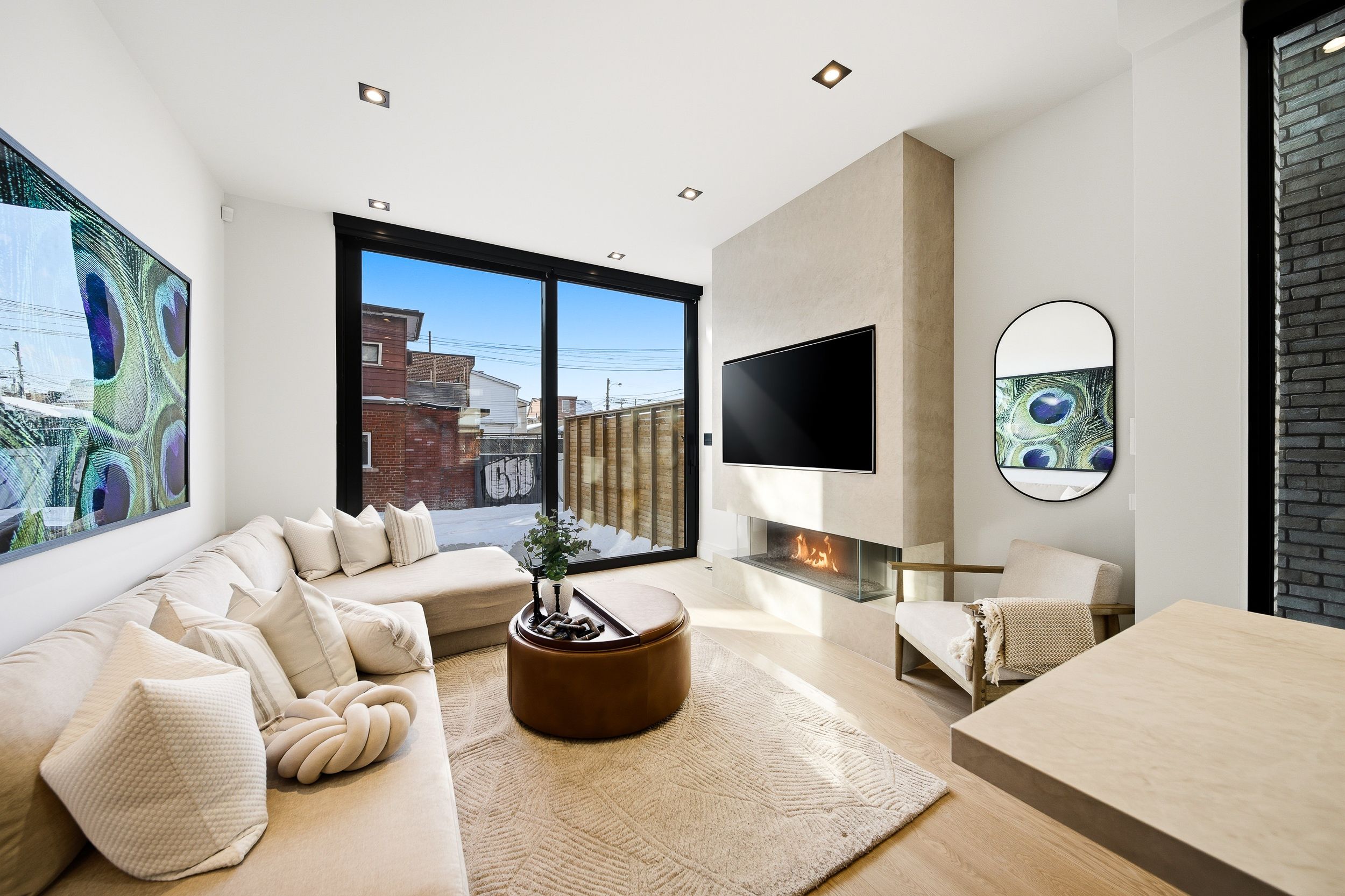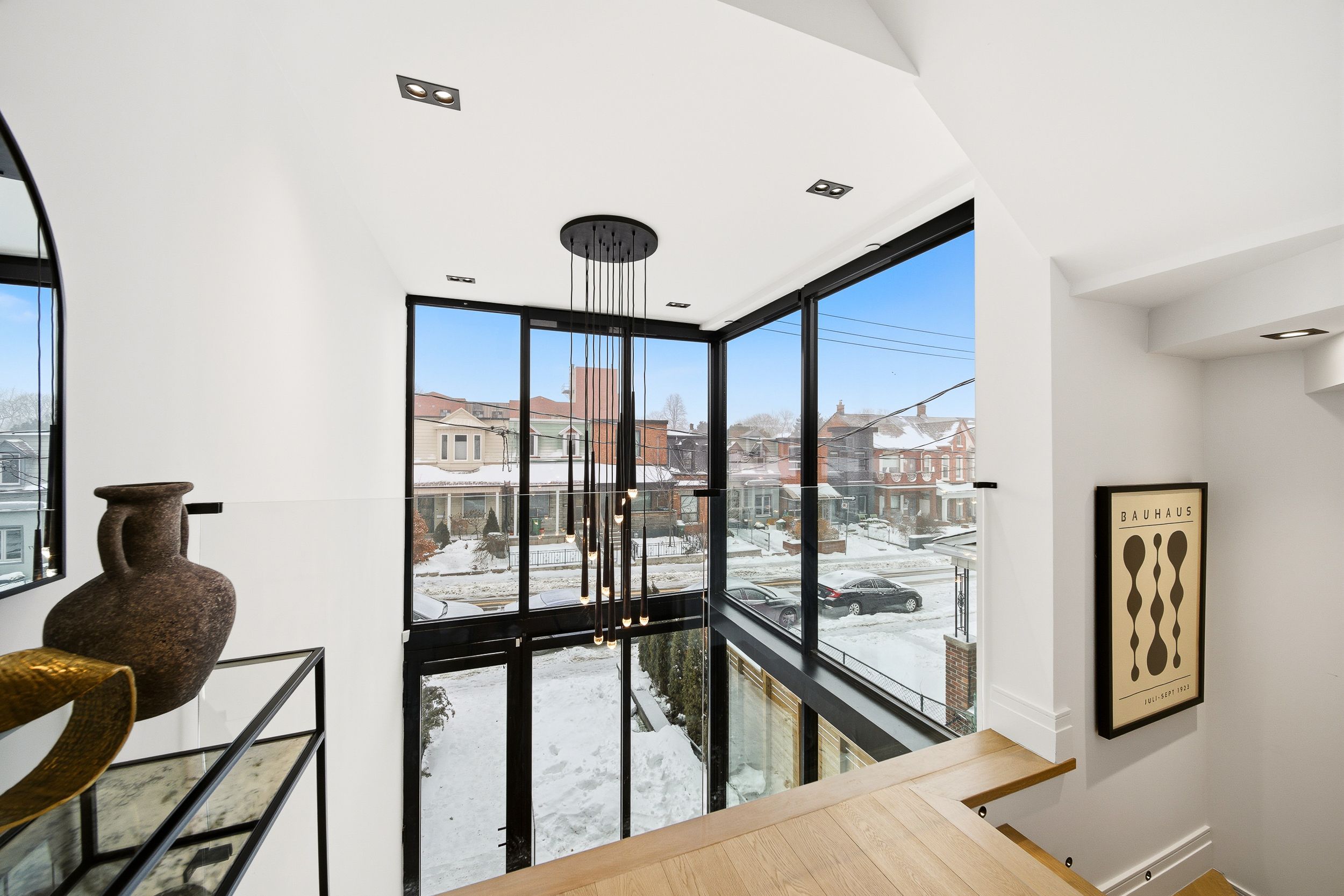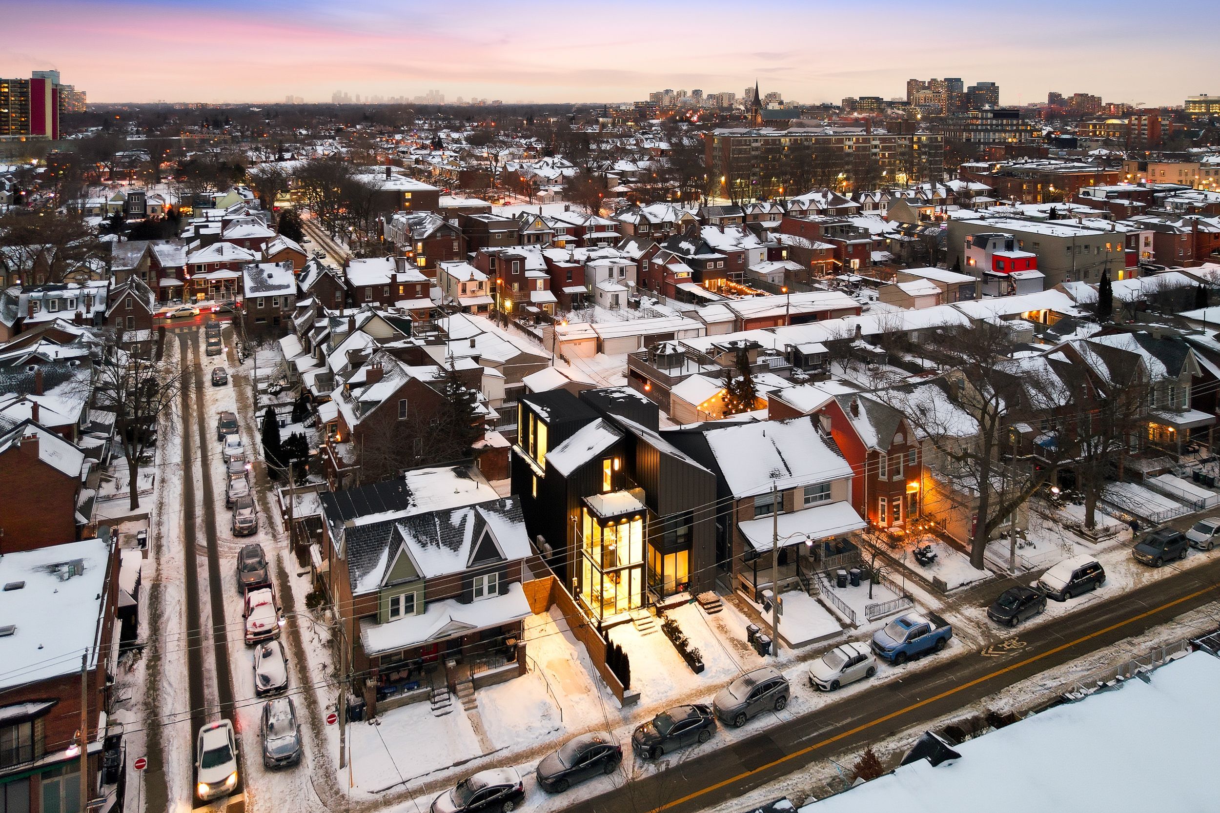 Discover this brand new, custom-built modern home with striking architectural presence, showcasing soaring ceiling heights, walls of glass, and refined detailing throughout. The main level is anchored by an impressive double-height dining area defined by 19-foot ceilings and floor-to-ceiling window walls on two sides. With east and west exposures, natural light pours through the interior from morning to evening. The kitchen features extensive custom cabinetry, taj mahal-inspired porcelain stone surfaces, and a premium integrated appliance package. The adjacent living area features a striking three-sided glass fireplace. A convenient side entrance provides direct access to the kitchen and front closet, offering functional everyday entry into the home. The upper levels continue the home's emphasis on thoughtful design, offering well-proportioned bedroom spaces, custom closets, and beautifully finished bathrooms. The full-floor primary retreat occupies its own level, featuring 11. 6-foot ceilings, and a spa-inspired ensuite with a freestanding tub, double vanity, and walk-in shower, along with extensive custom built-in storage and a built-in coffee bar with integrated beverage fridge, extending directly to a rooftop terrace with cn tower views. The lower level offers impressive ceiling height and a highly functional layout, featuring vinyl flooring throughout, a laundry area with built-in cabinetry, an additional bedroom idea for guests, a home office, or extended living space, and a three-piece bathroom. Additional features include white oak engineered flooring throughout the main and upper levels, reynaers architectural aluminum windows and doors, automated window coverings, and curated designer lighting. Fully landscaped front and rear yards complete the property, featuring turf, steel planters for a polished, low-maintenance outdoor experience. Ideally located in toronto's west end, close to neighbourhood cafes, shops, transit, and everyday conveniences.